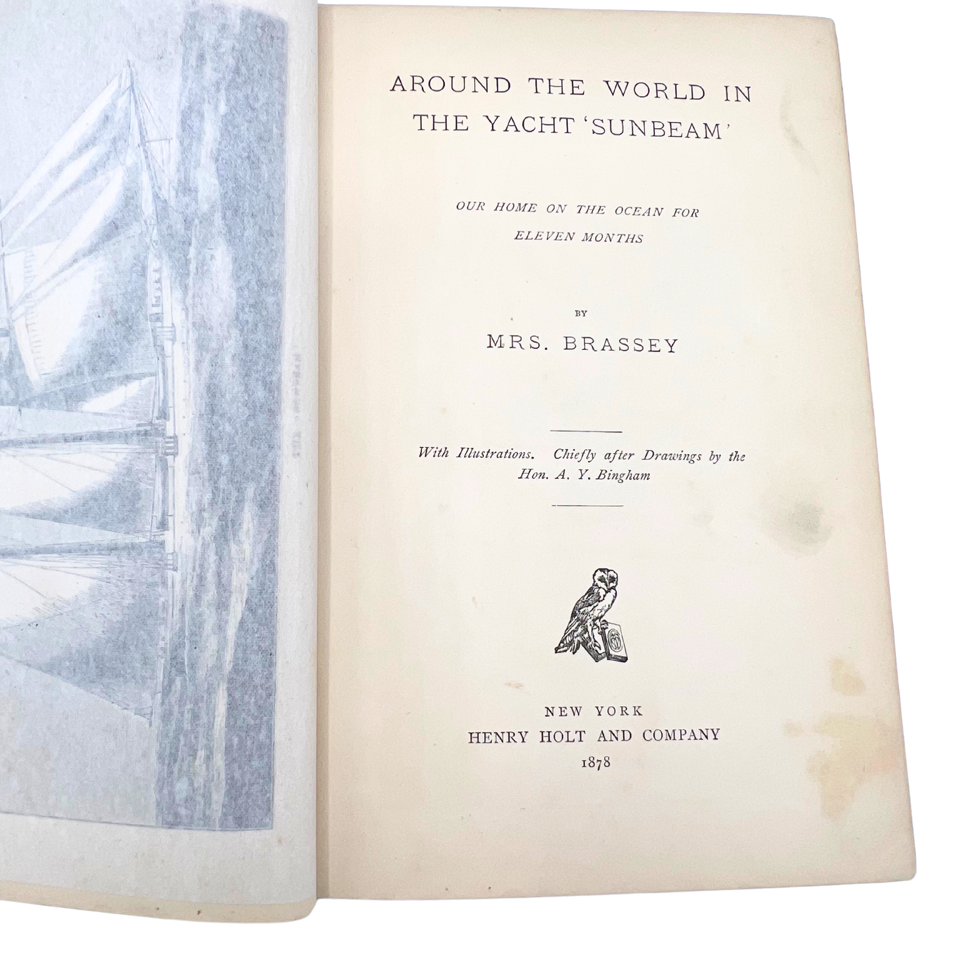 Around the World in the Yacht Sunbeam by Mrs. Brassey. Great antique book about the world travels of a yacht in the 1800s. Published 1878 - good condition considering age. Gilt lettering on cover. Approximately 8.75" x 6".