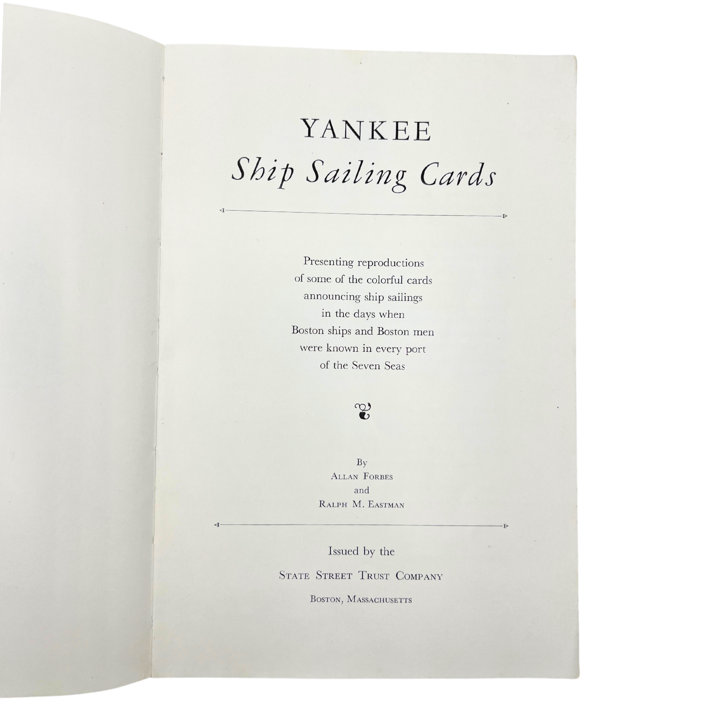Yankee Sailing Ship Cards. Charming book/booklet from 1948 issued by The State Street Trust Company in Boston. The booklet is a collection of images of the colorful announcements of ship sailings. Rare find. Measures 9" x 6".