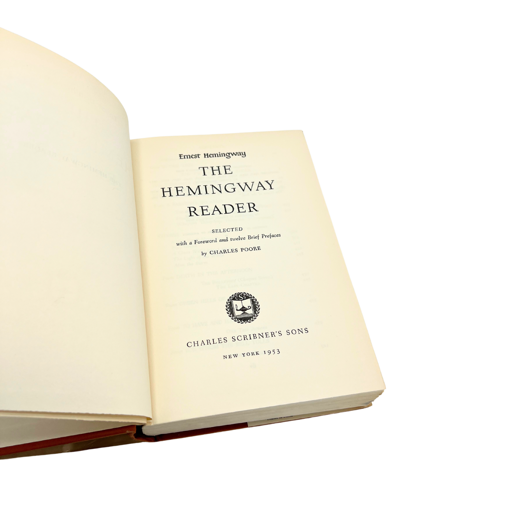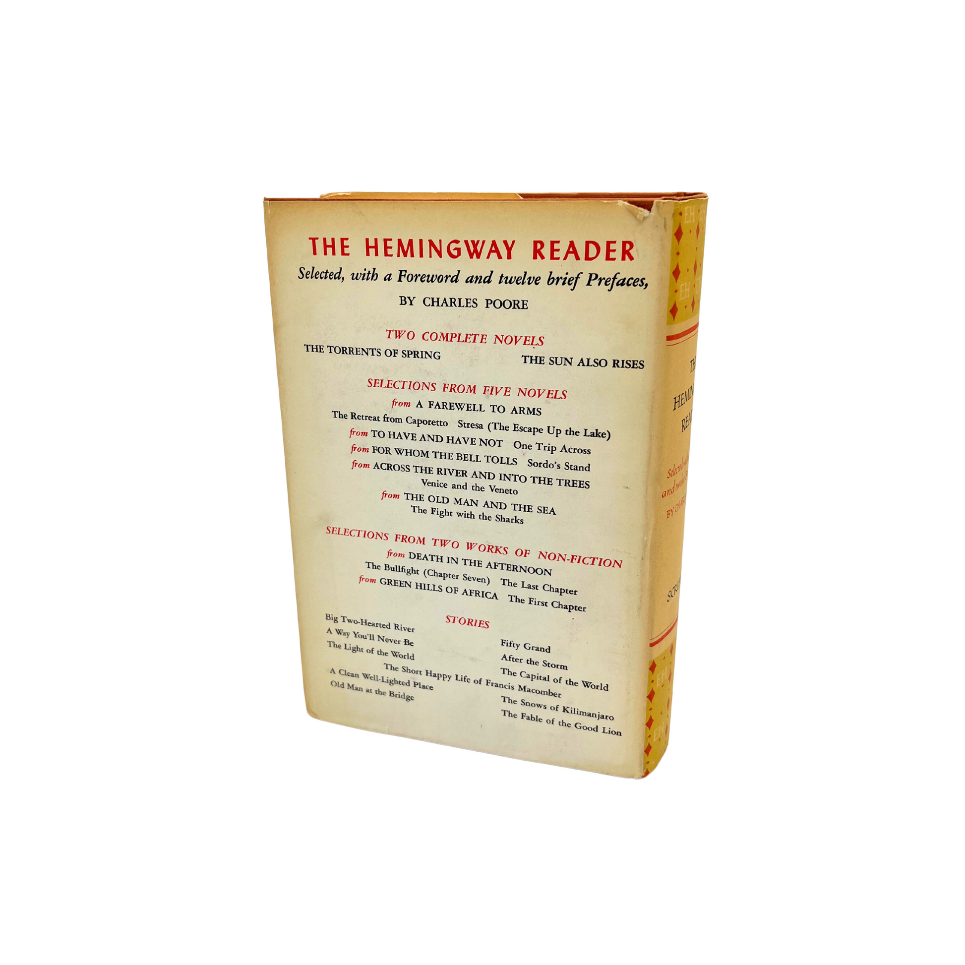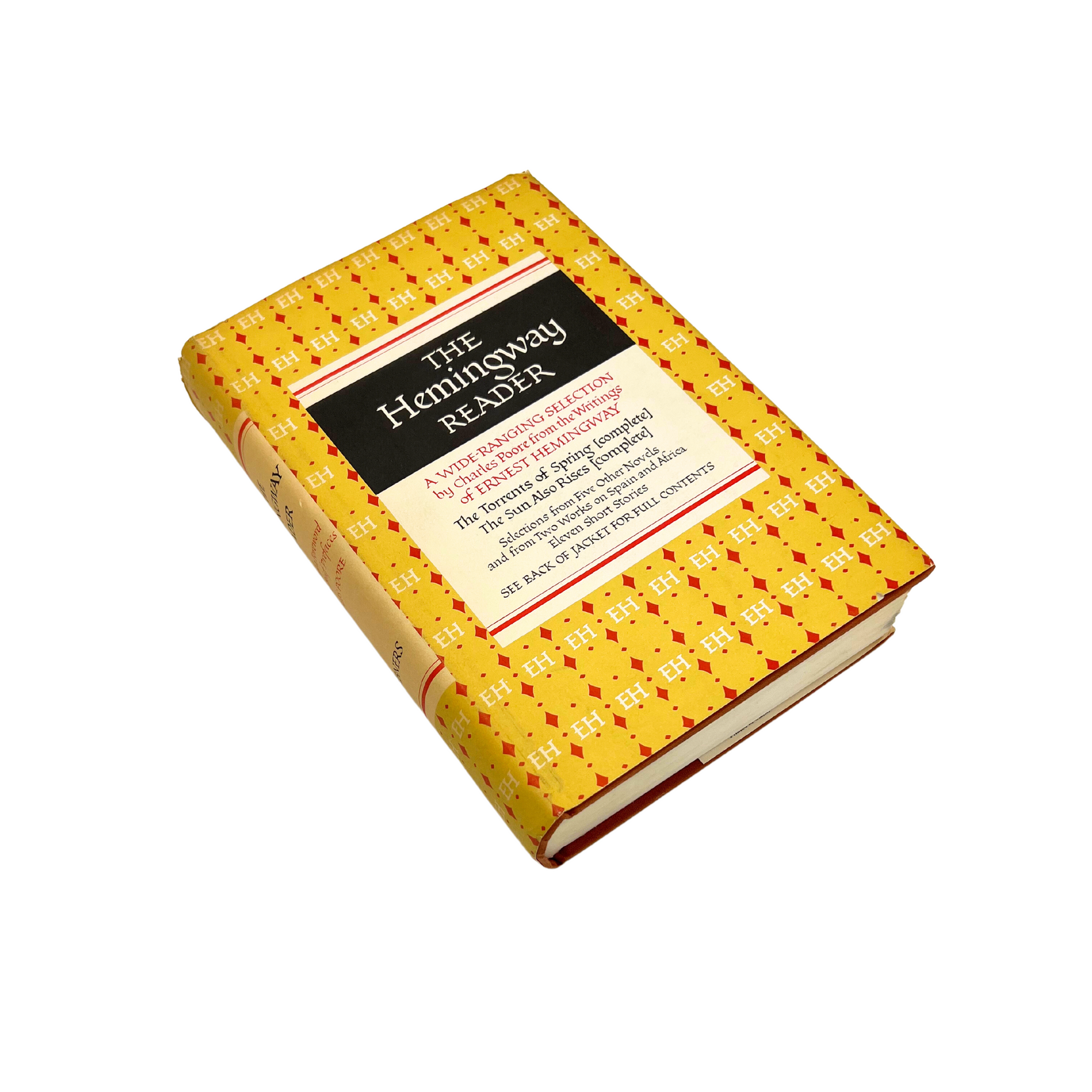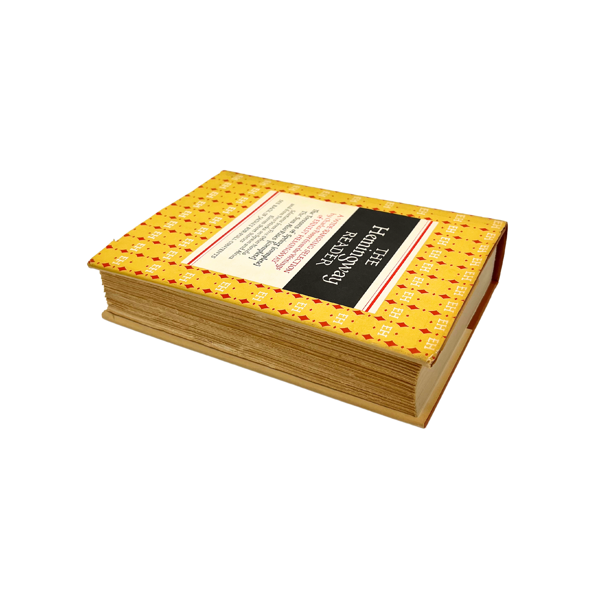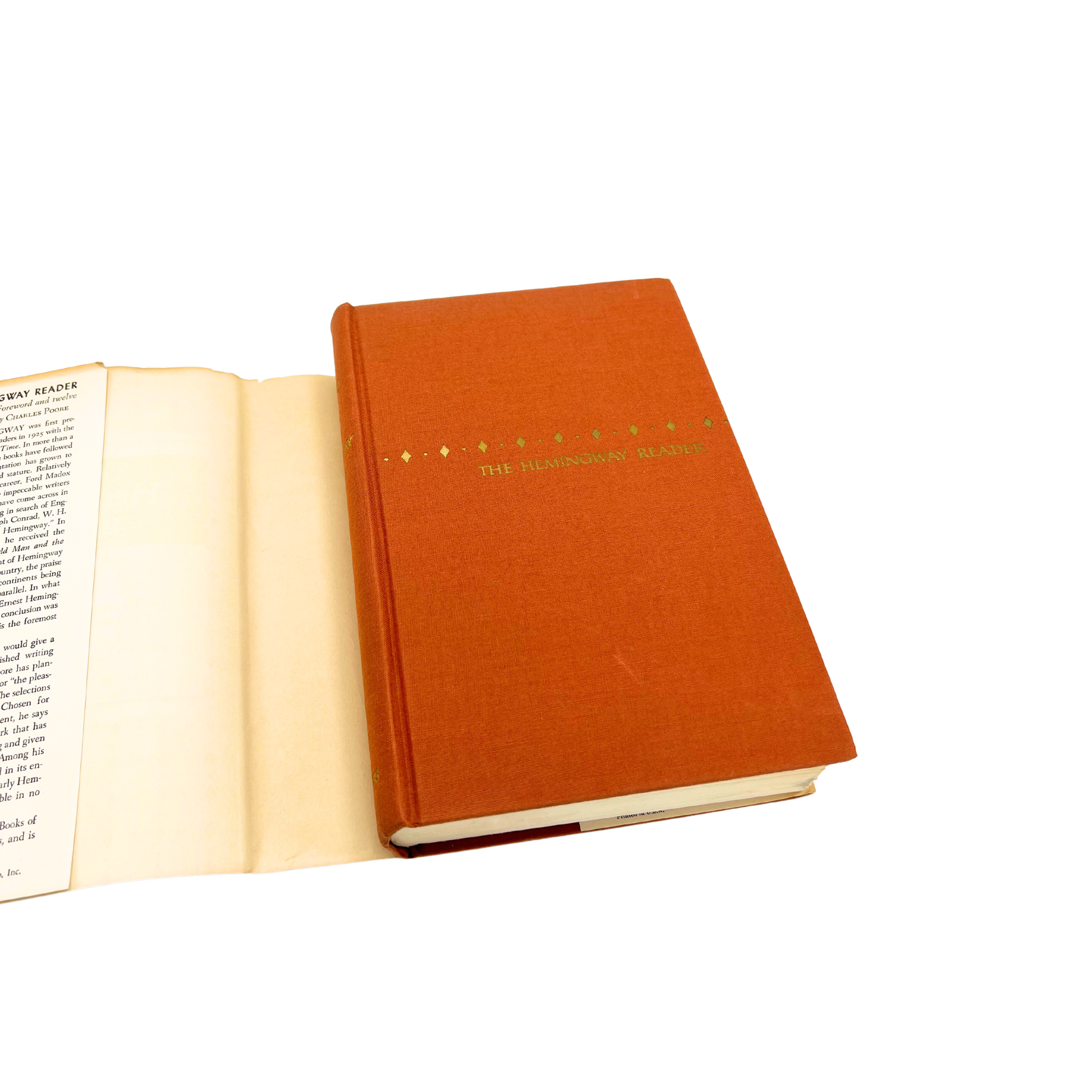 The Hemingway Reader (1953): "a wide ranging selection by Charles Poore from the writings of Ernest Hemingway". Found at an estate sale, this copy is in fantastic condition for its age. Hardcover book is bound with rust colored fabric and cover is in great shape. 8.25" long x 6.25" wide x 3" tall.