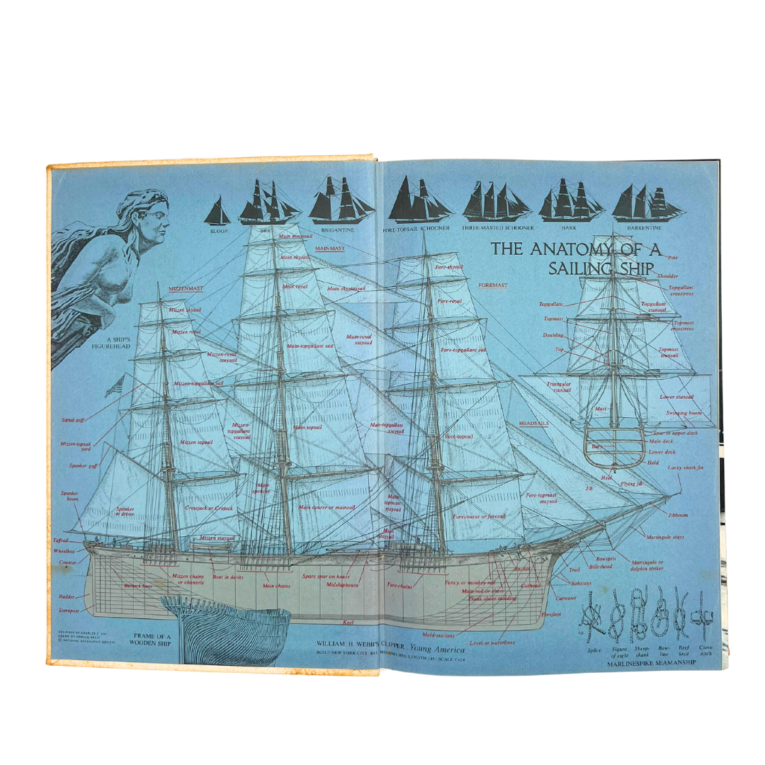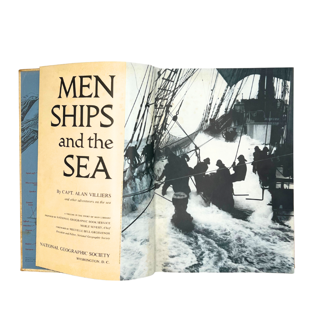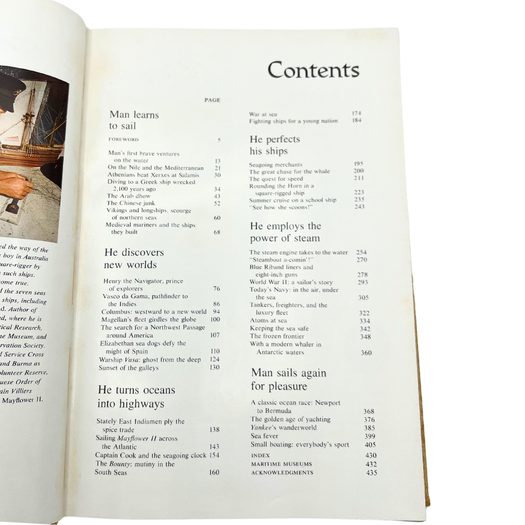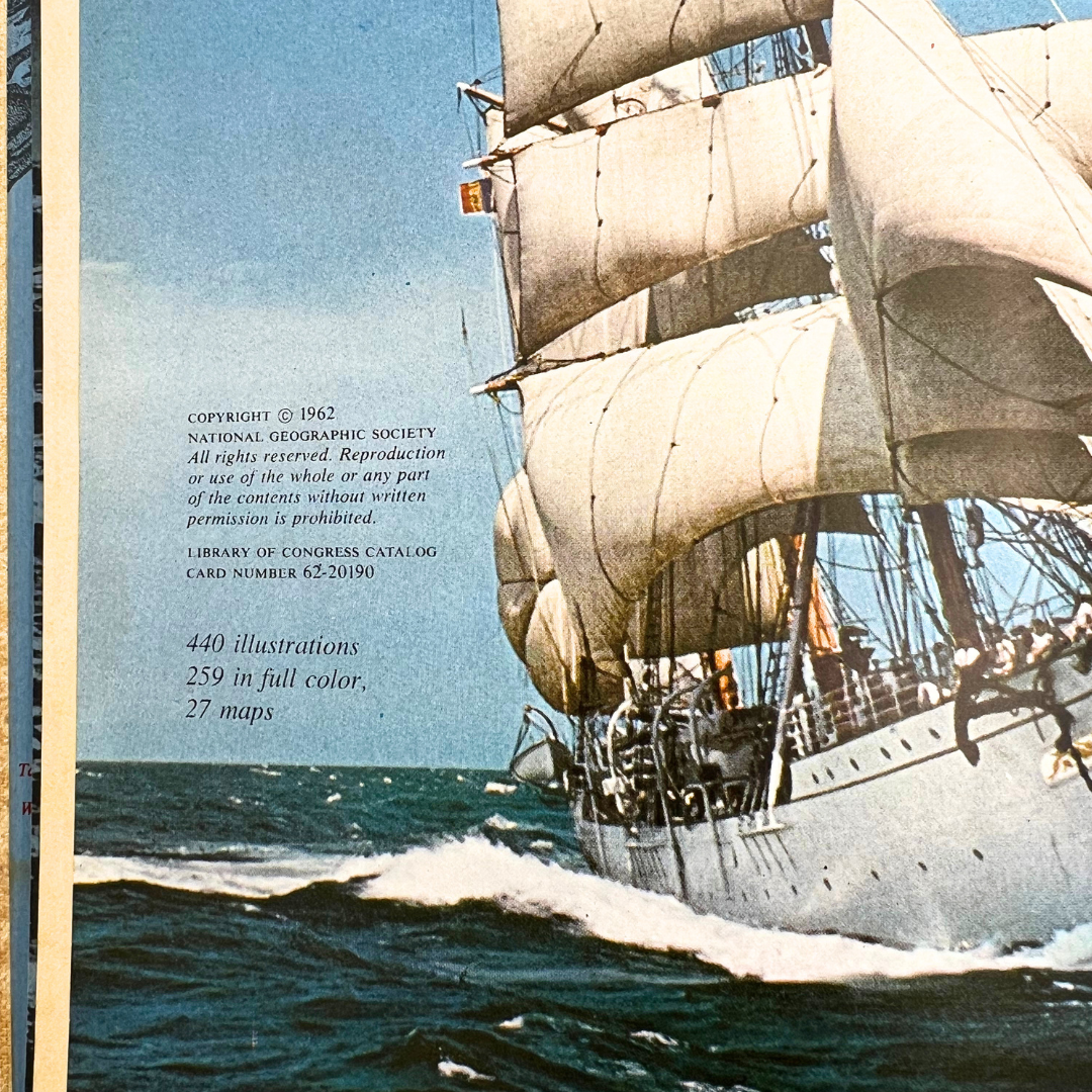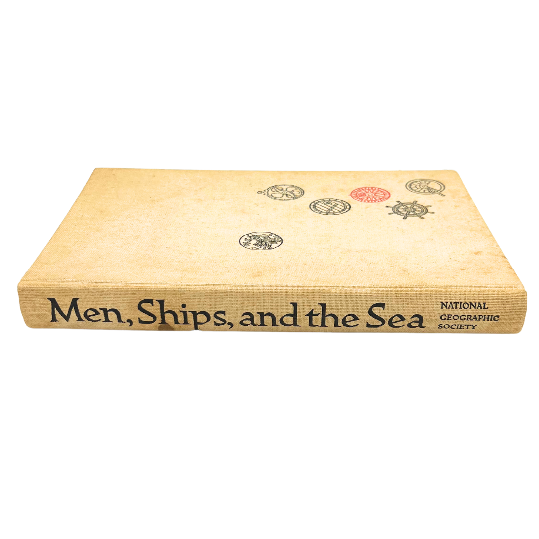 Men Ships and the Sea by National Geographic. Published in 1962. Nicely weathered with some discoloration on the fabric cover (no jacket) but interior pages in good condition. Interesting history of man's relationship with ships. Measures 11.25" x 7.75".