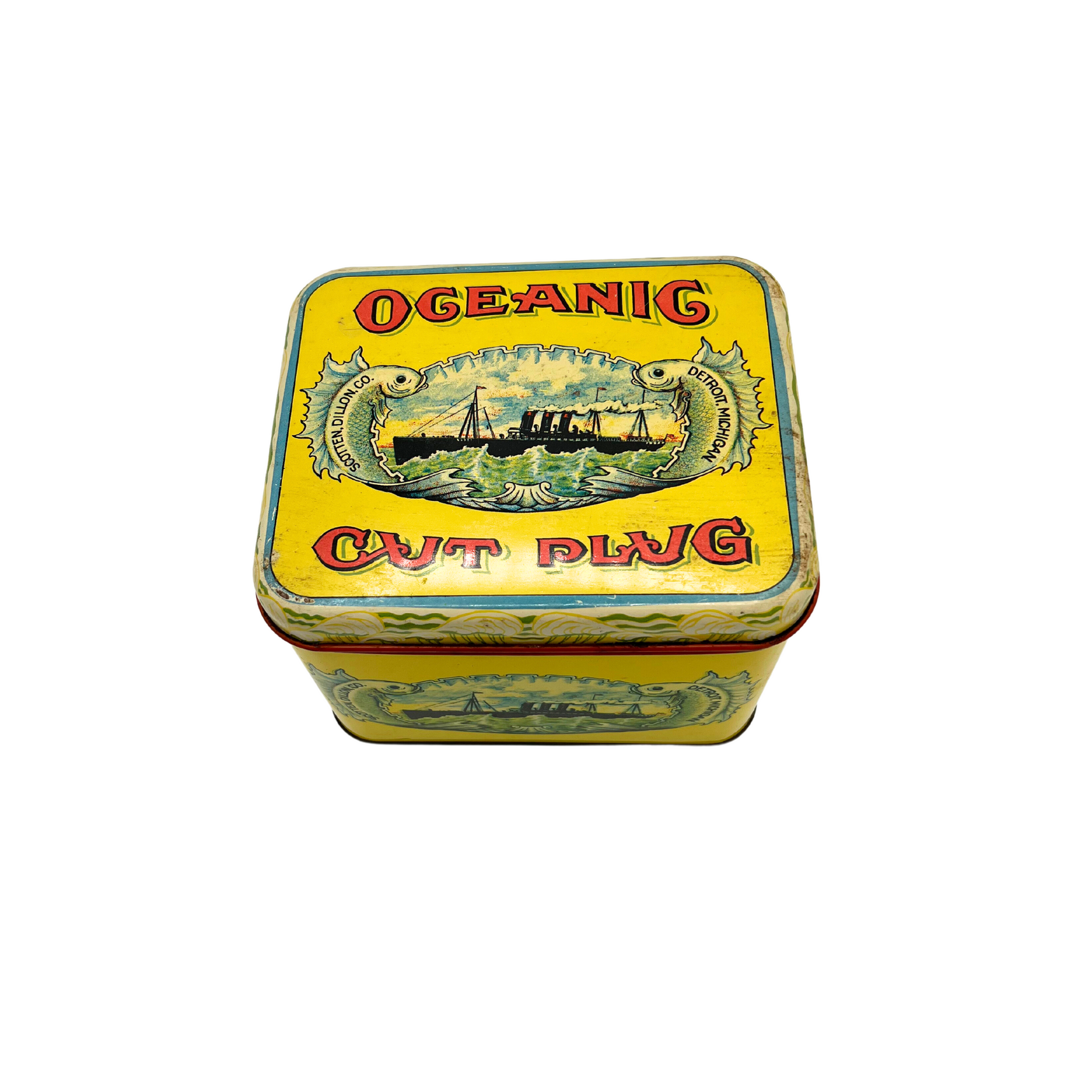 Oceanic Cut Plug collectible tobacco tin c1970s. Good vintage condition inside and out. 6.5" long x 4.5" tall " 5" wide