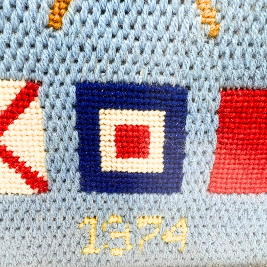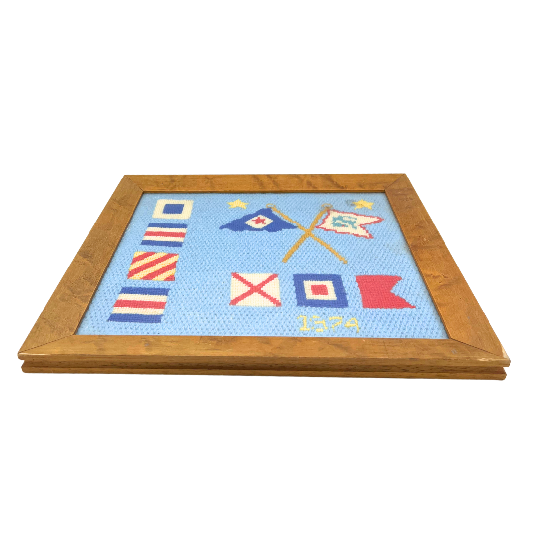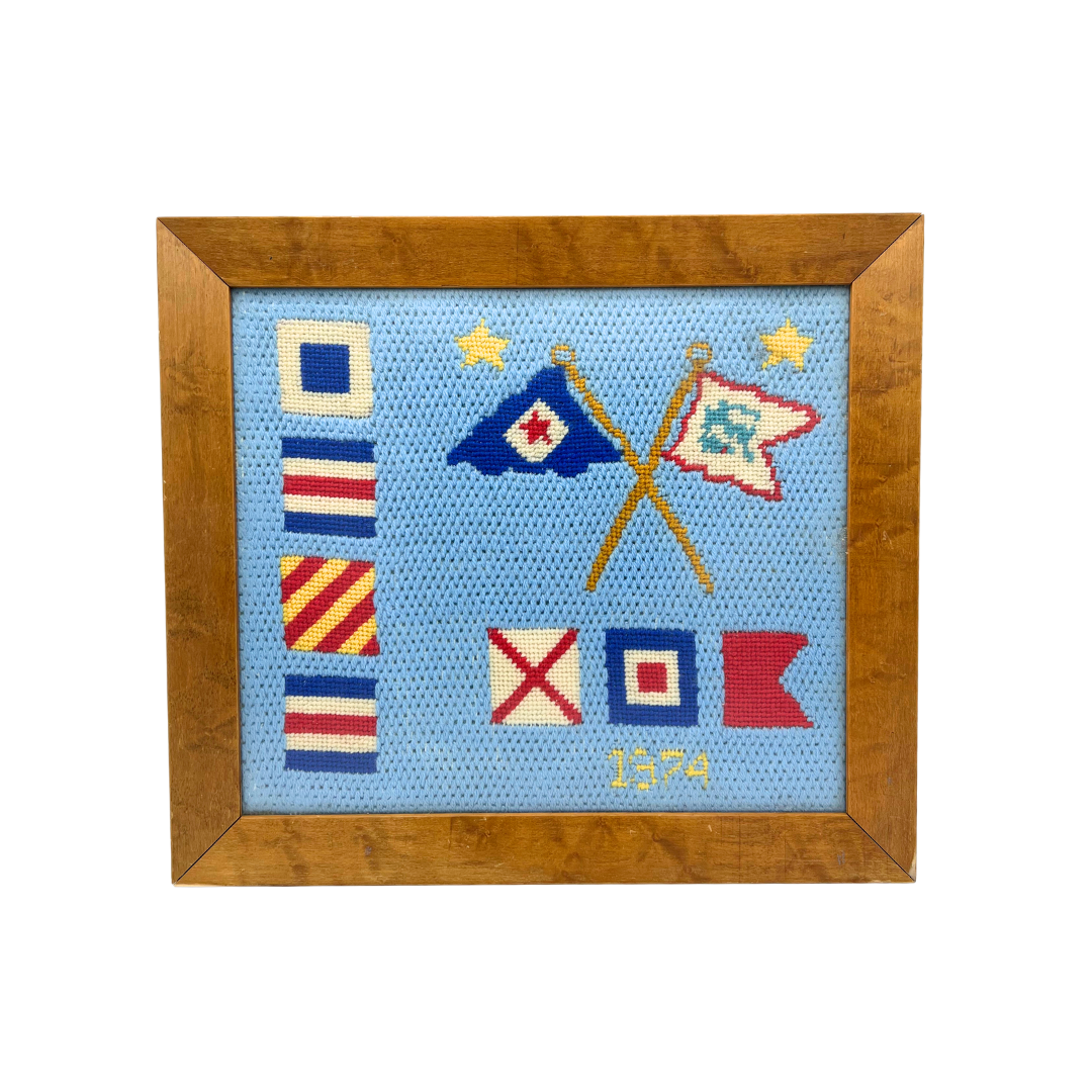 Framed needlepoint dated 1974. Two burgees - associations unknown. Nautical flags read SCYC x VWB. Some wear consistent with age. Measures 16" x 14.25".