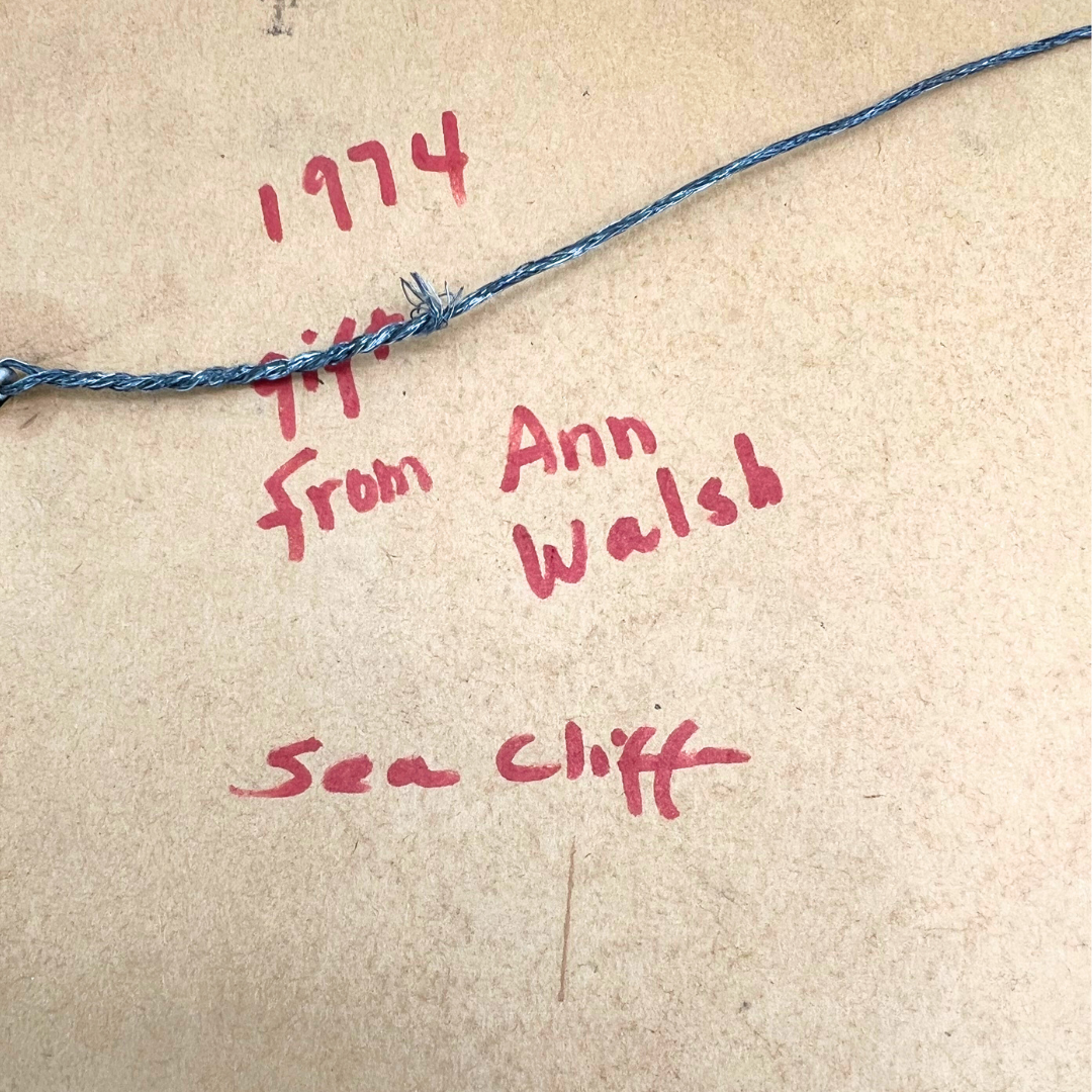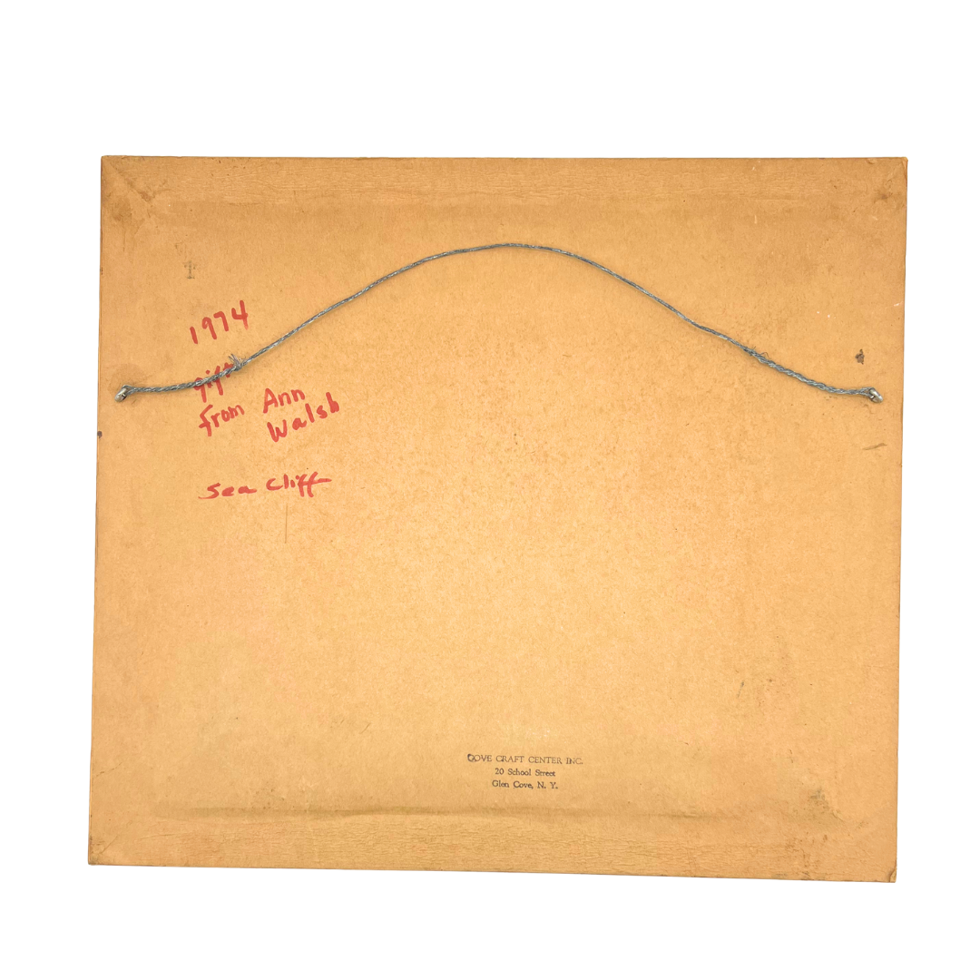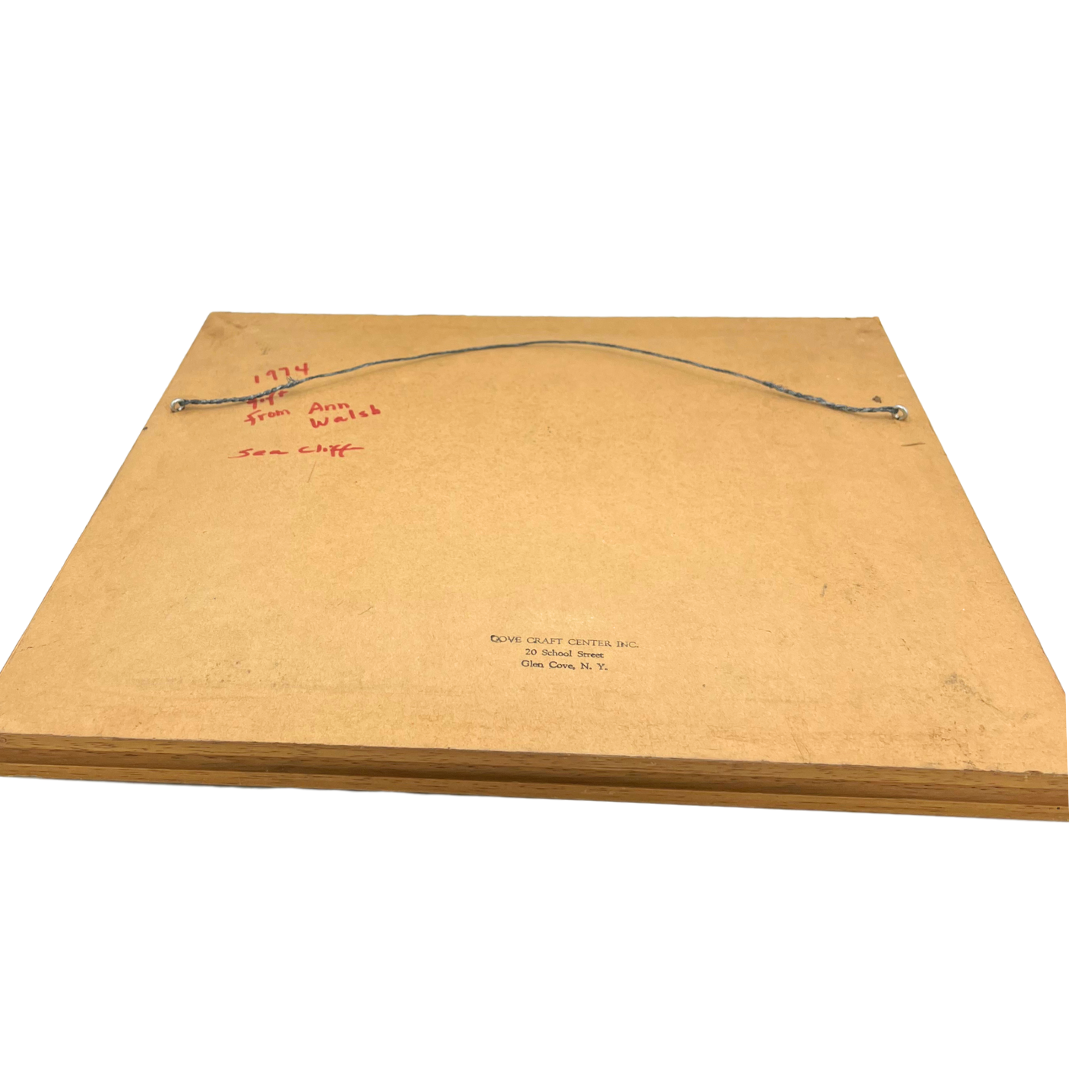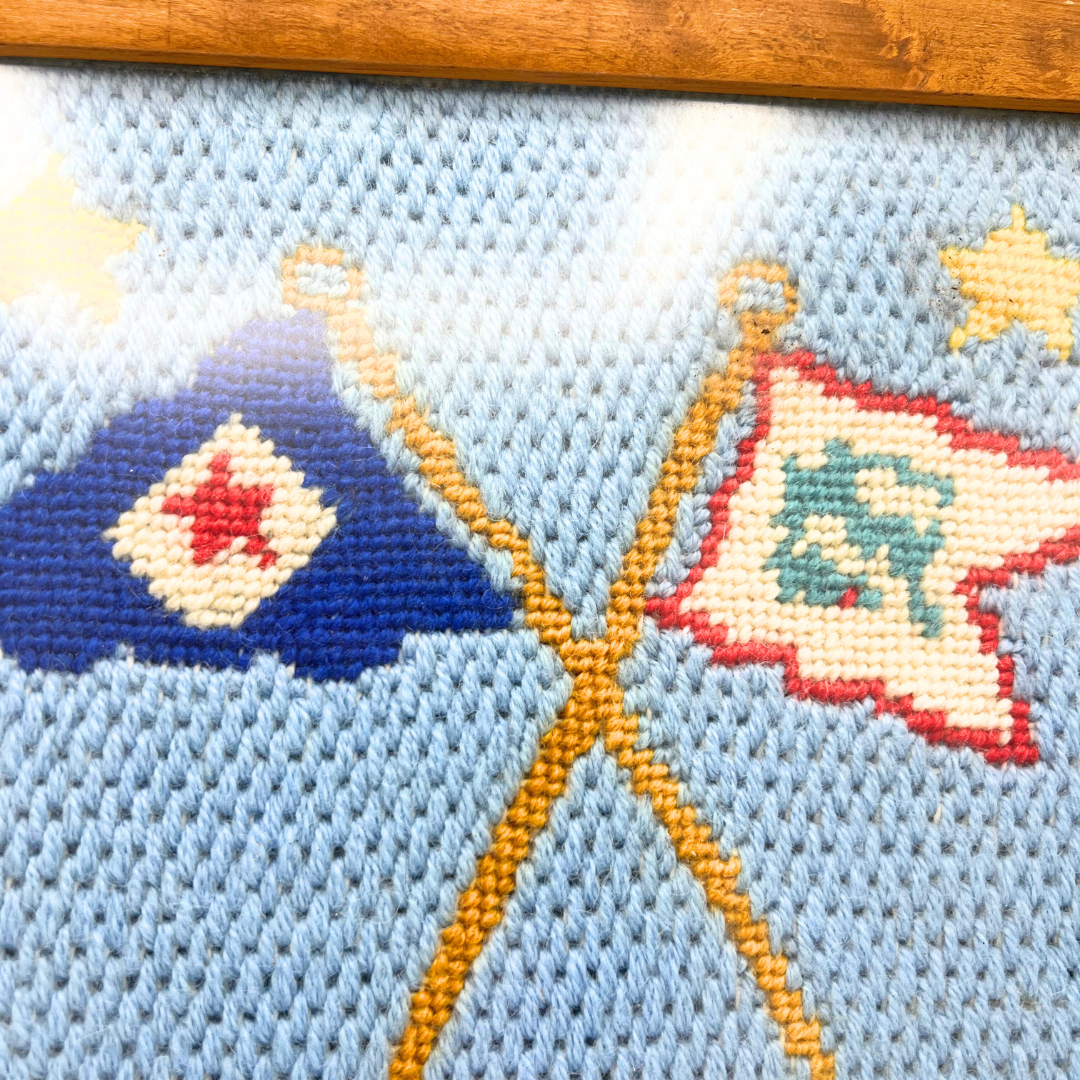 Framed needlepoint dated 1974. Two burgees - associations unknown. Nautical flags read SCYC x VWB. Some wear consistent with age. Measures 16" x 14.25".