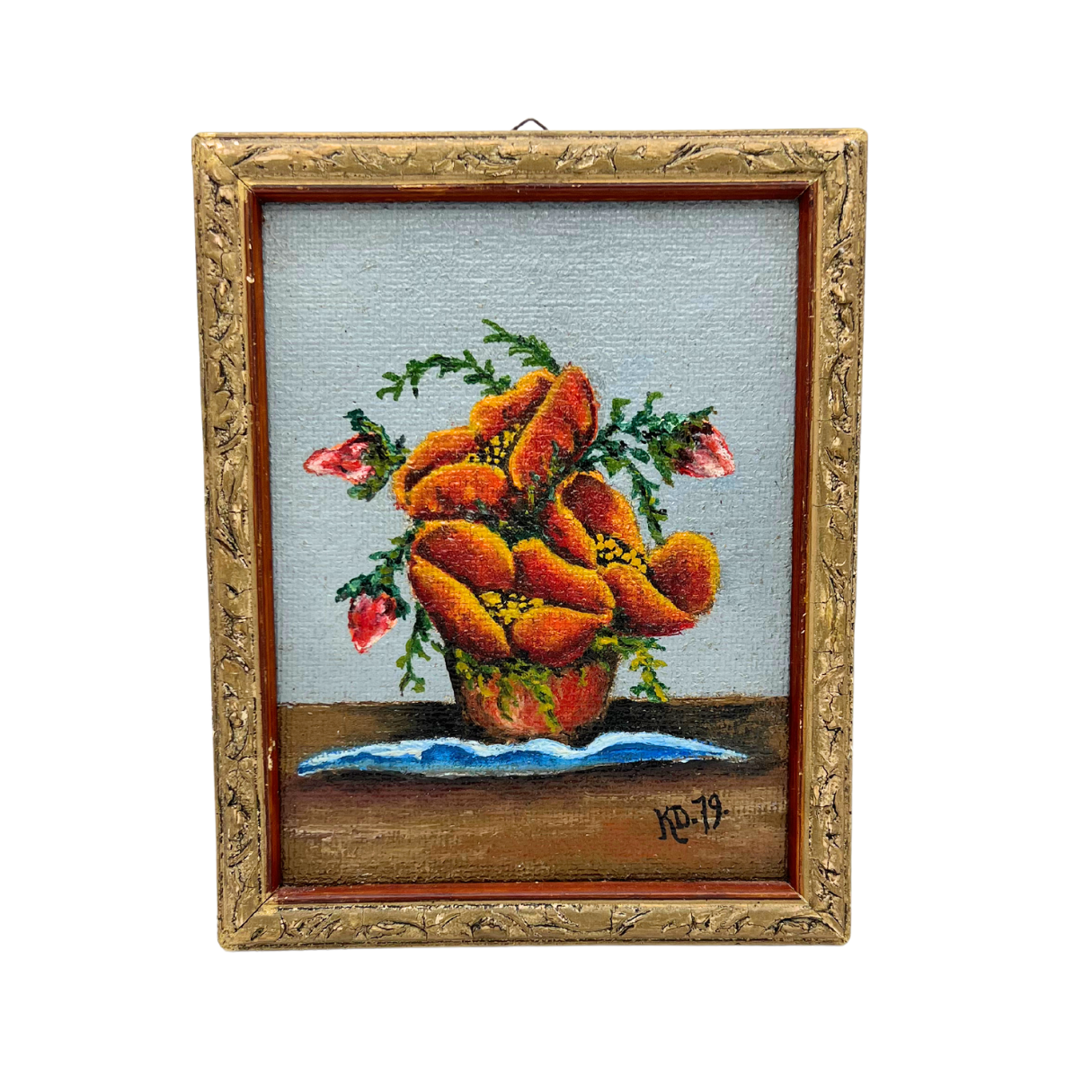Small still life of flowers in a pot. Painted in 1979 in Poland. Gold wooden frame. Charming painting in good vintage condition. Measures 8" x 6.25".
