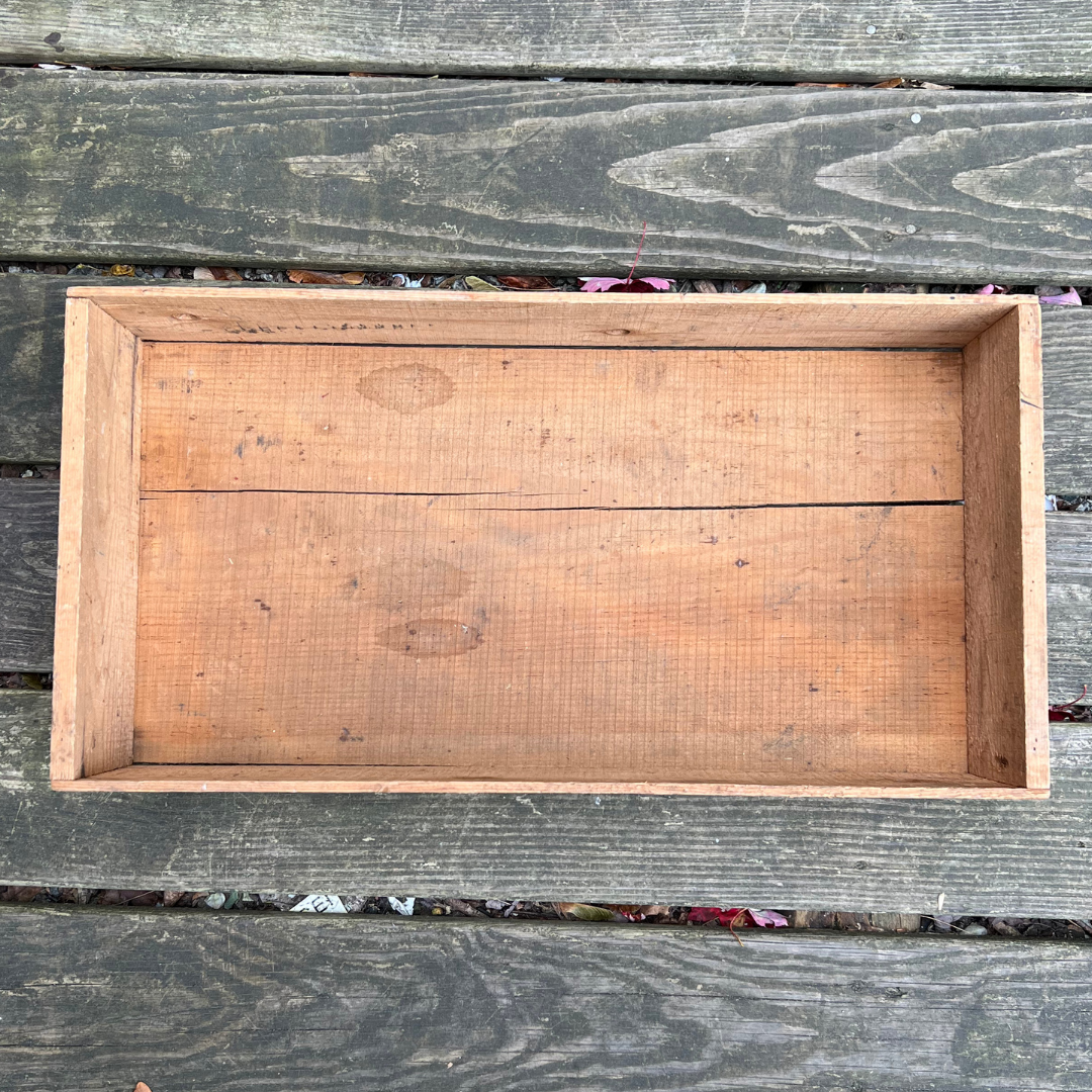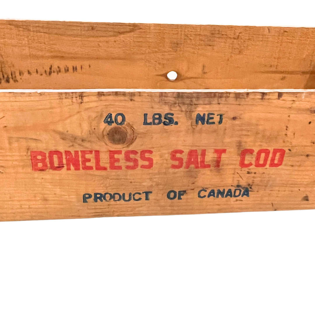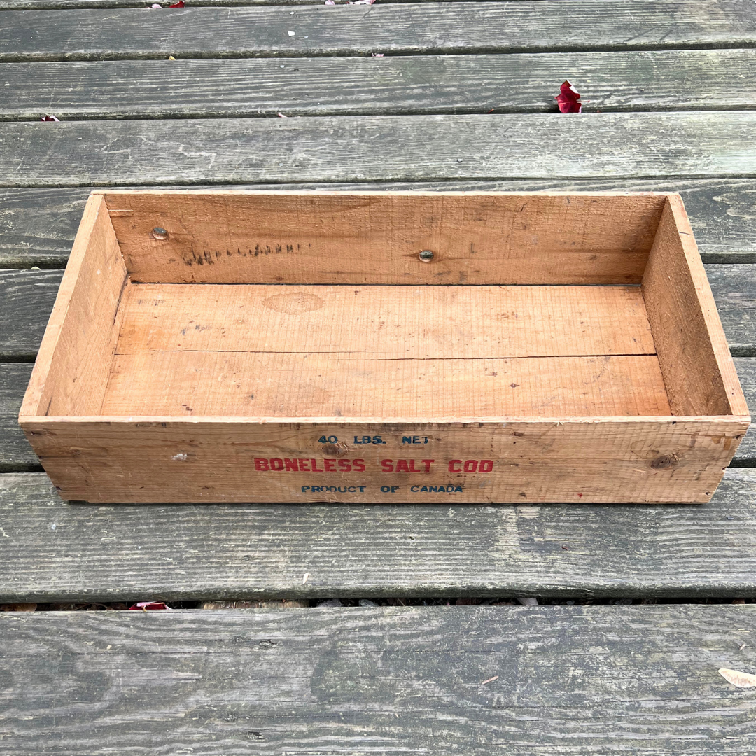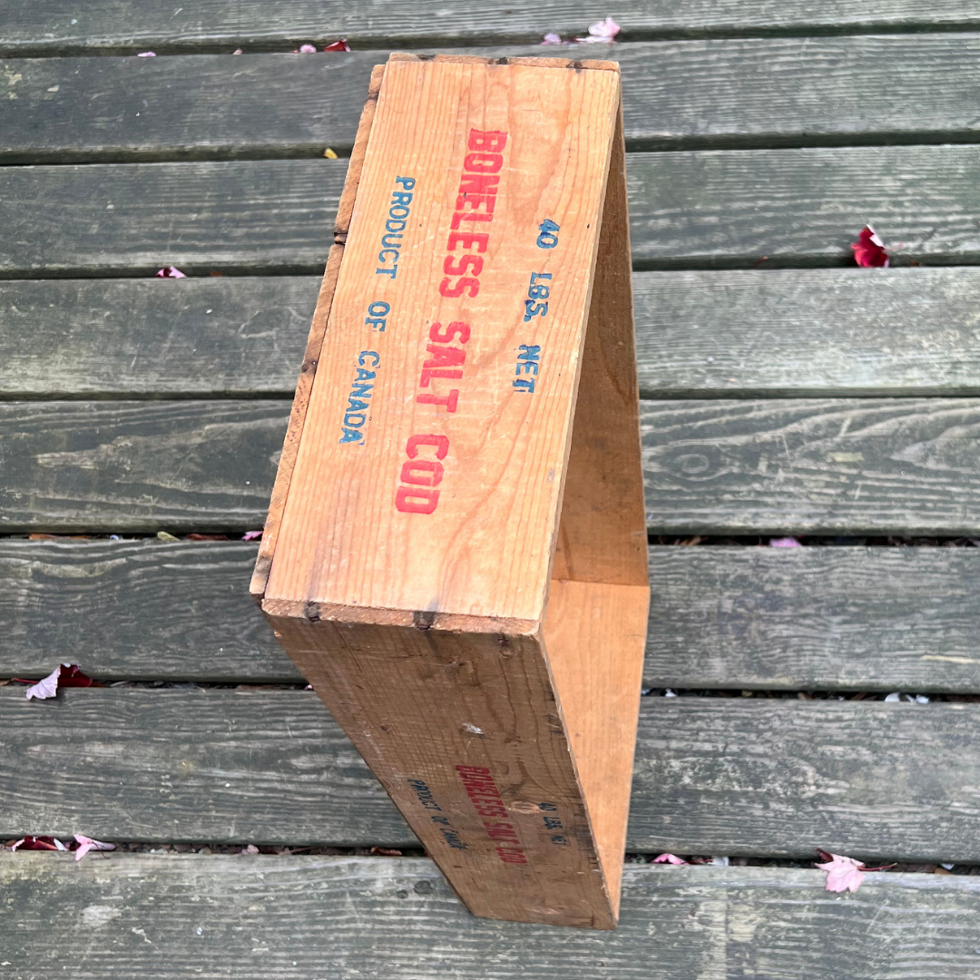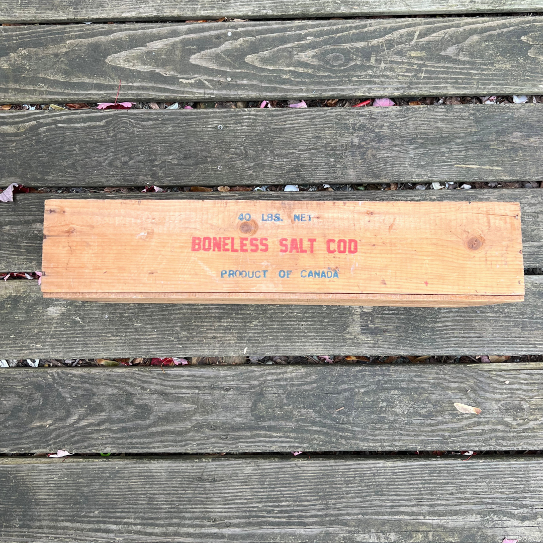 Wooden box previously used to ship 40 lbs of salt cod. Age unknown. Colors are still vibrant. Measures approximately 12.25" x 12.5".