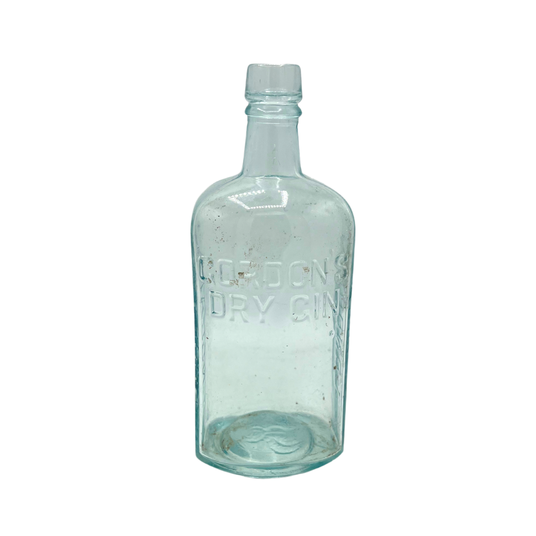 Collectible antique Gordon's Dry Gin bottle from early 1900s. London England embossed on sides. No chips or cracks. Some debris visible inside. Stands 8.75" tall.
