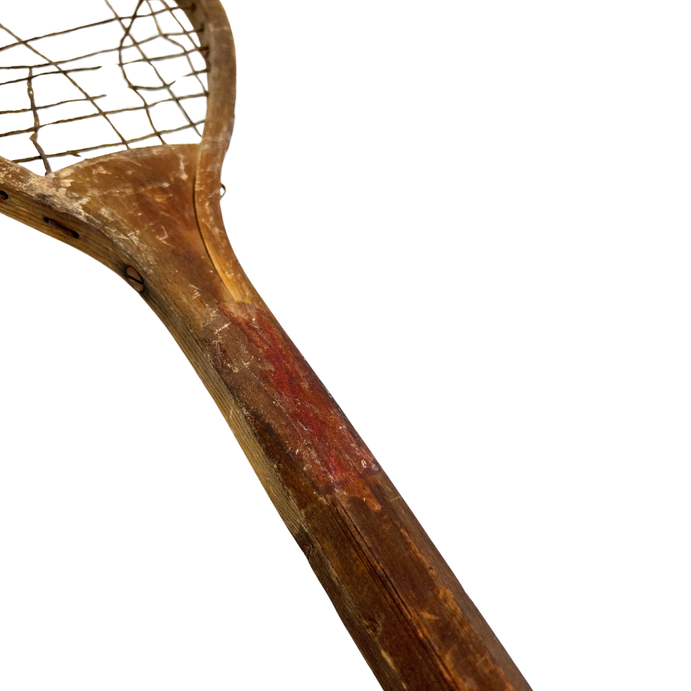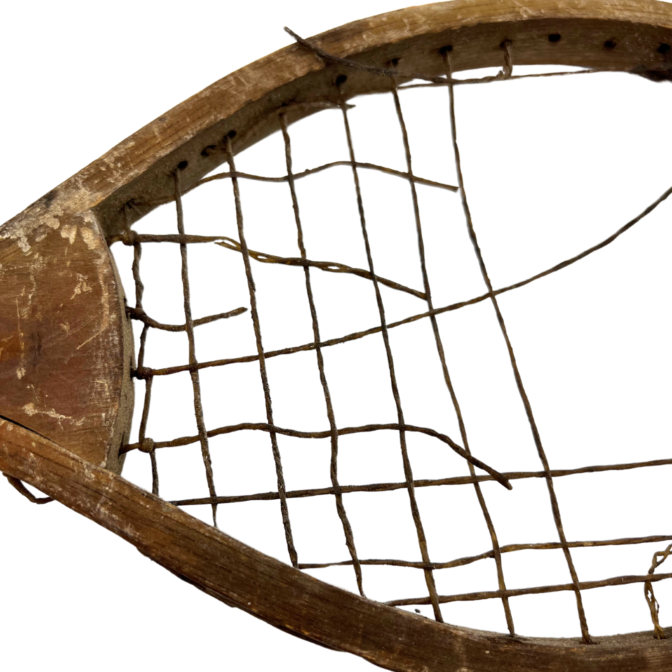 Antique wooden racquet. Estimated early 1900s. Very small - possibly intended for a child. Strings were made with some type of natural fiber and have broken with age. Would look great hung on a wall. Measures 21" long.