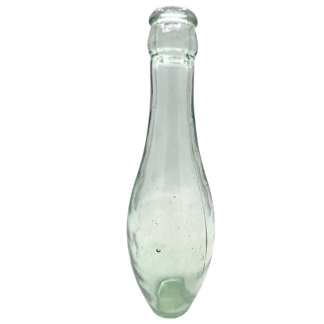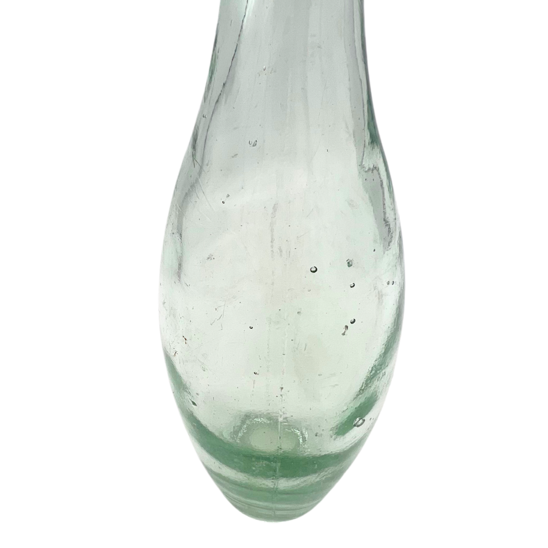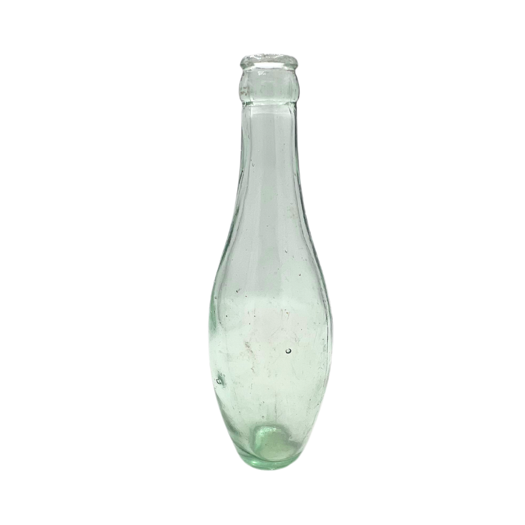Antique green glass soda bottle. Estimated late 1800s. Thick glass with visible bubbles and seams. Bowling pin shape. Stands 8.5" tall.