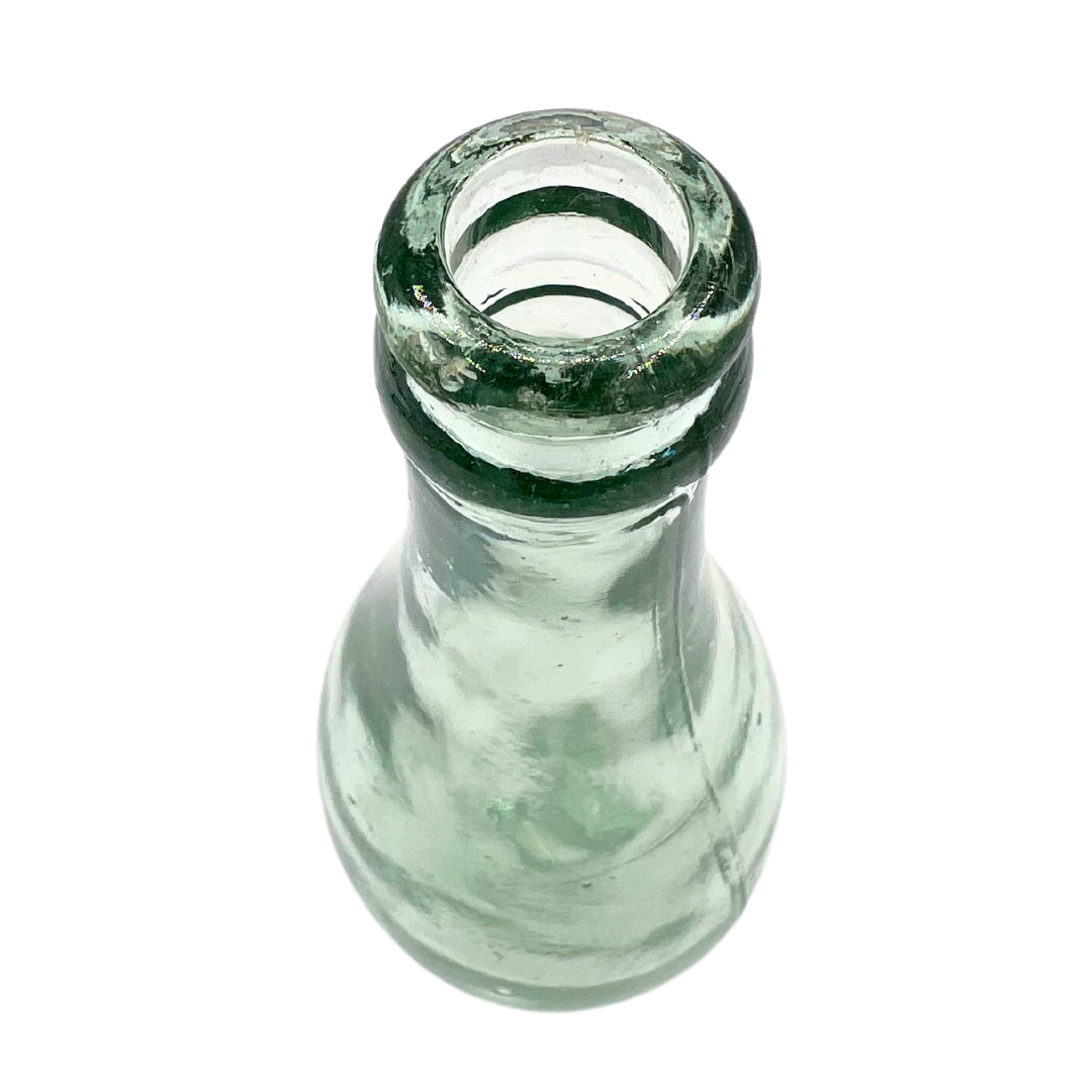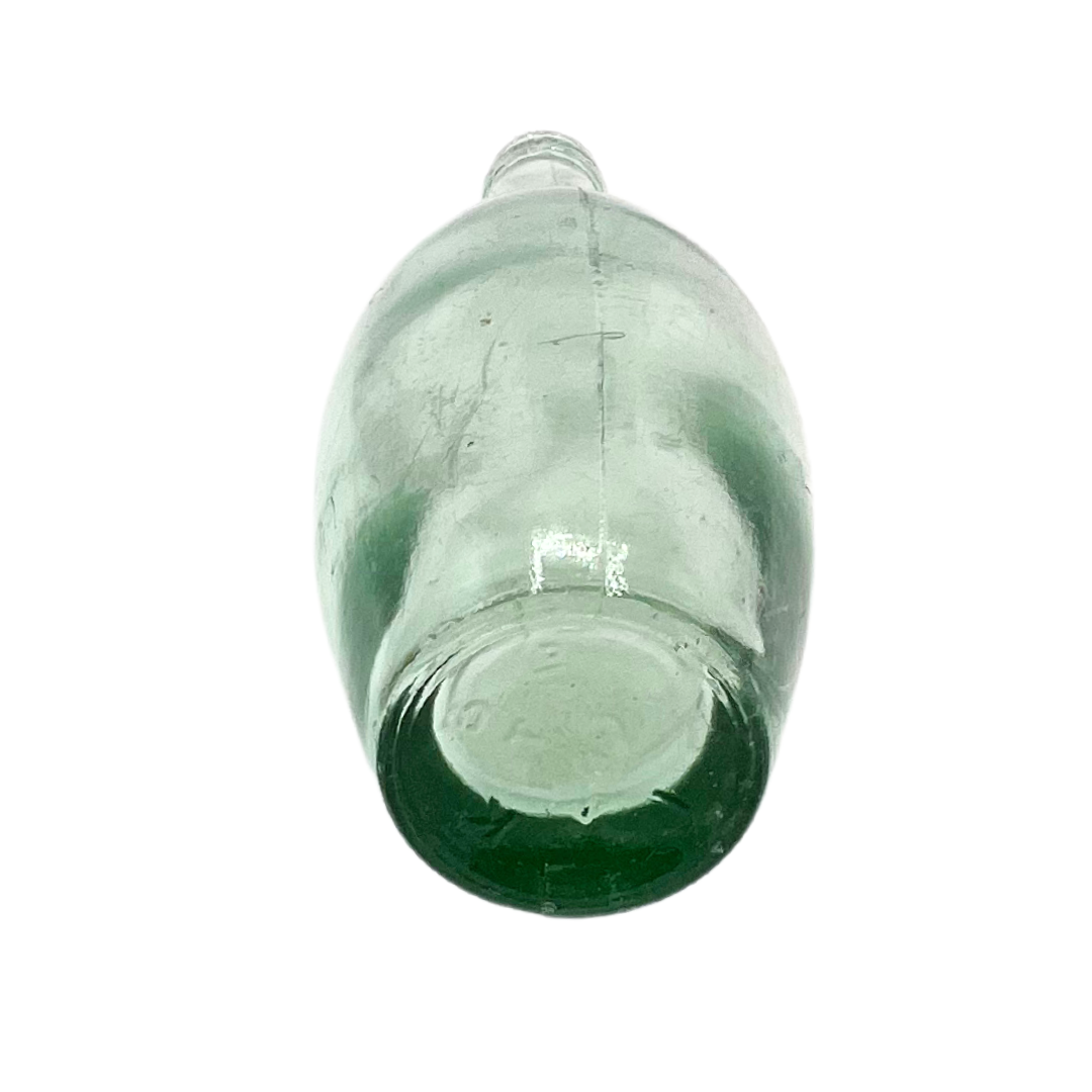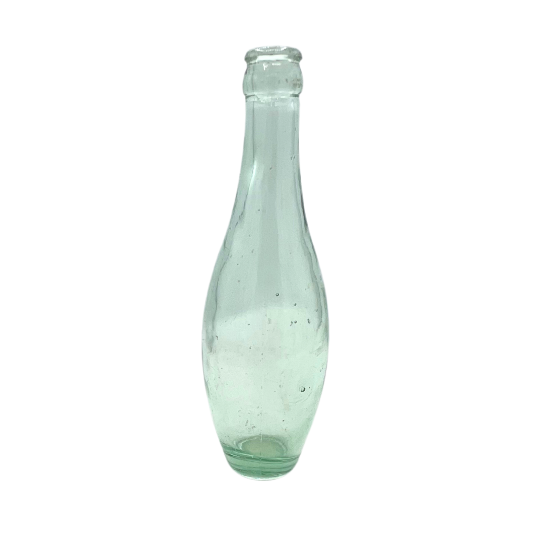 Antique green glass soda bottle. Estimated late 1800s. Thick glass with visible bubbles and seams. Bowling pin shape. Stands 8.5" tall.
