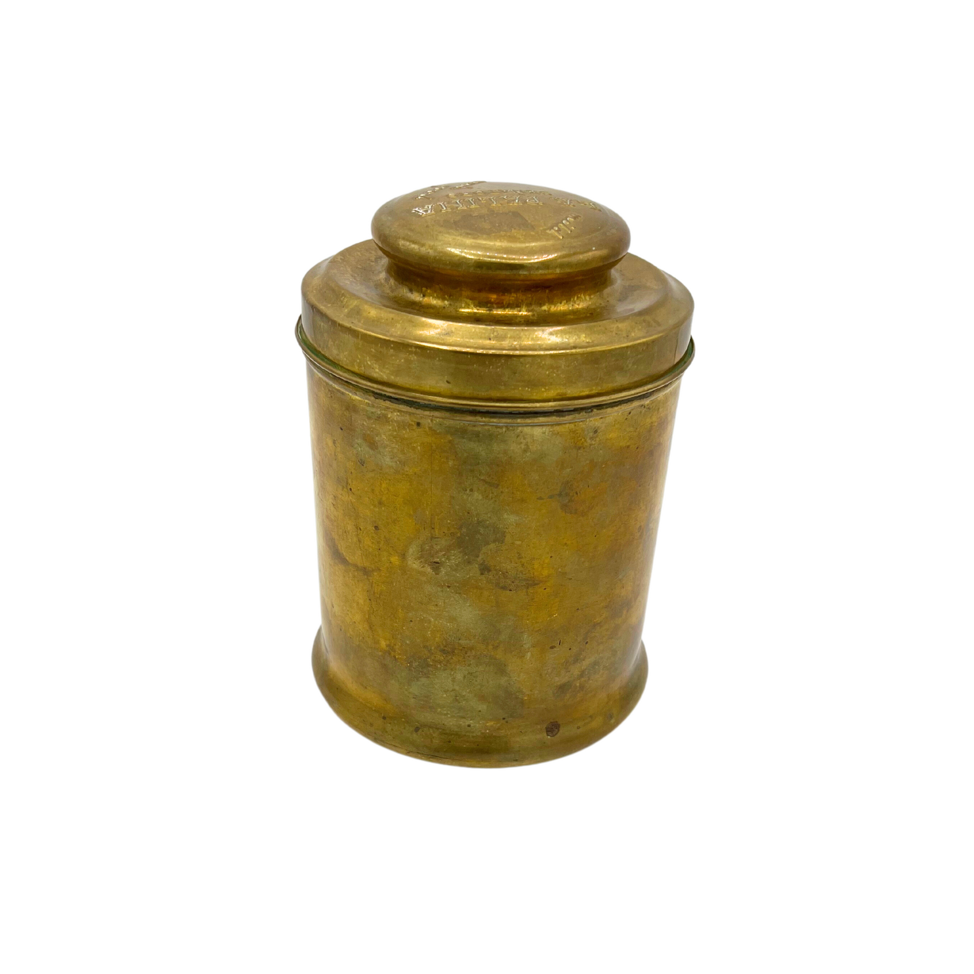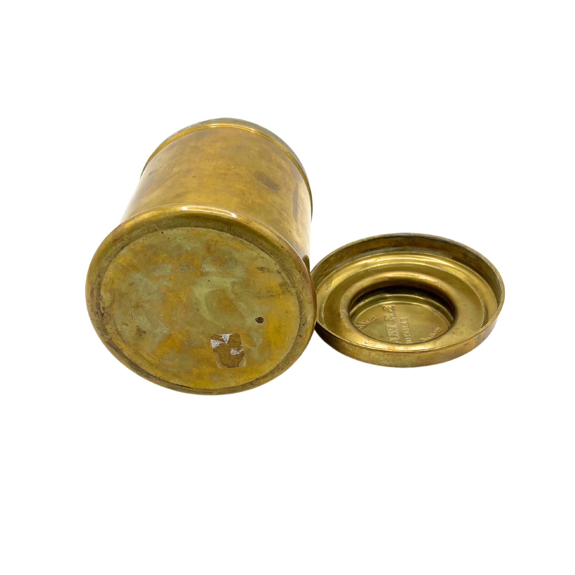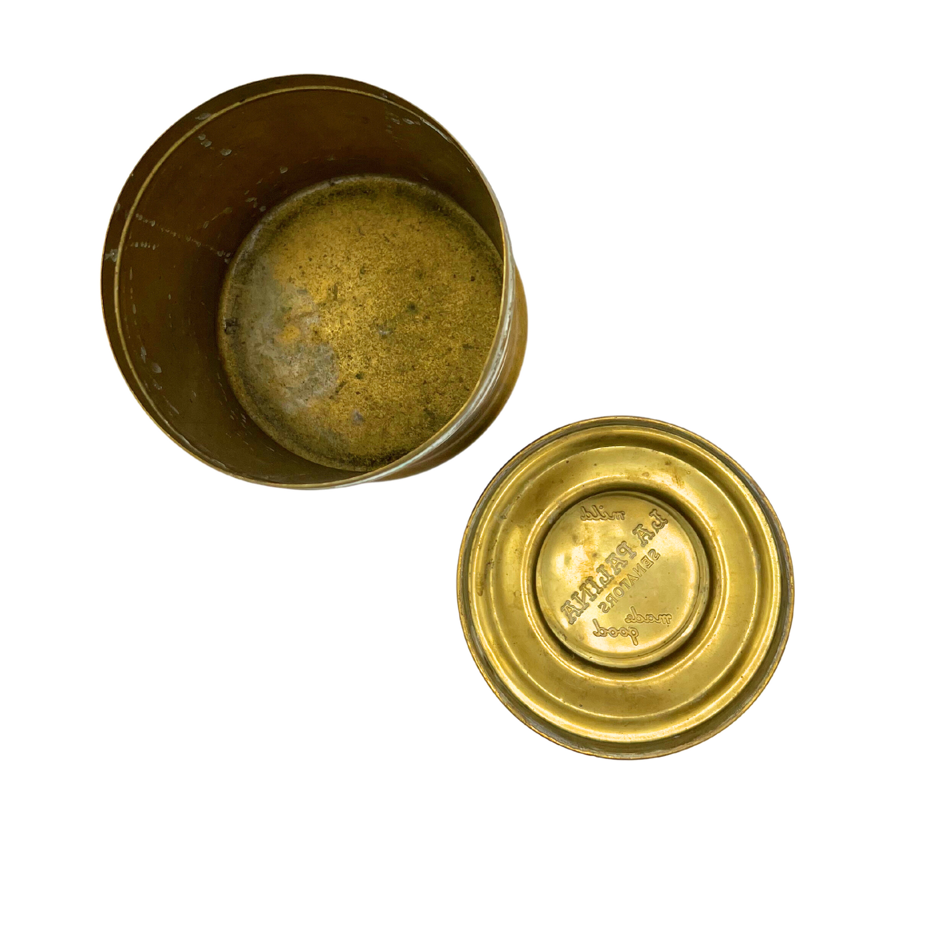Vintage brass humidor. La Palina Senators brand, "mild" and "made good" printed on lid. Brass has slight patina. Overall good condition.