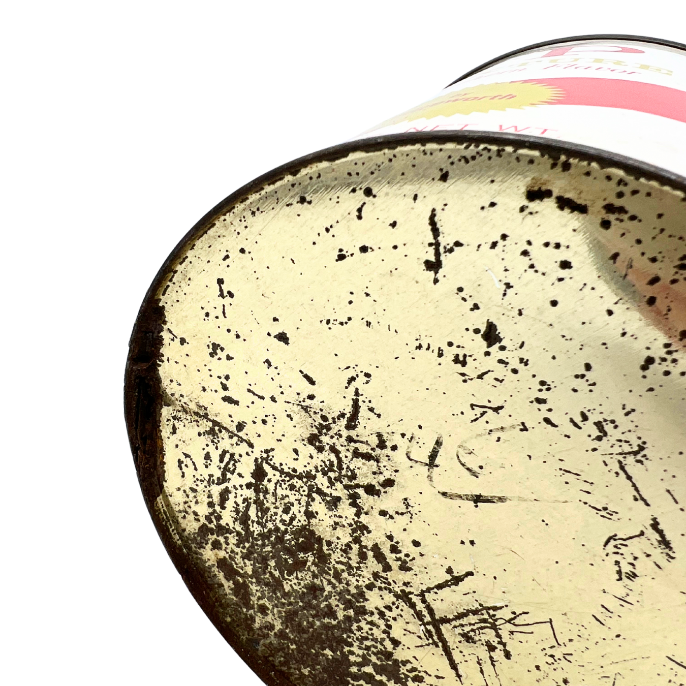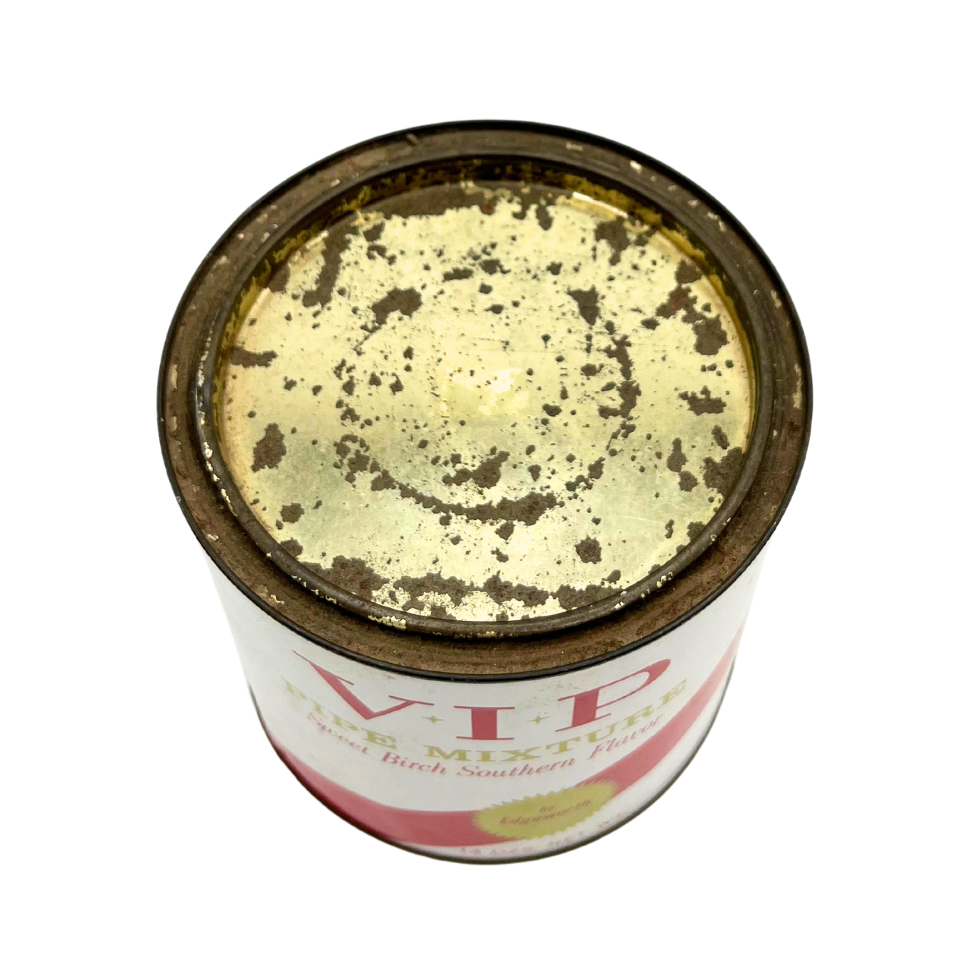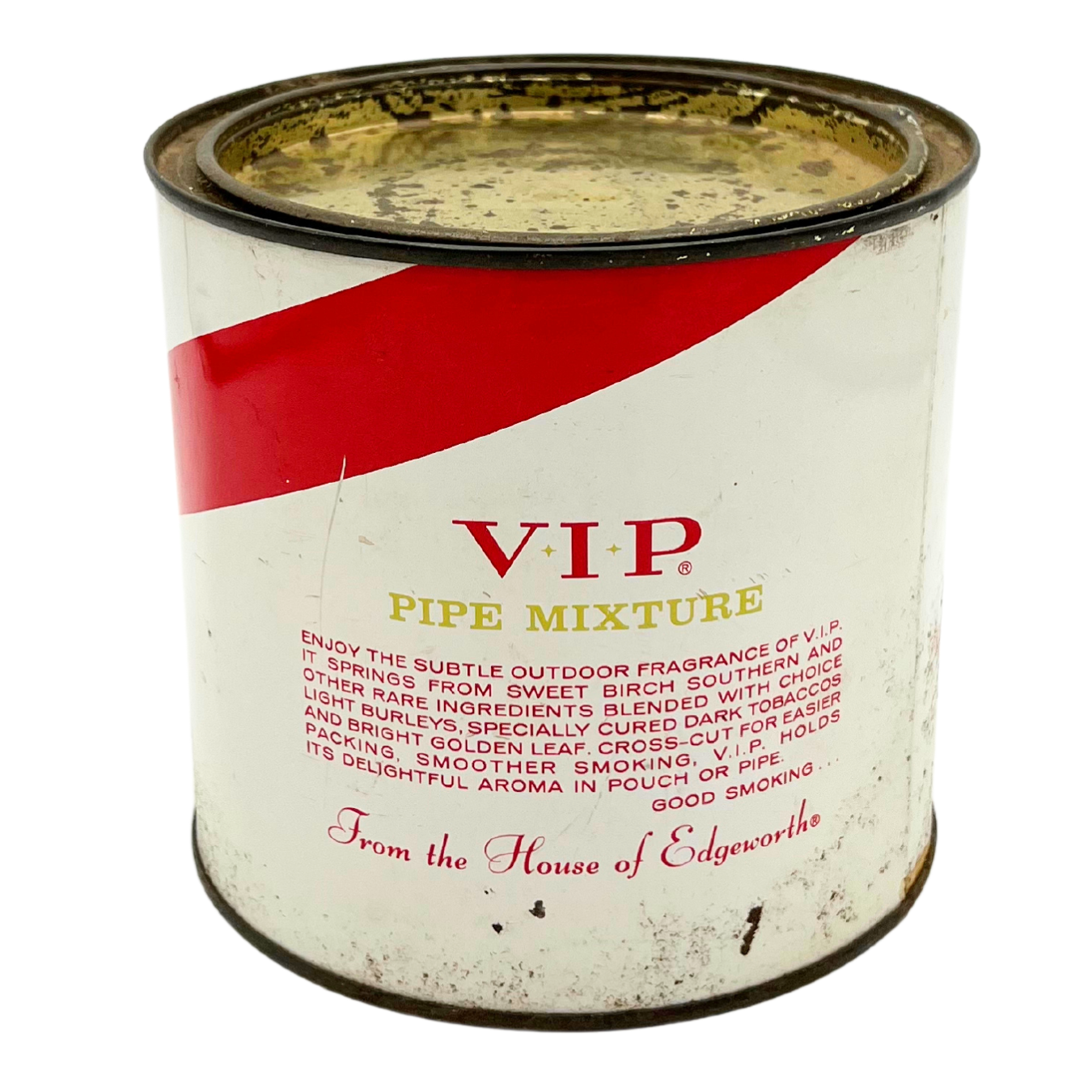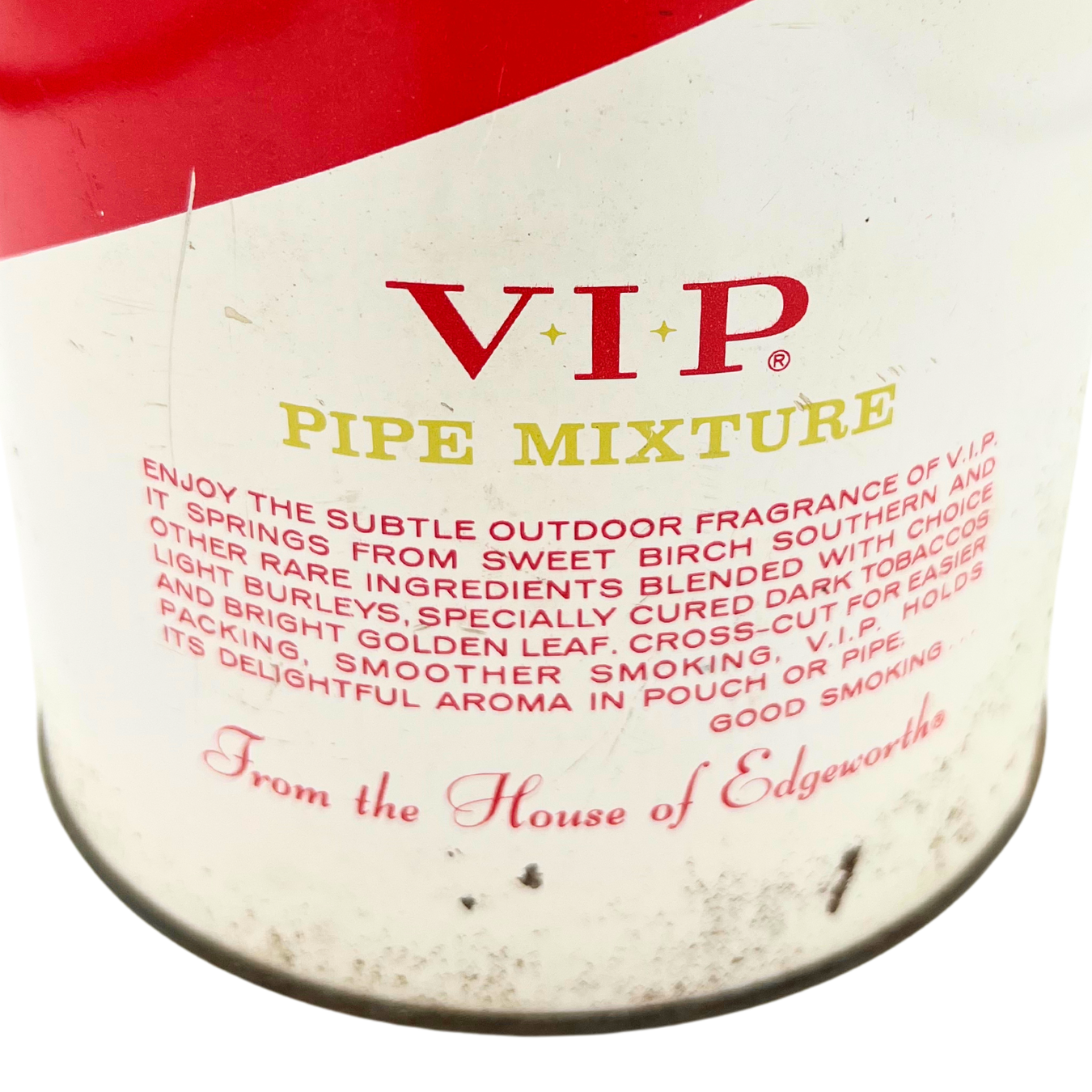 Edgeworth "VIP" pipe mixture tobacco tin. Estimated 1950s or 1960s. Brightly colored. Overall fair vintage condition - some scratches/marks (mostly on top and bottom of tin). Fun shelf decor. Measures 5.25" wide x 5" tall.