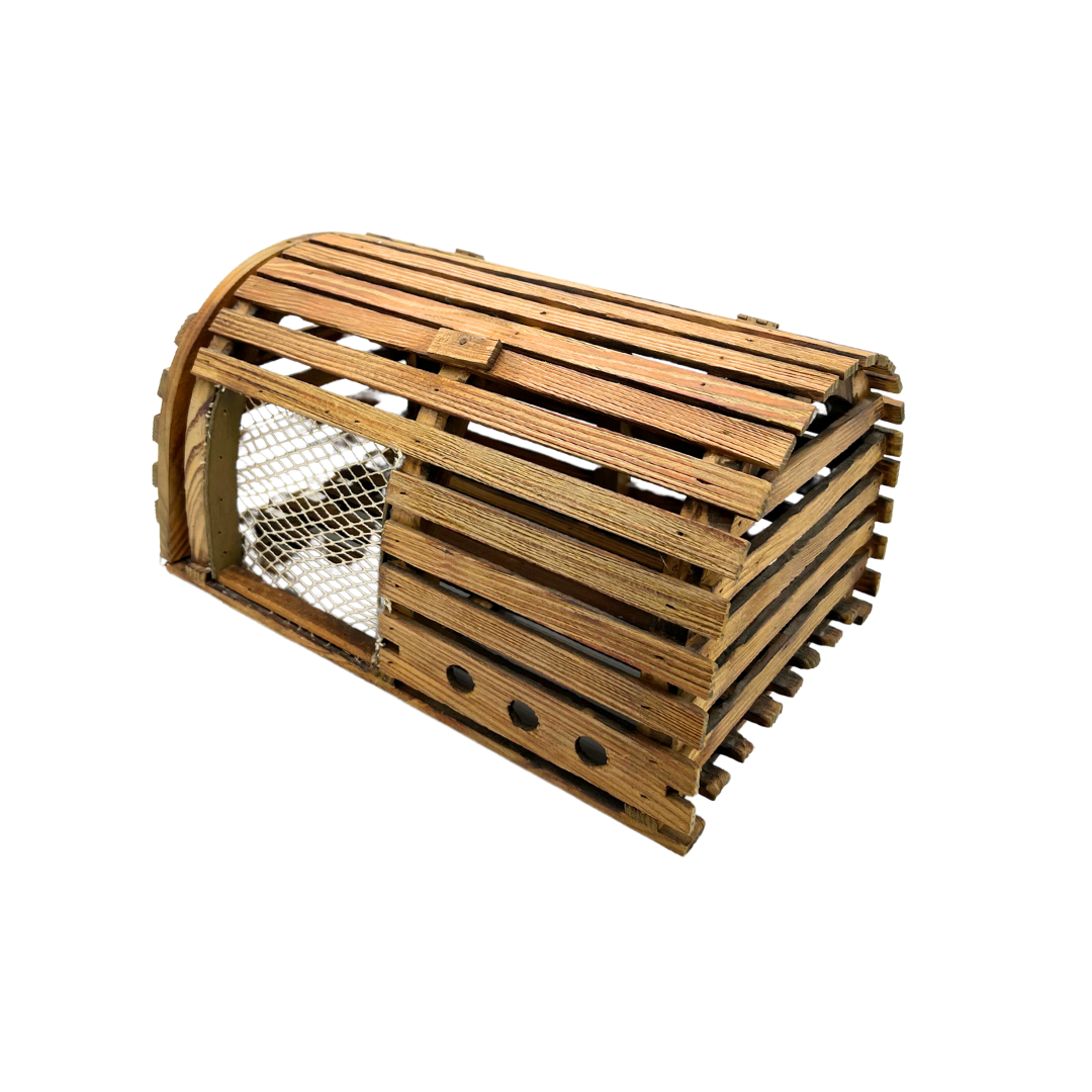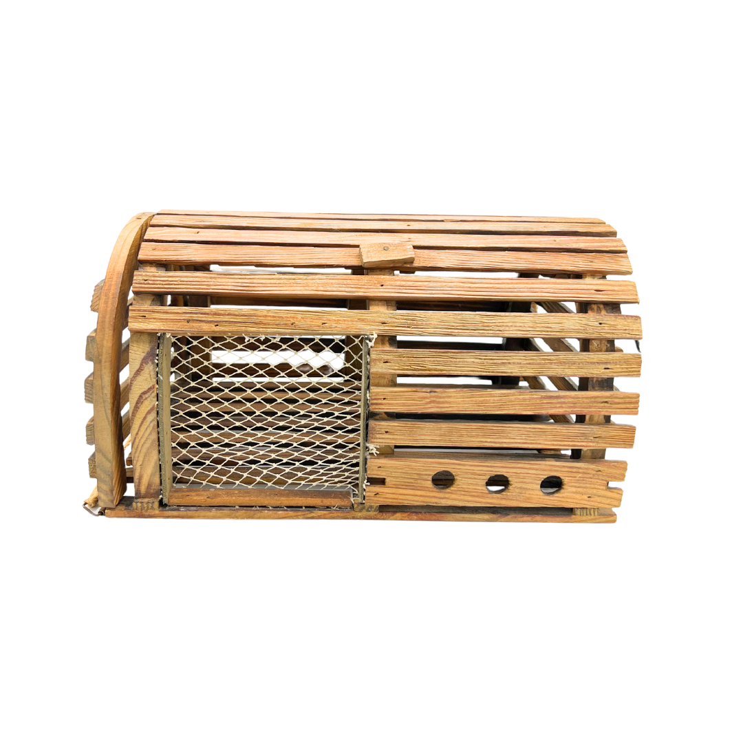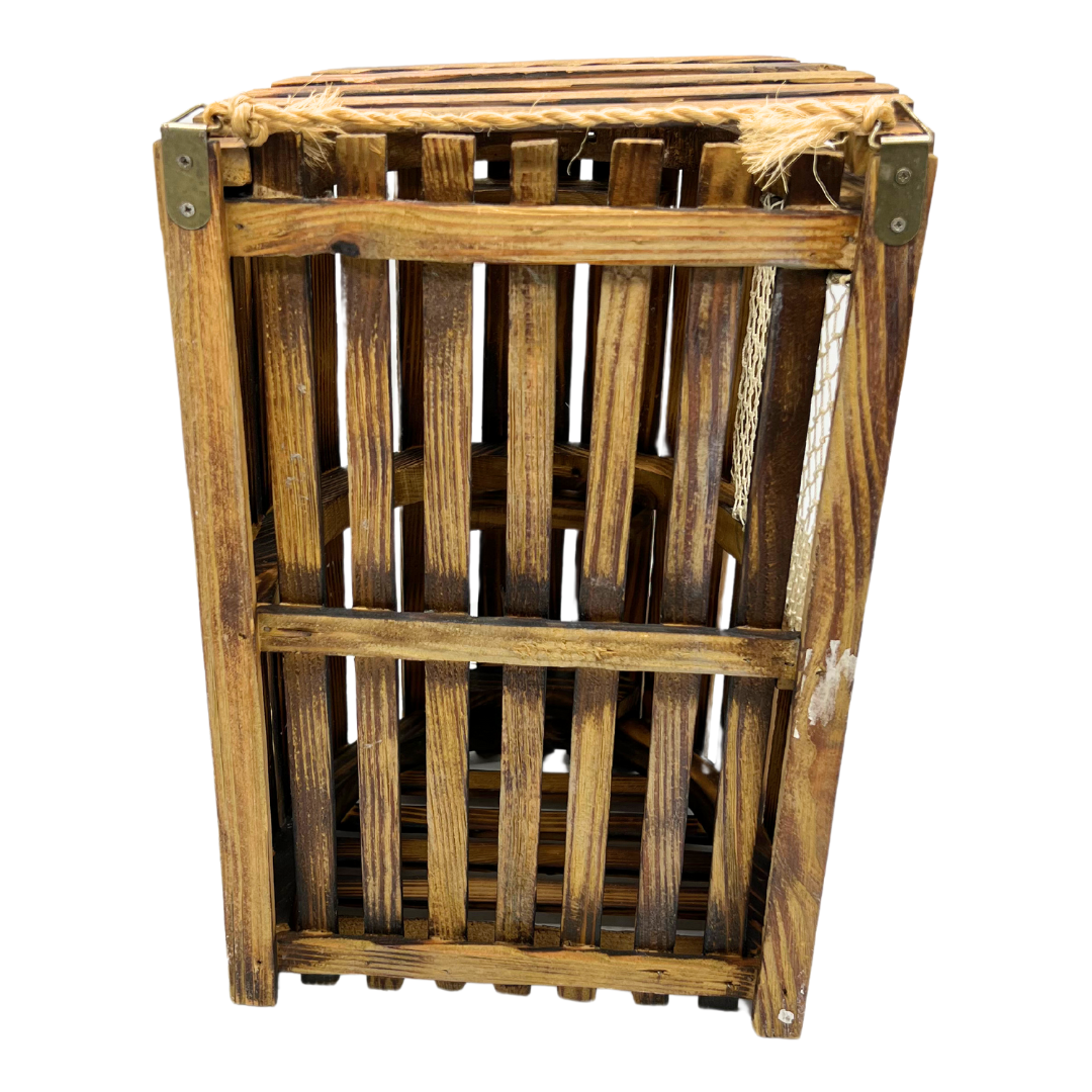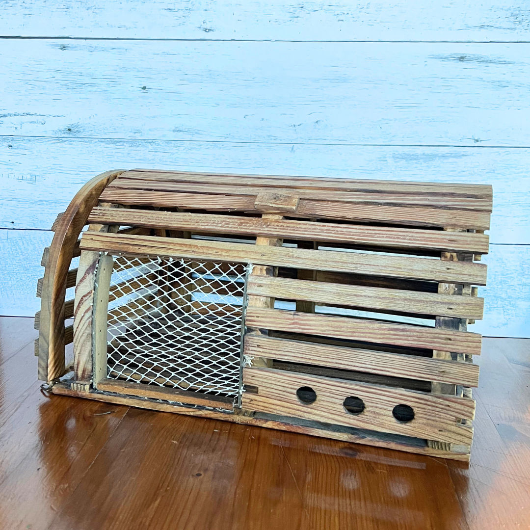 Mini wooden lobster trap. Top and side open. Age and origin unknown. Twine and hooks for wall hanging if desired. Side door doesn't clasp but top hatch door has a wooden toggle. Approximately 12.25" long x 6.5" high.