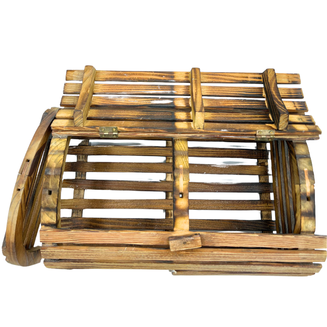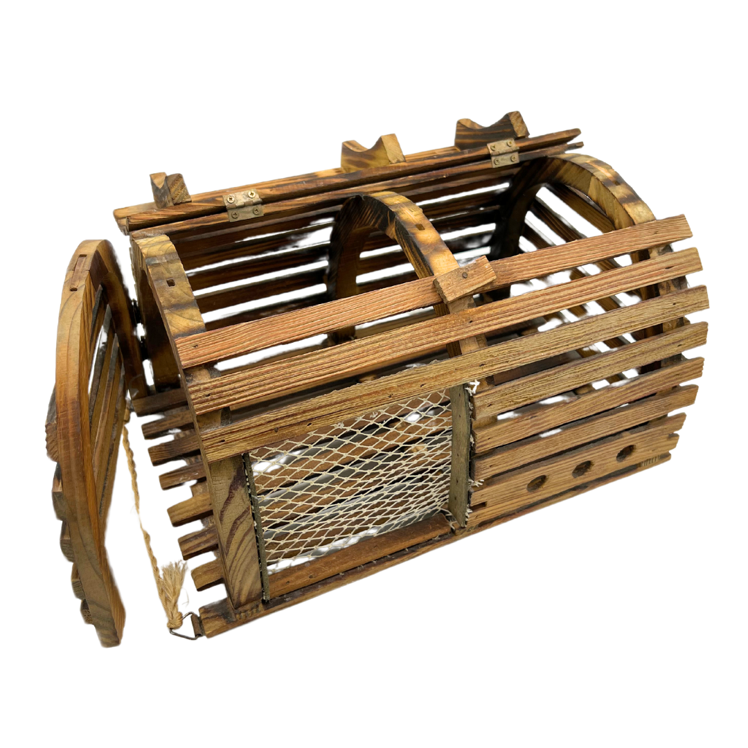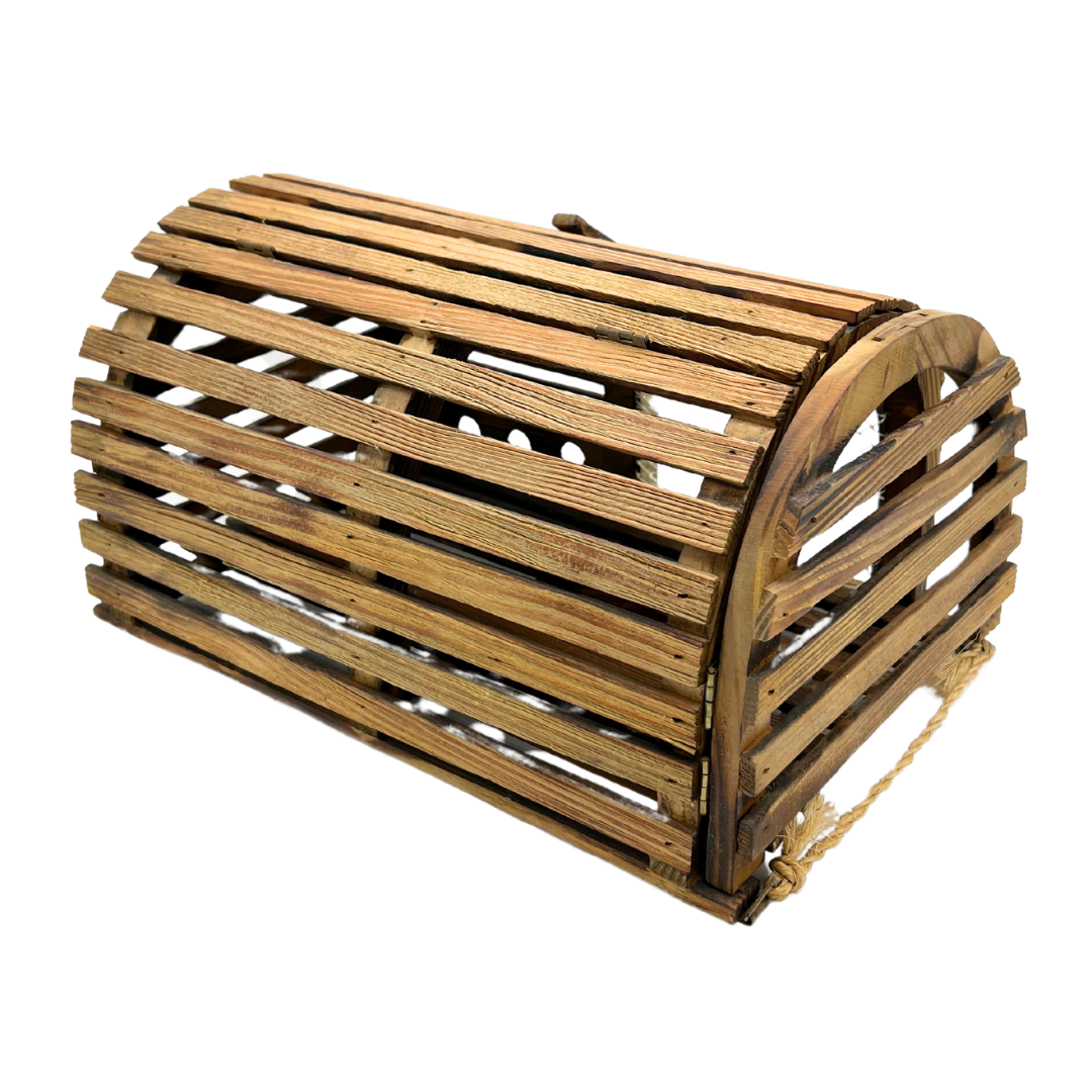 Mini wooden lobster trap. Top and side open. Age and origin unknown. Twine and hooks for wall hanging if desired. Side door doesn't clasp but top hatch door has a wooden toggle. Approximately 12.25" long x 6.5" high.