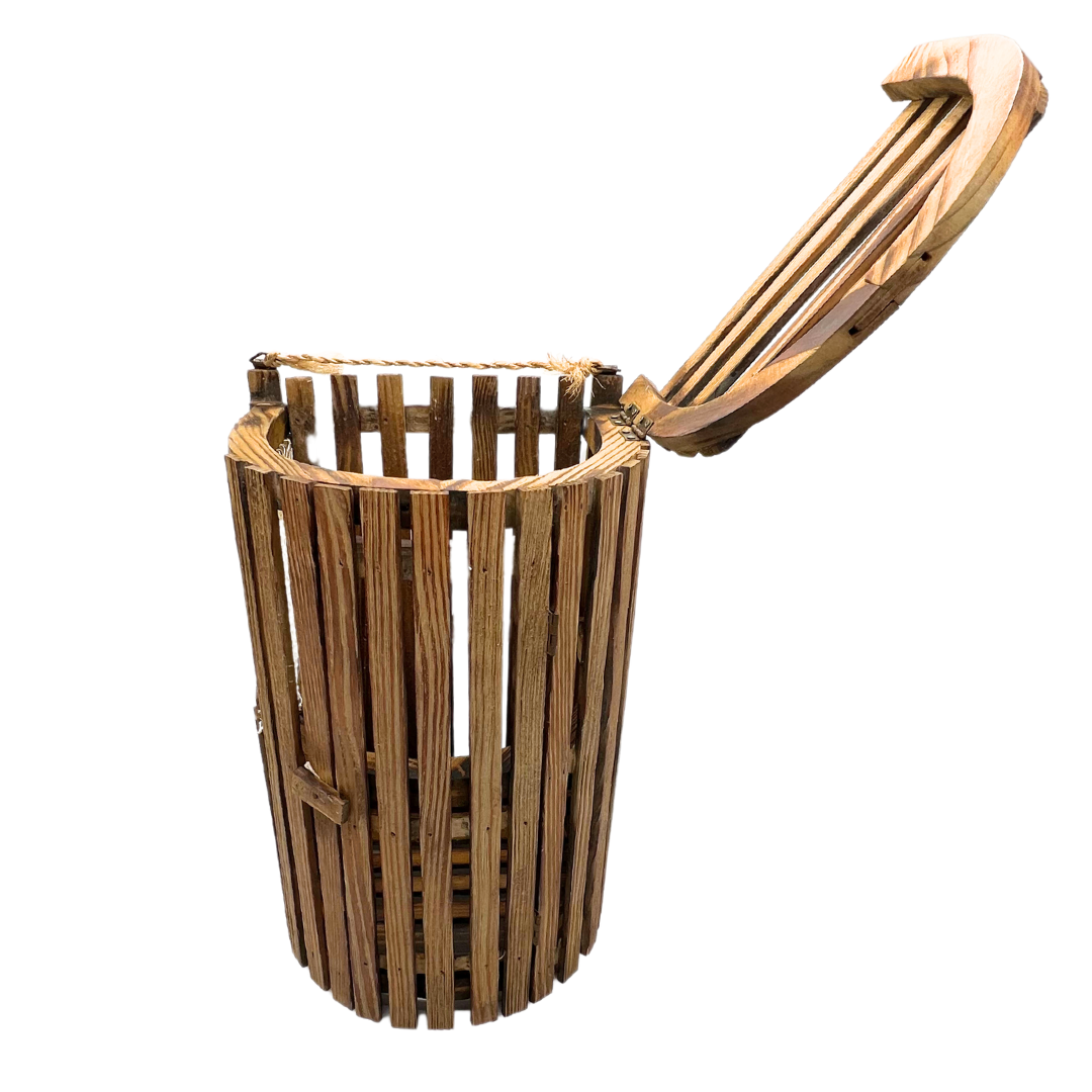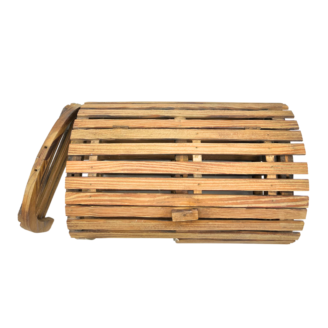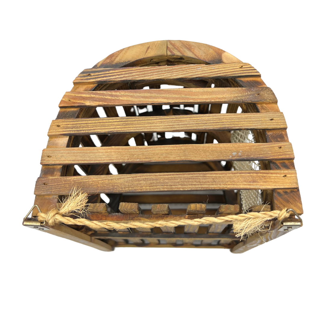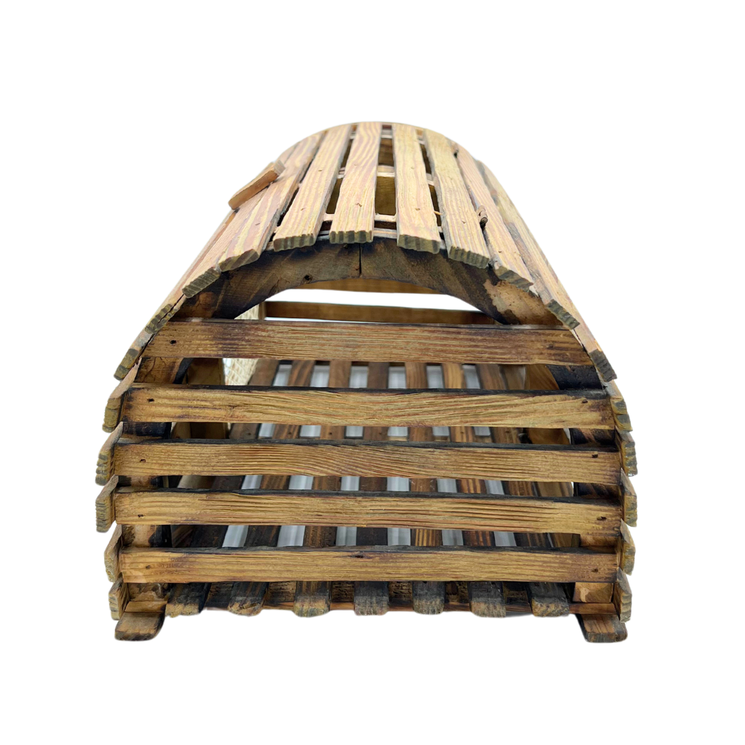 Mini wooden lobster trap. Top and side open. Age and origin unknown. Twine and hooks for wall hanging if desired. Side door doesn't clasp but top hatch door has a wooden toggle. Approximately 12.25" long x 6.5" high.