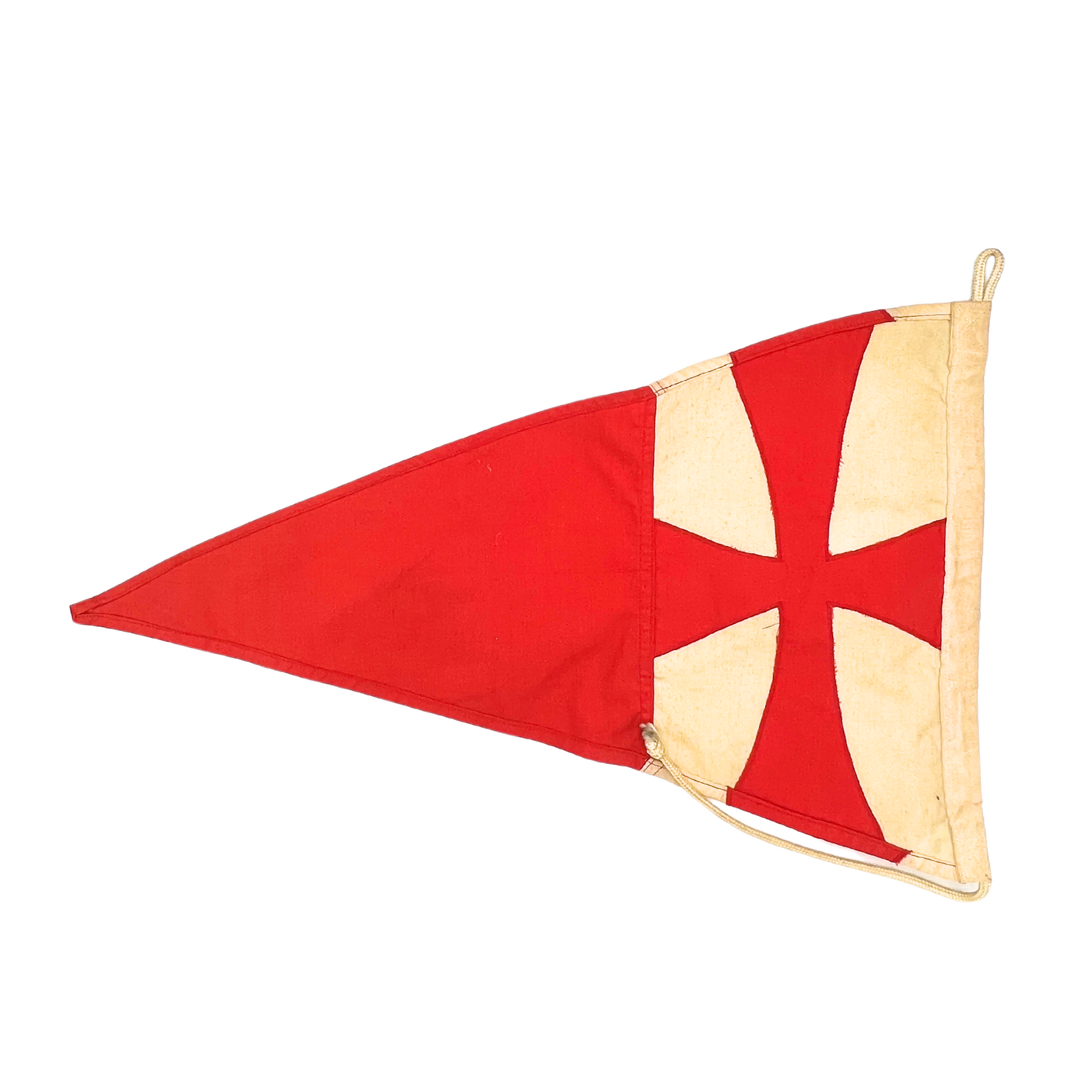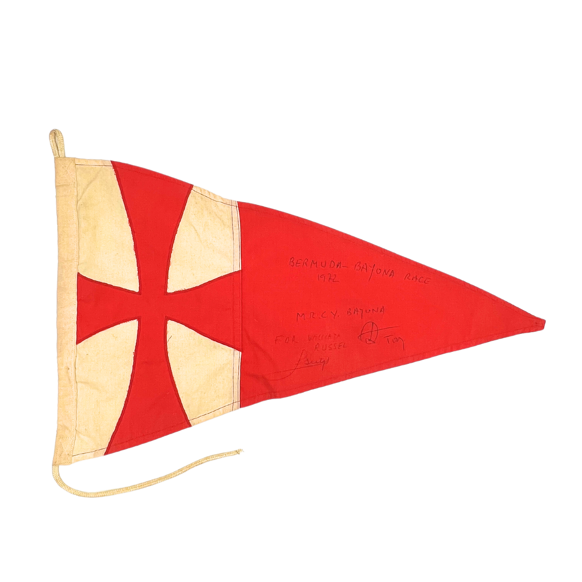 Authentic Monte Real Yacht Club cotton burgee from the Bermuda-Bayona Race (aka Discovery Regatta). The regatta was organized in 1972 by Monte Real Yacht Club, New York Yacht Club, Royal Bermuda Yacht Club, and Cruising Club of America. Flag is hand signed to commemorate the race. Rare find - great opportunity to own a piece of yachting history. Burgee is in good condition and approximately 21" long.