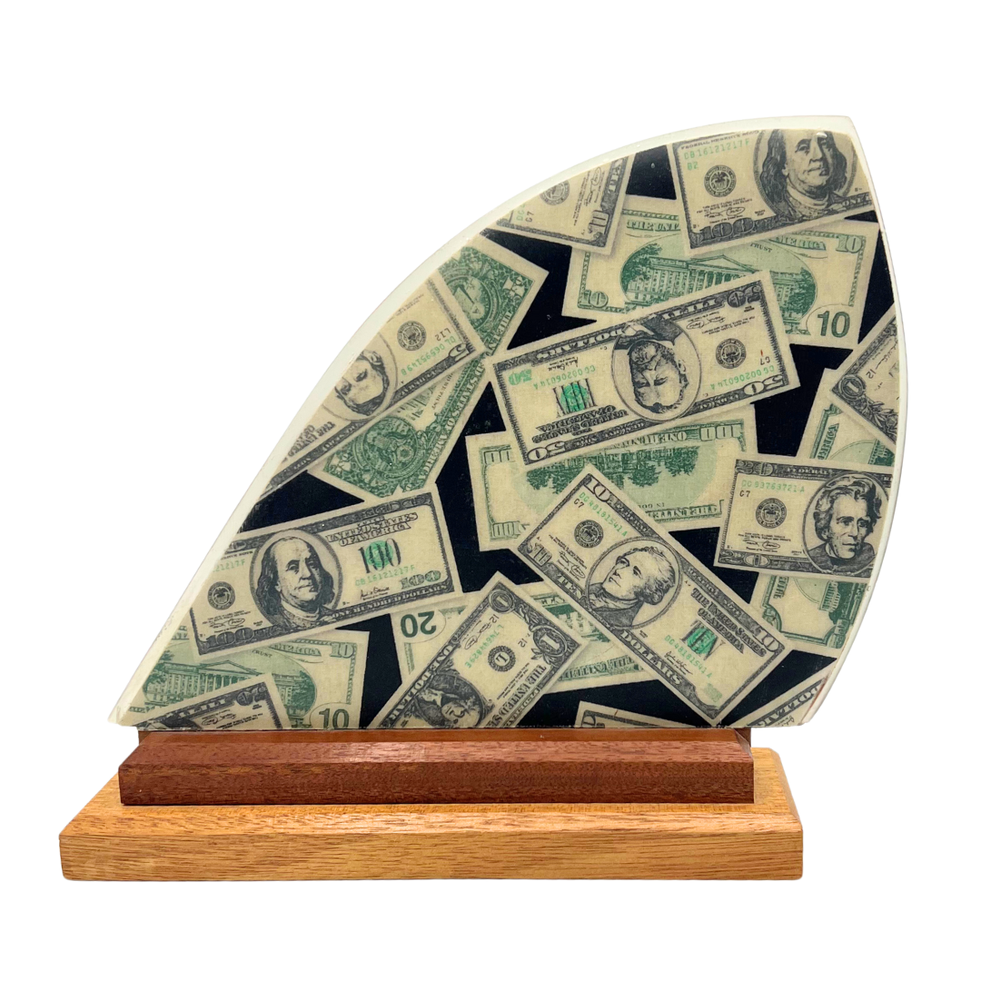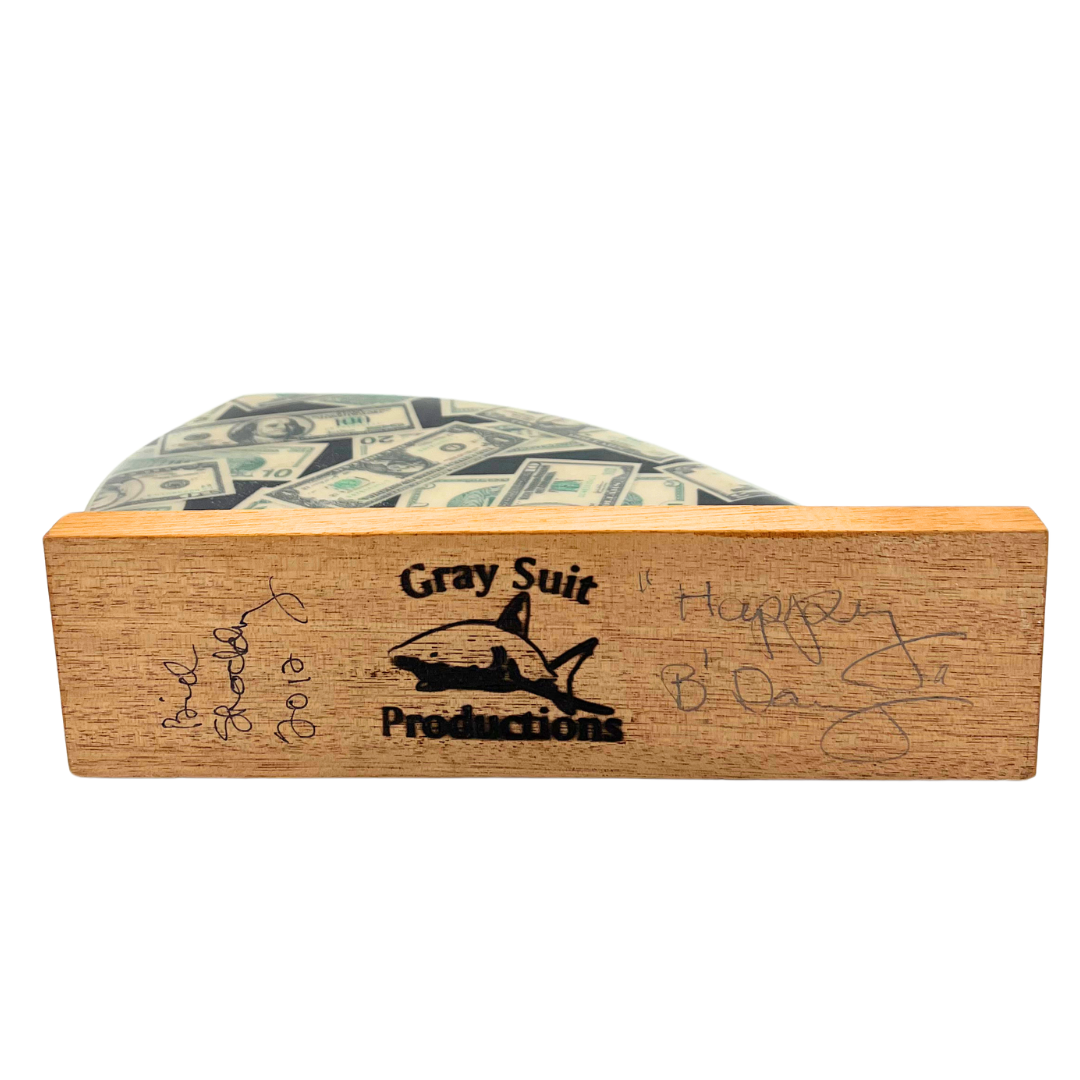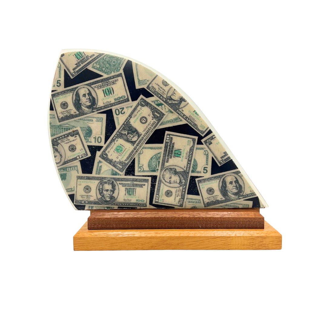 Fun surfboard fin with a dollar bill pattern mounted on a wooden base. Signed on bottom. Measures 13.5" x 11.5".