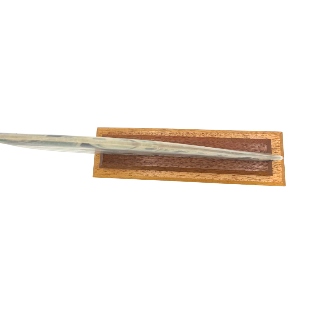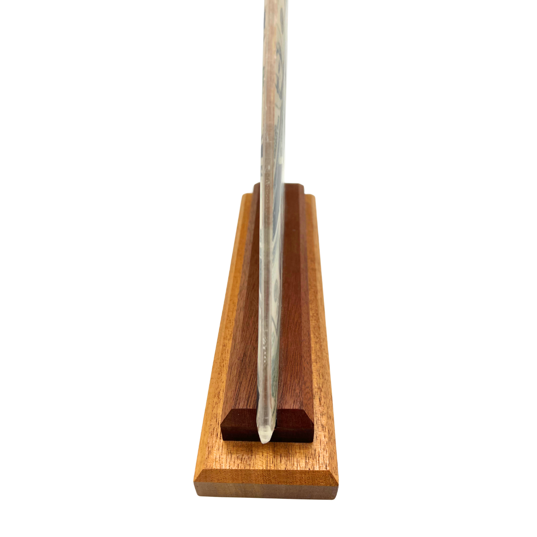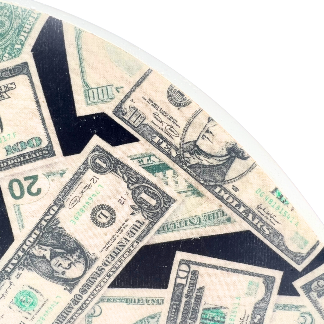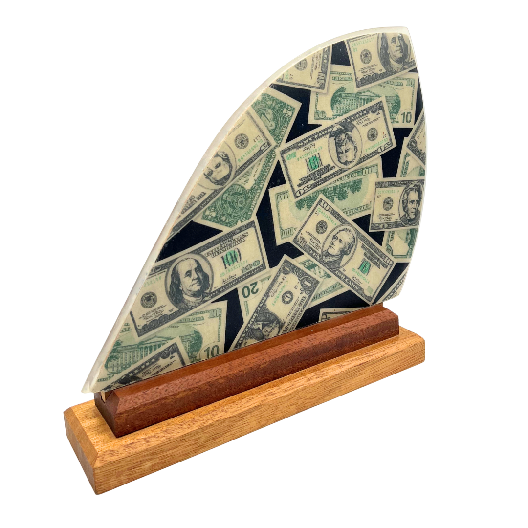 Fun surfboard fin with a dollar bill pattern mounted on a wooden base. Signed on bottom. Measures 13.5" x 11.5".