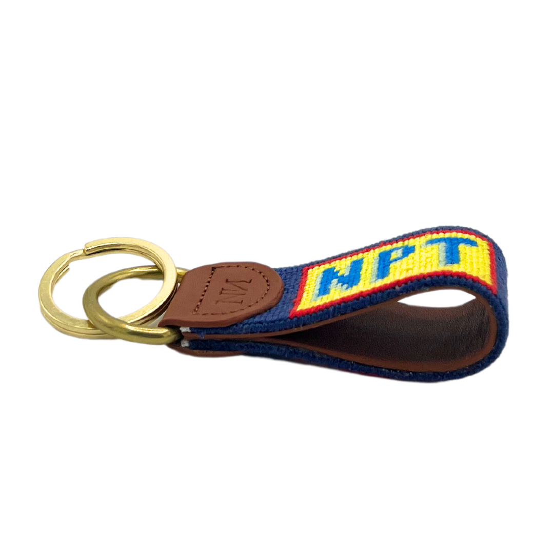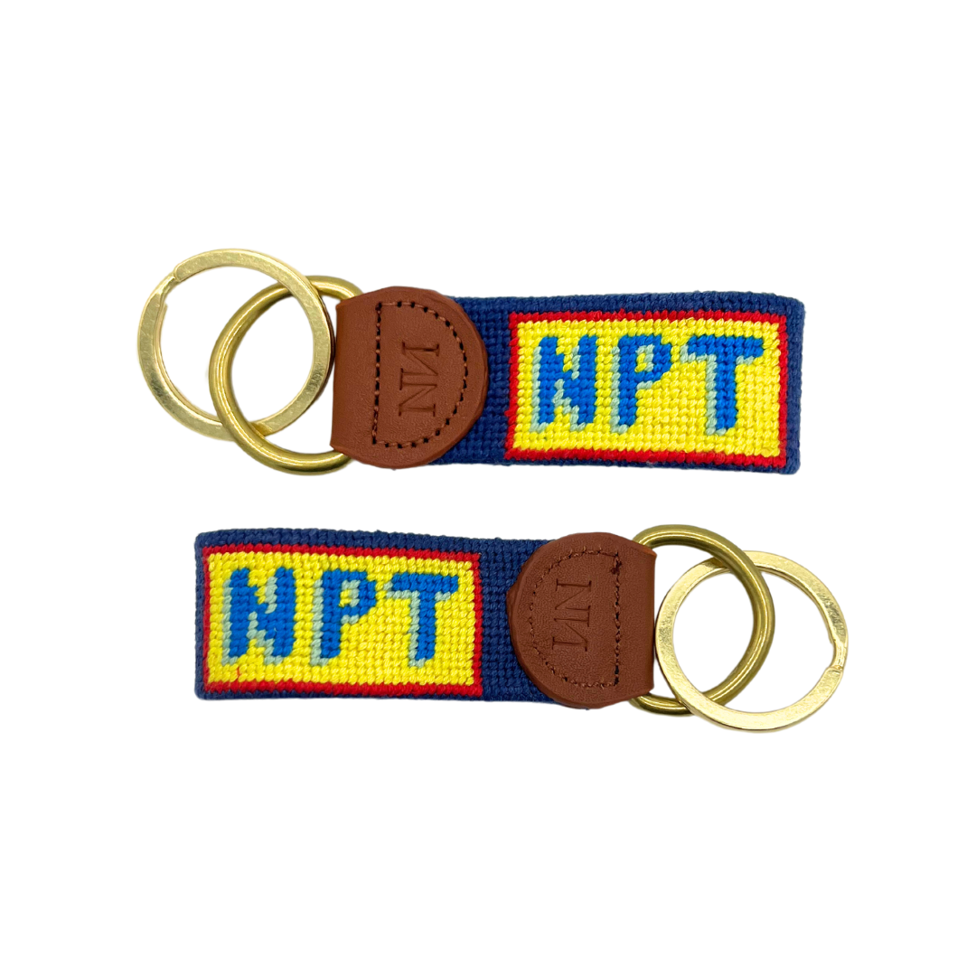 Hand-stitched needlepoint keychain. Keychain is crafted with tan leather and gold hardware. NPT (abbreviation for Newport) on a yellow and blue background.