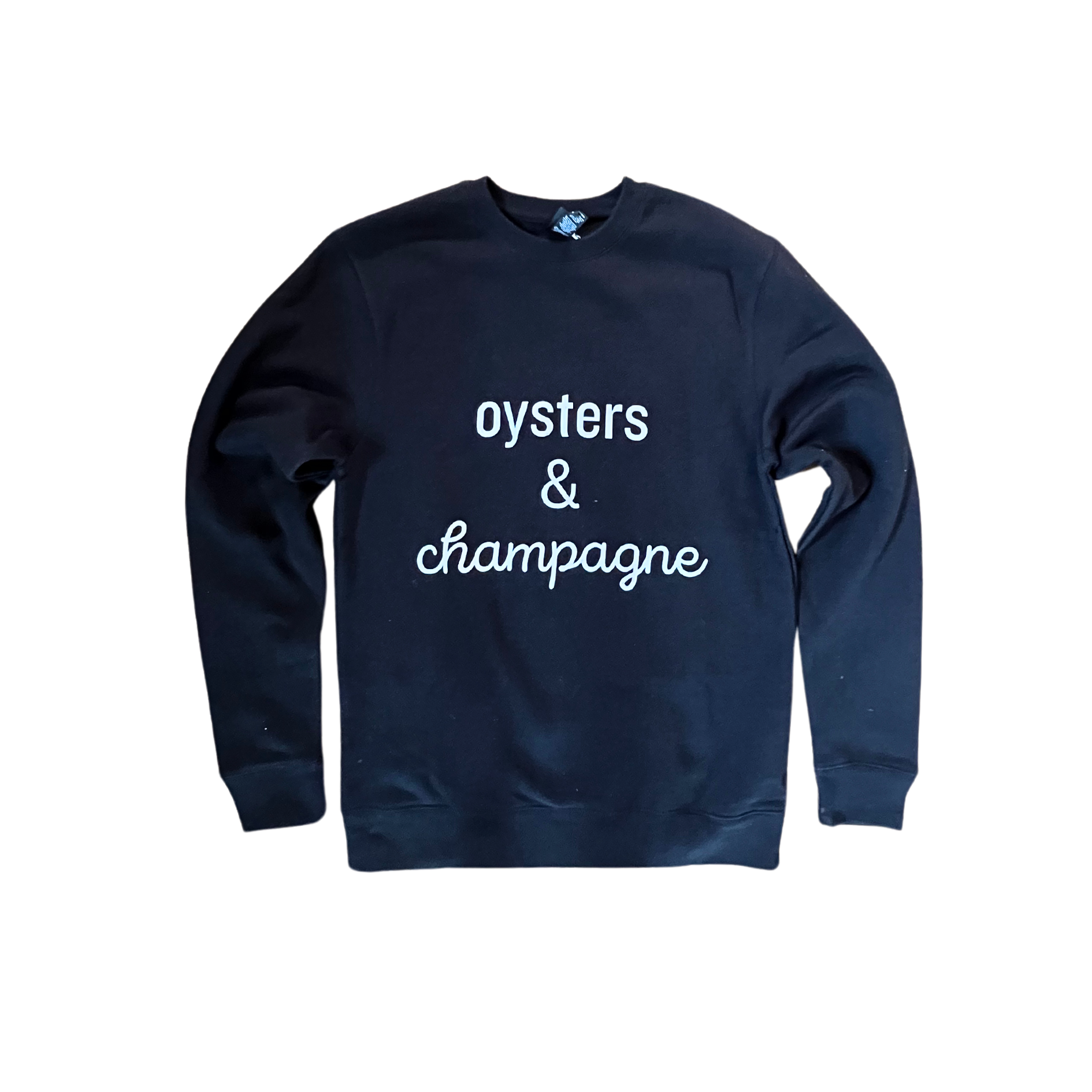 Oysters & champagne sweatshirt. Black color. Soft and cozy. Adult unisex fit - recommend sizing up for mens.