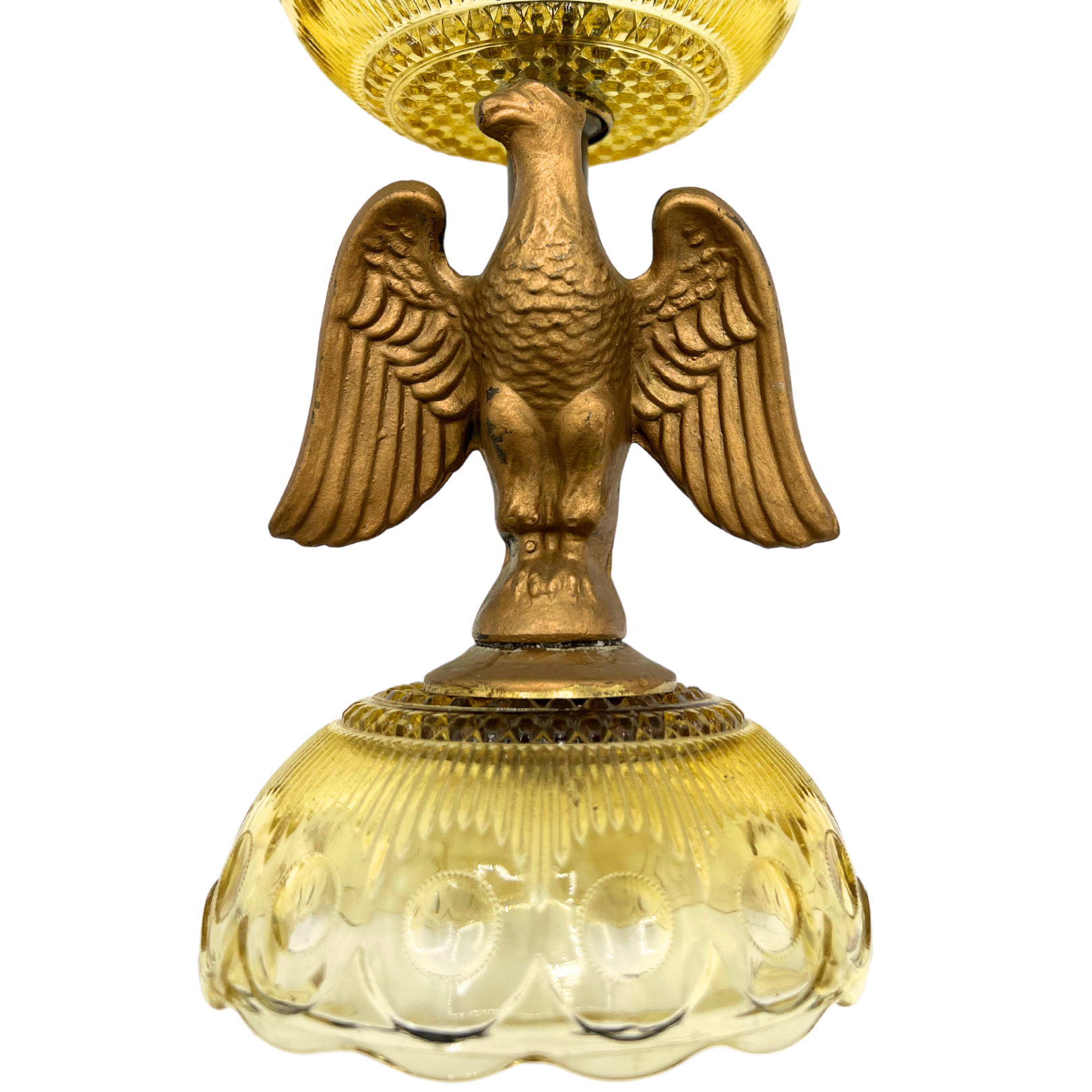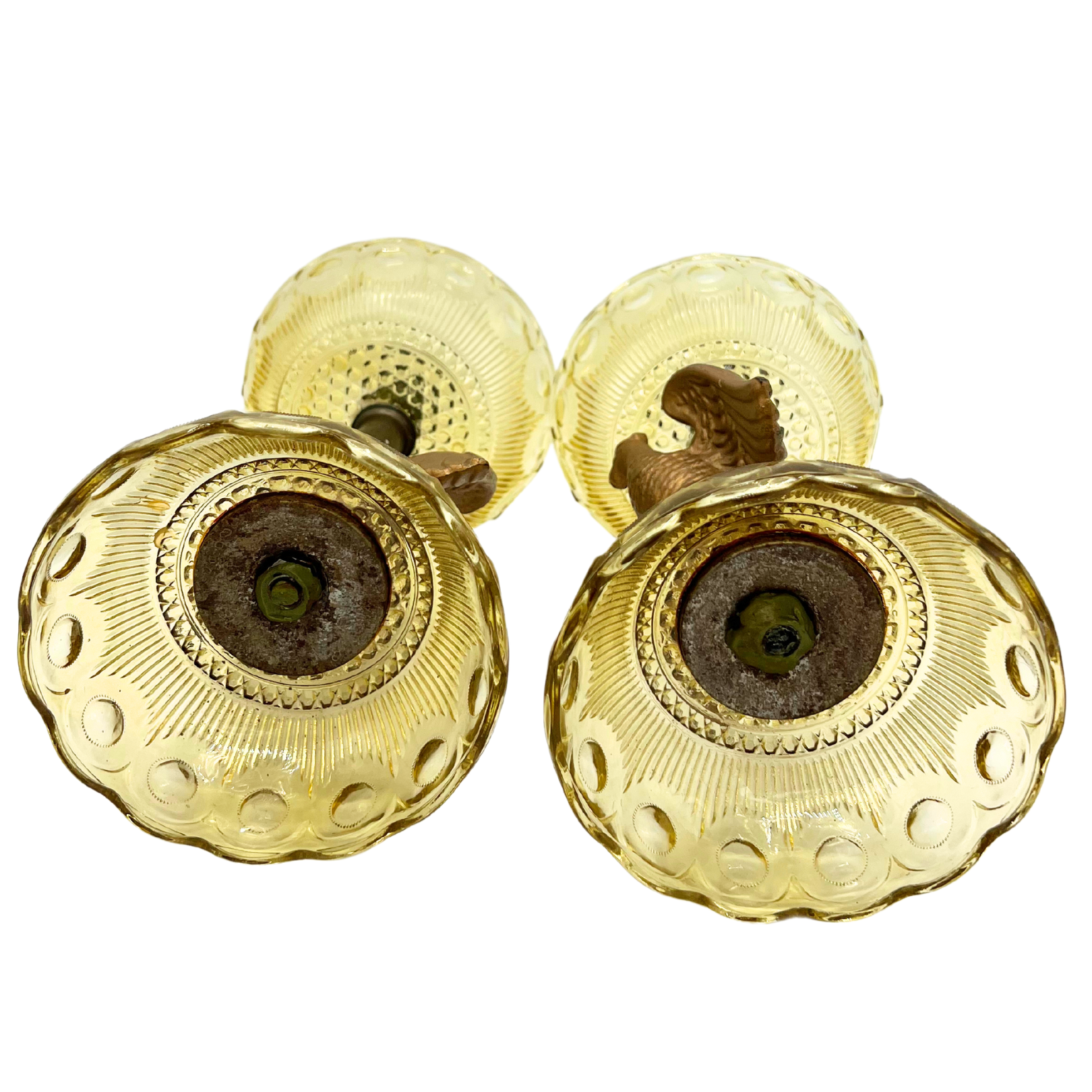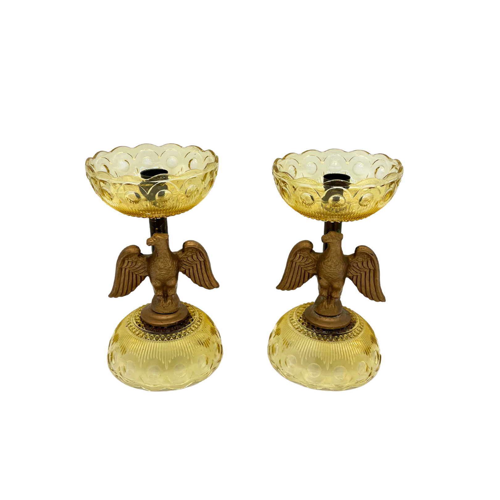 Beautiful pair of vintage candlesticks. Estimated 1950s. Made with amber glass on the bottoms and tops with gold metal eagles in the centers. Some wear within the candle holder part of the candlestick due to use but overall good vintage condition. Rare style. 8" high.