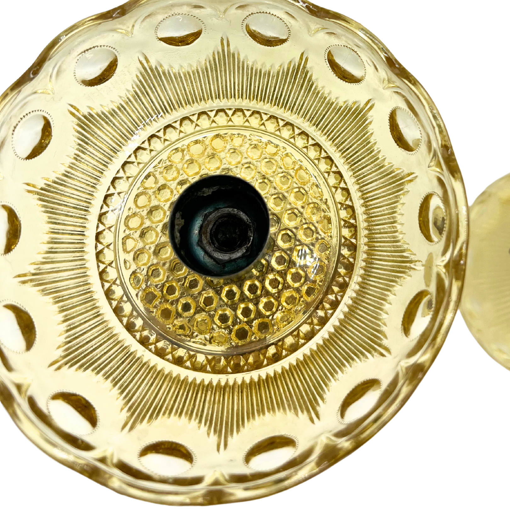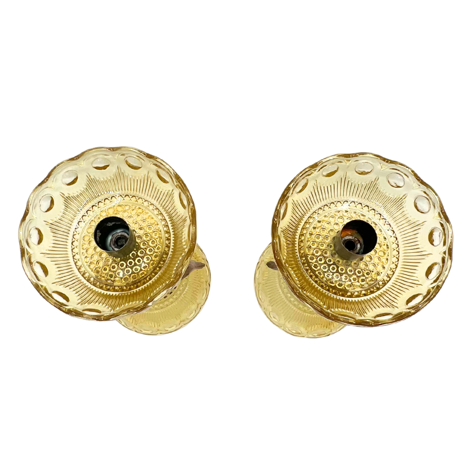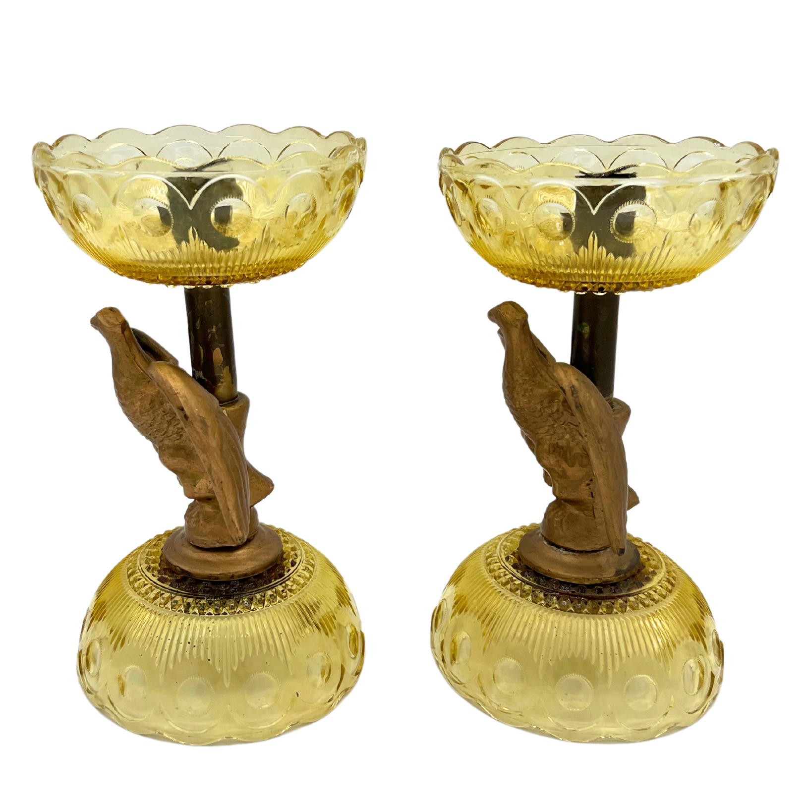 Beautiful pair of vintage candlesticks. Estimated 1950s. Made with amber glass on the bottoms and tops with gold metal eagles in the centers. Some wear within the candle holder part of the candlestick due to use but overall good vintage condition. Rare style. 8" high.
