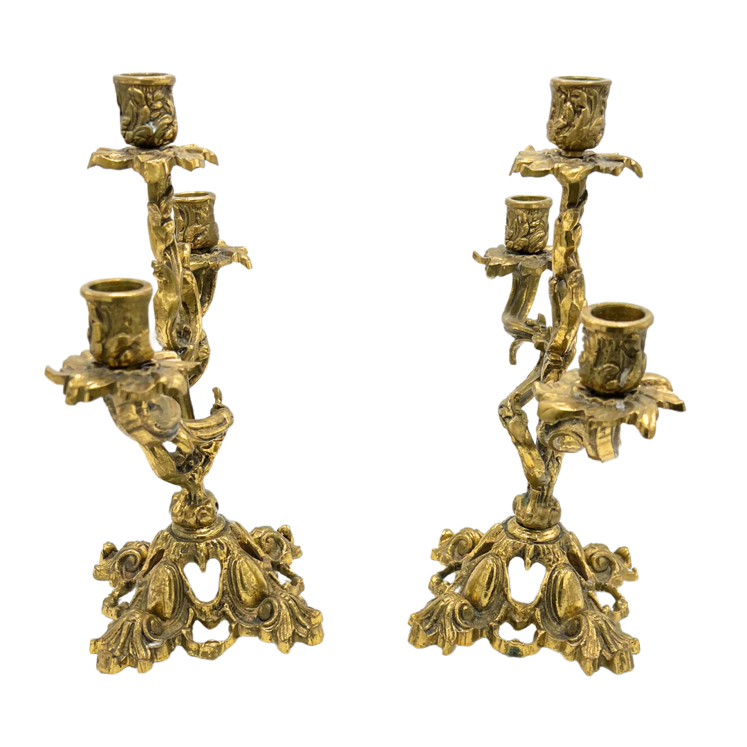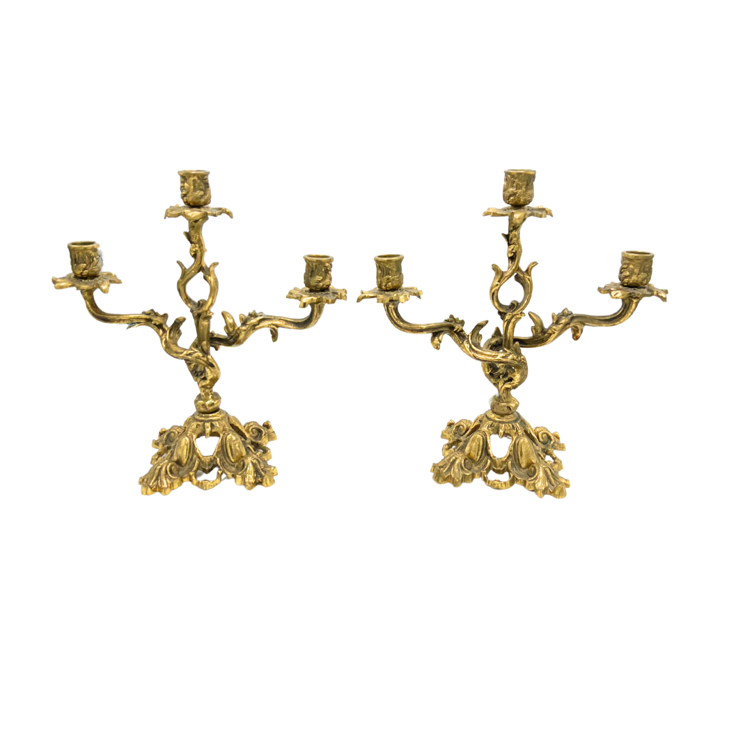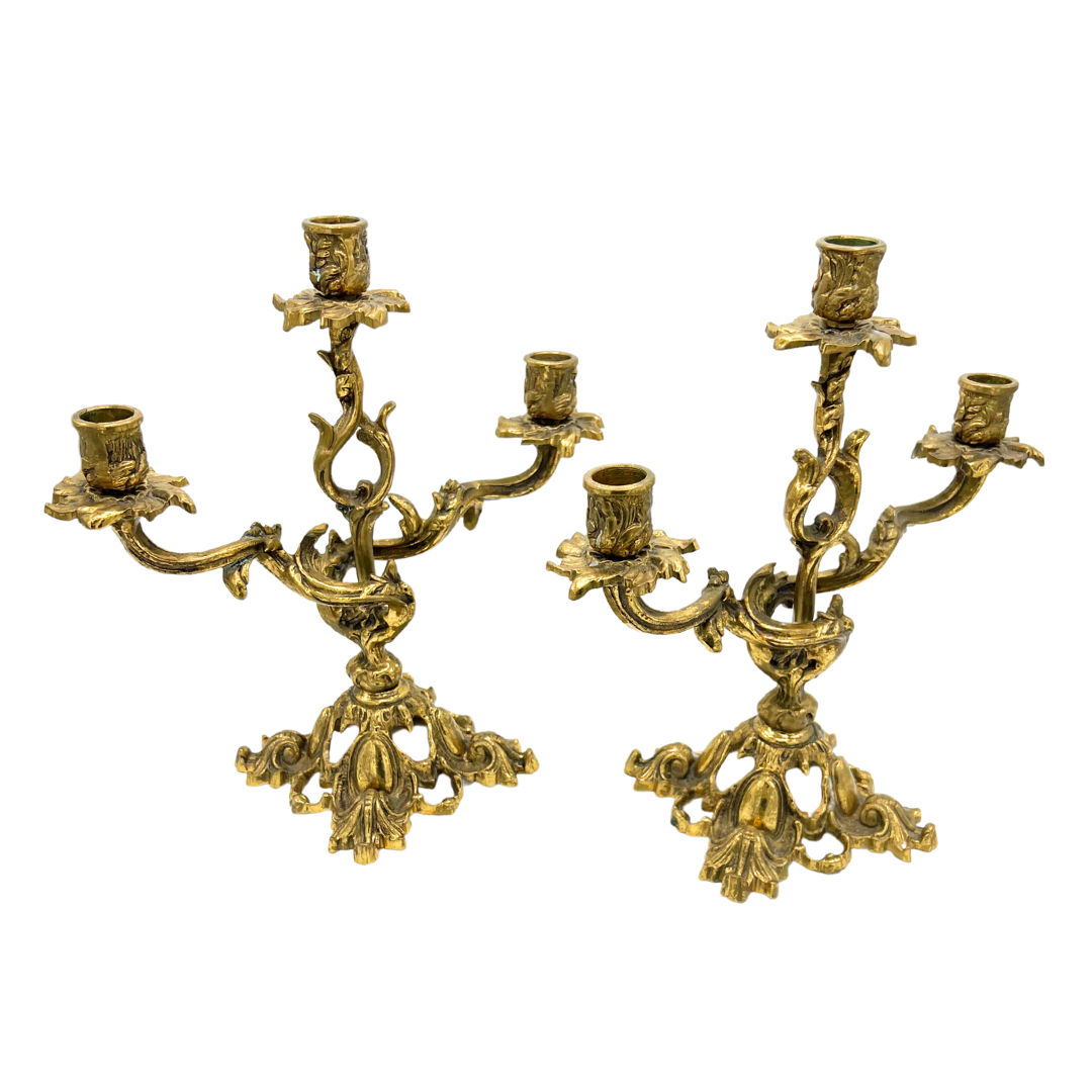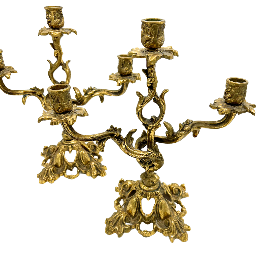 Pair of ornate brass candlesticks. Statement pieces with lovely details. Candle sockets can be unscrewed for cleaning - see pics. Slight patina, estimated early-mid century. Heavy and solid - each candlestick weighs over 3.5 lbs and measures approximately 11.5" tall by 11" wide.