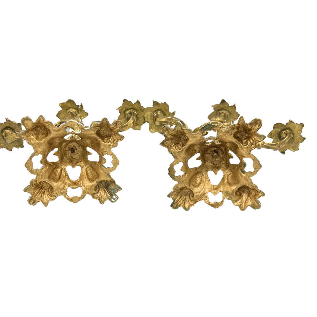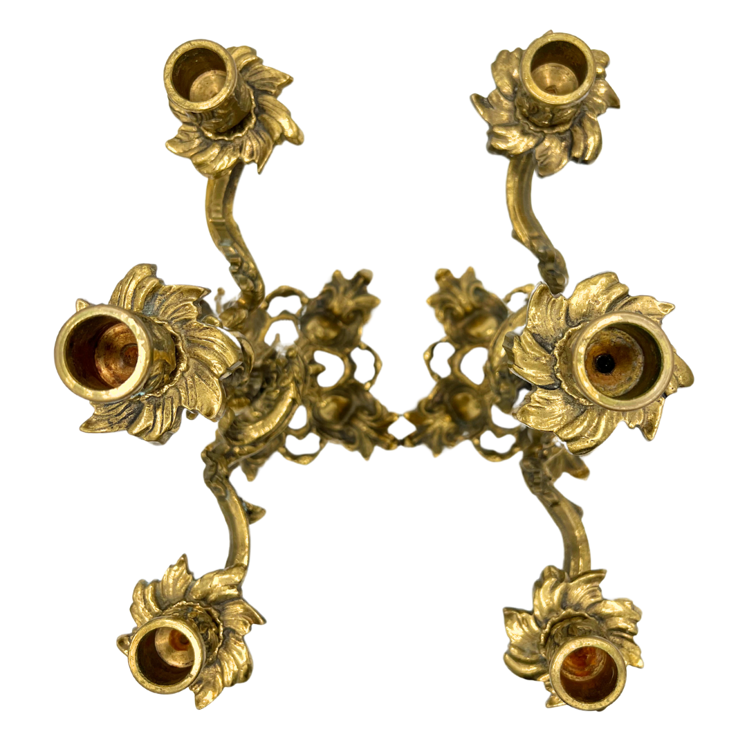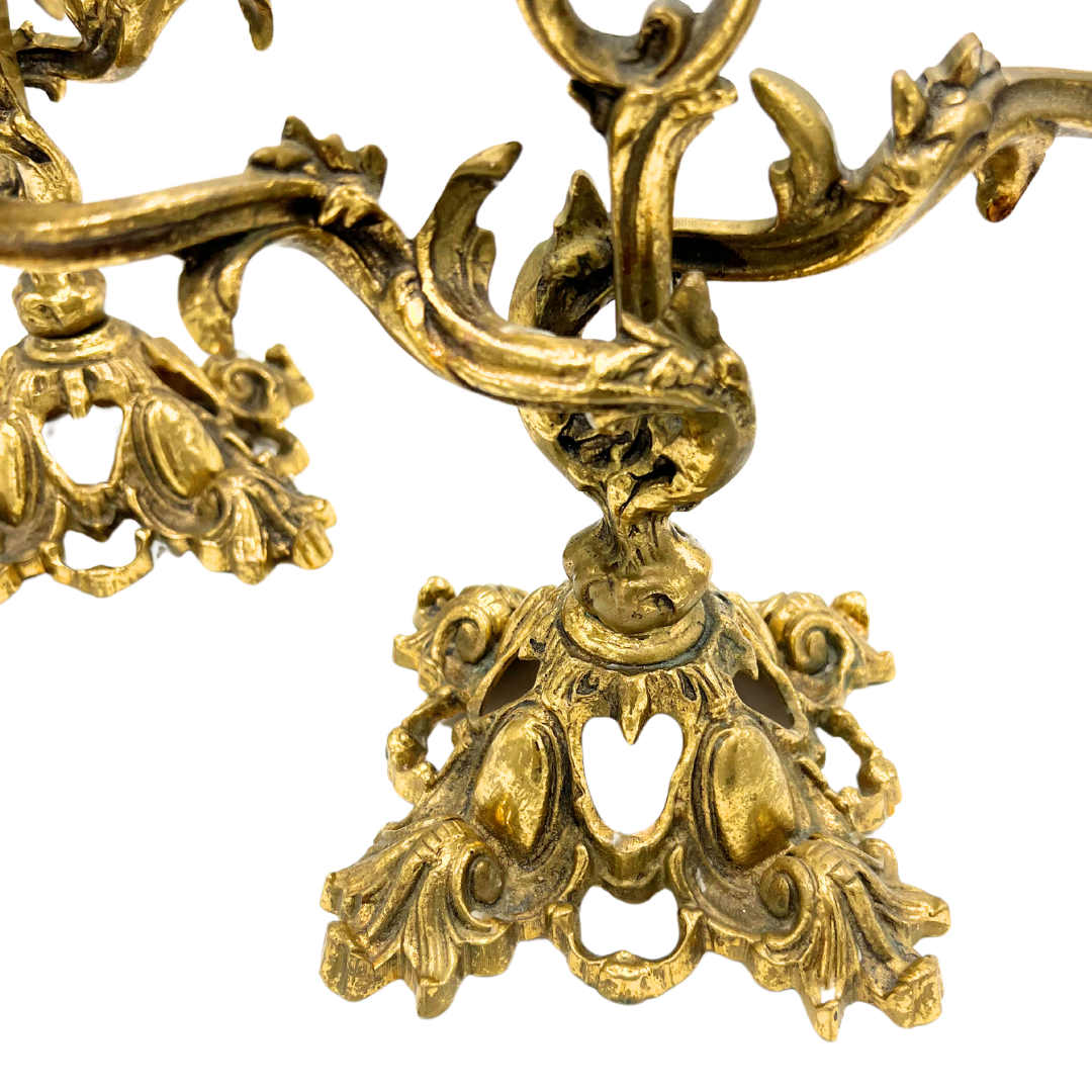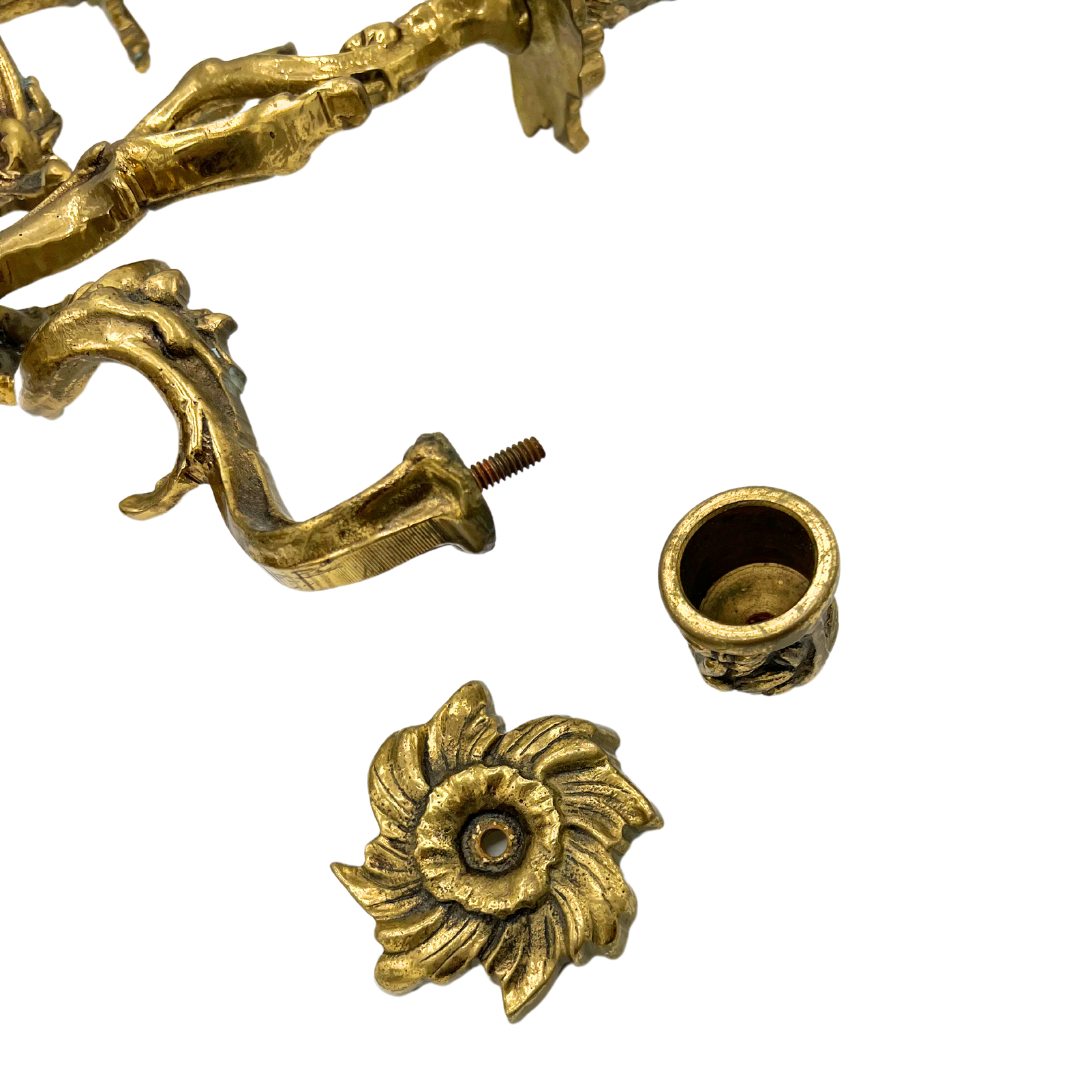 Pair of ornate brass candlesticks. Statement pieces with lovely details. Candle sockets can be unscrewed for cleaning - see pics. Slight patina, estimated early-mid century. Heavy and solid - each candlestick weighs over 3.5 lbs and measures approximately 11.5" tall by 11" wide.