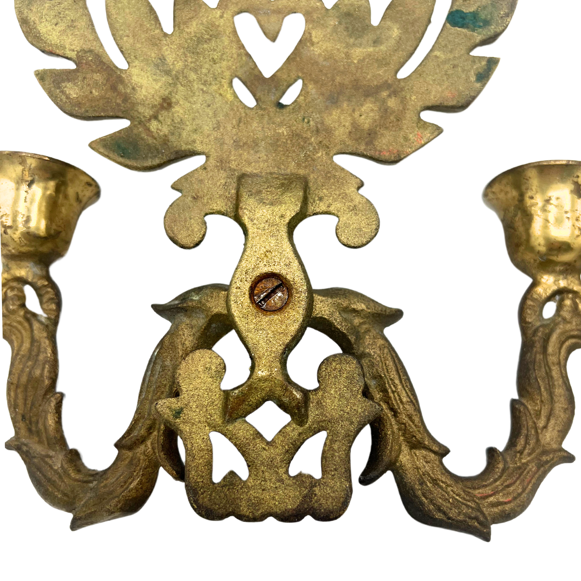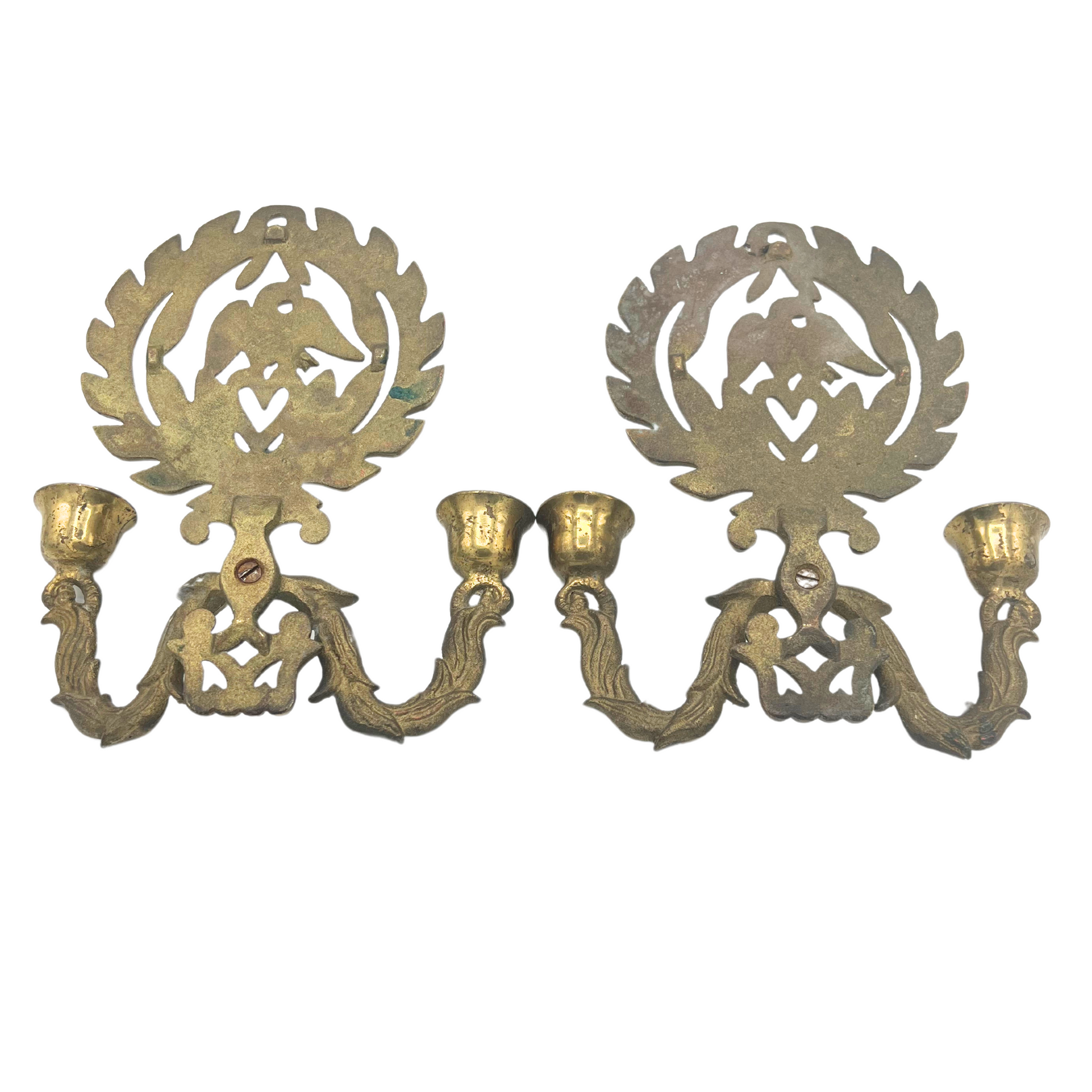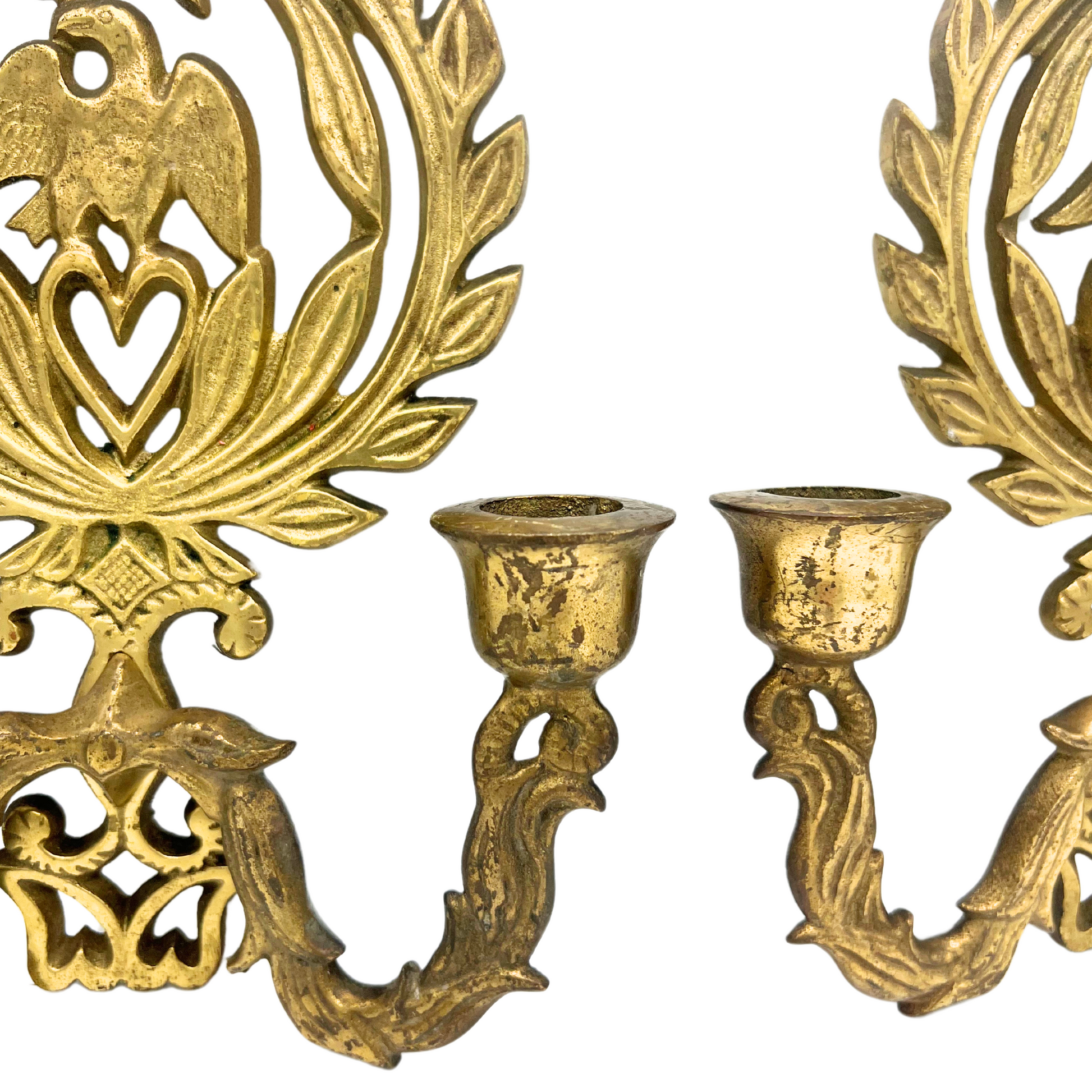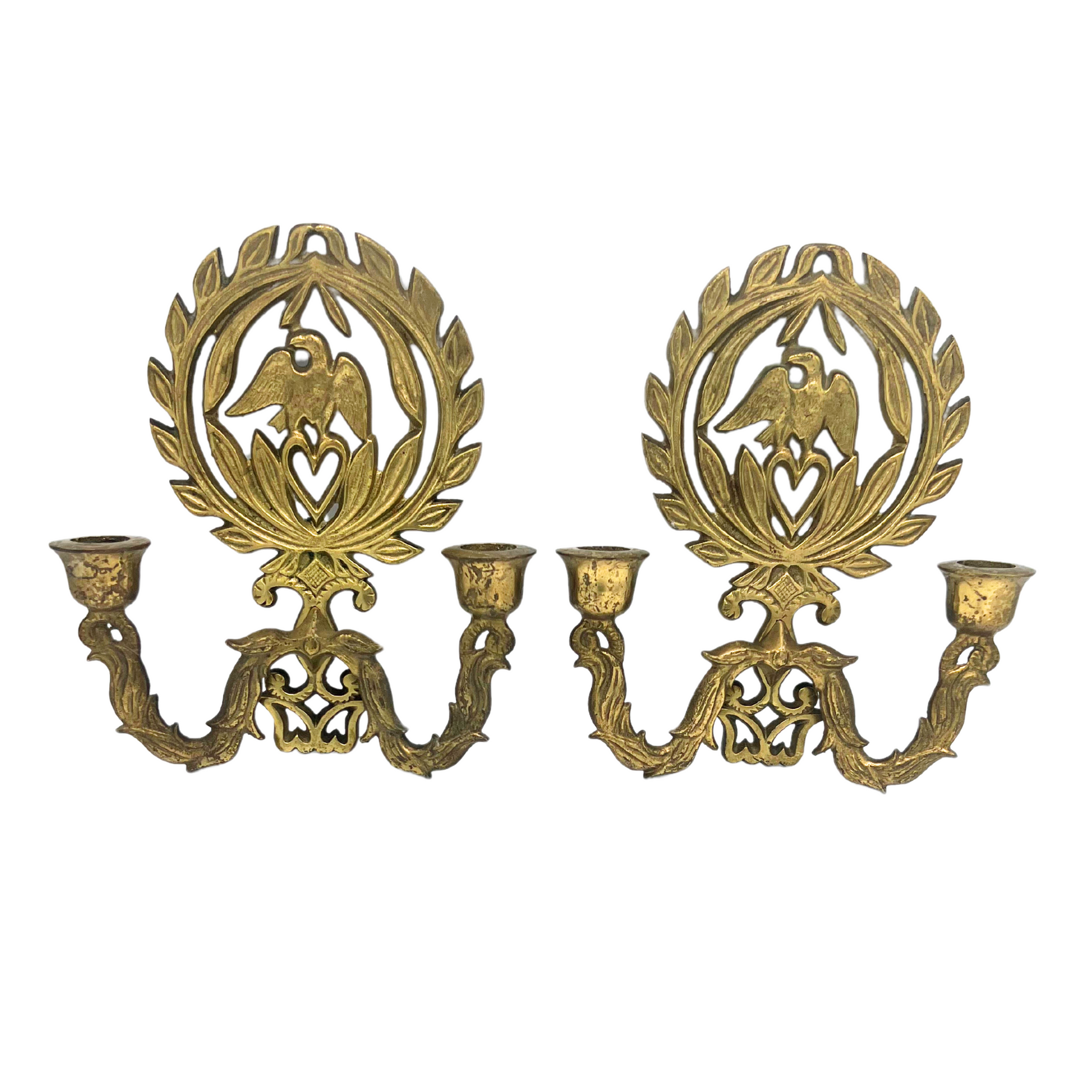 Pair of vintage brass candle holder wall sconces. Federal eagle style. Heavy and solid - each sconce weighs over 2 lbs. Some wear/patina consistent with age. Each sconce is approximately 8.5" tall x 8.25" wide.