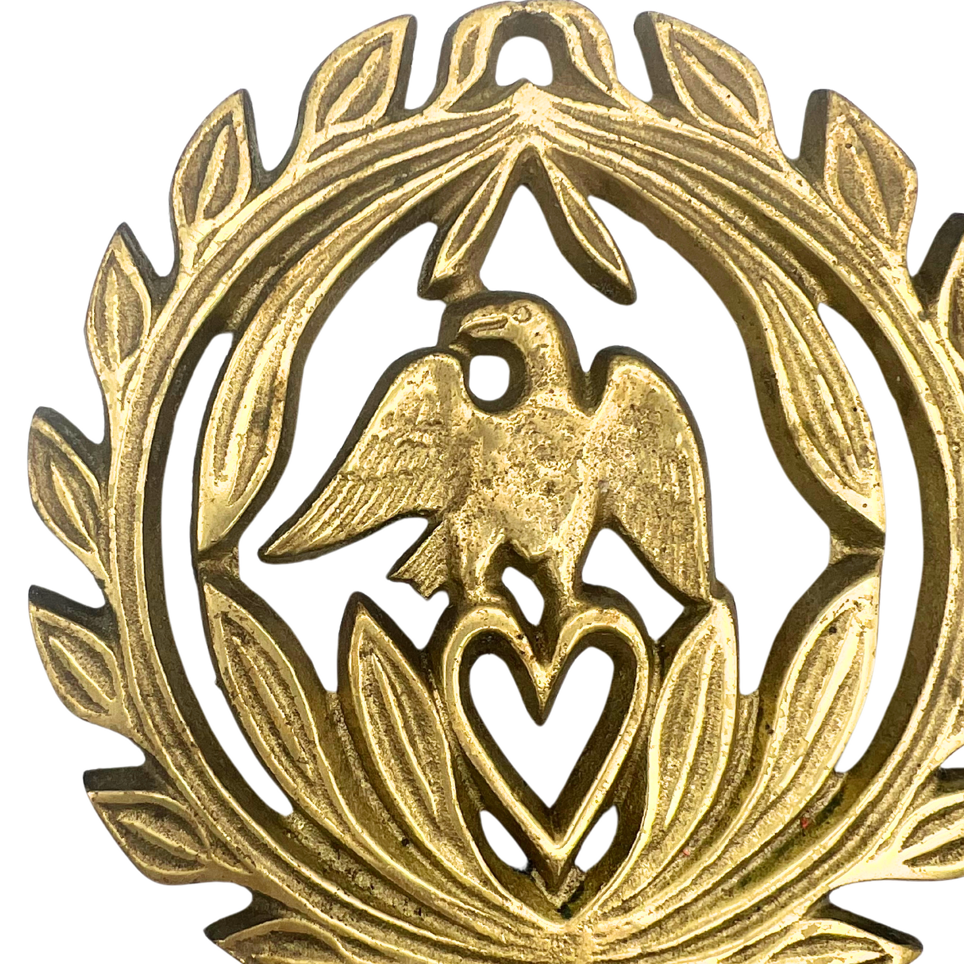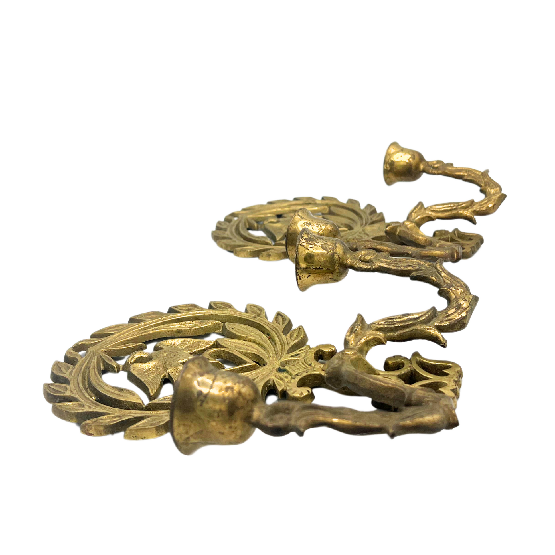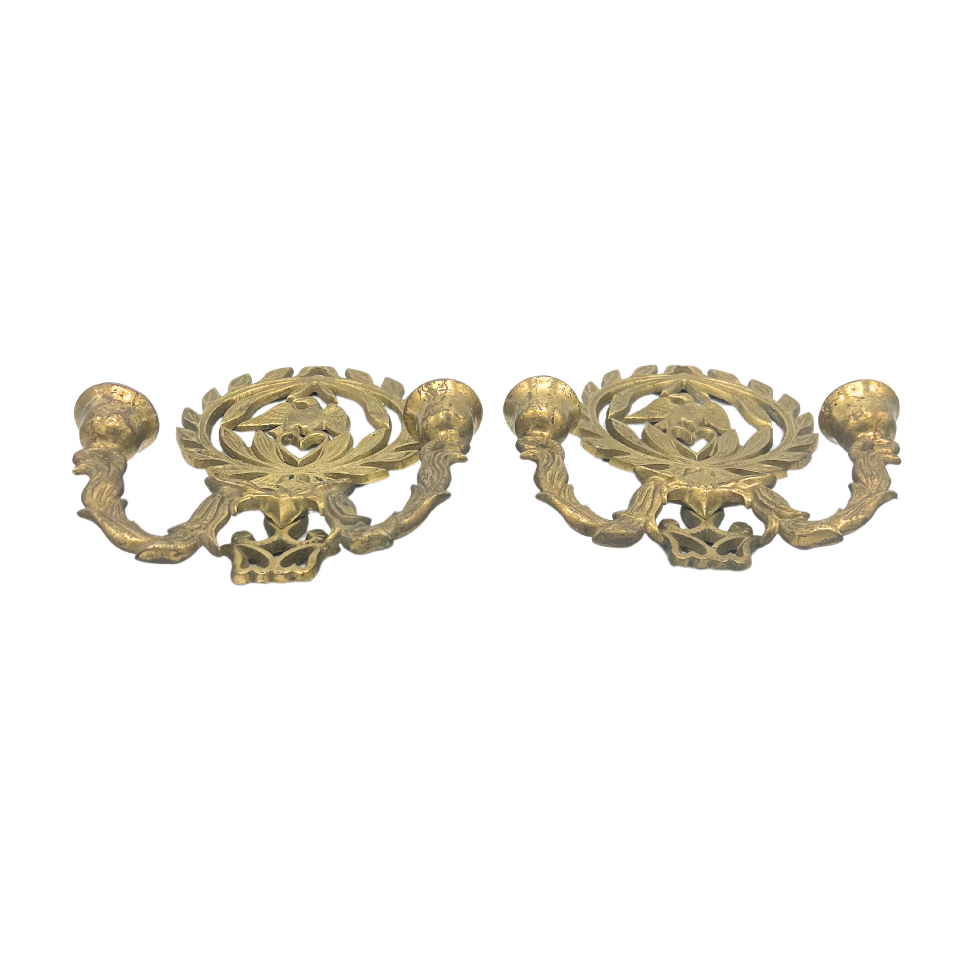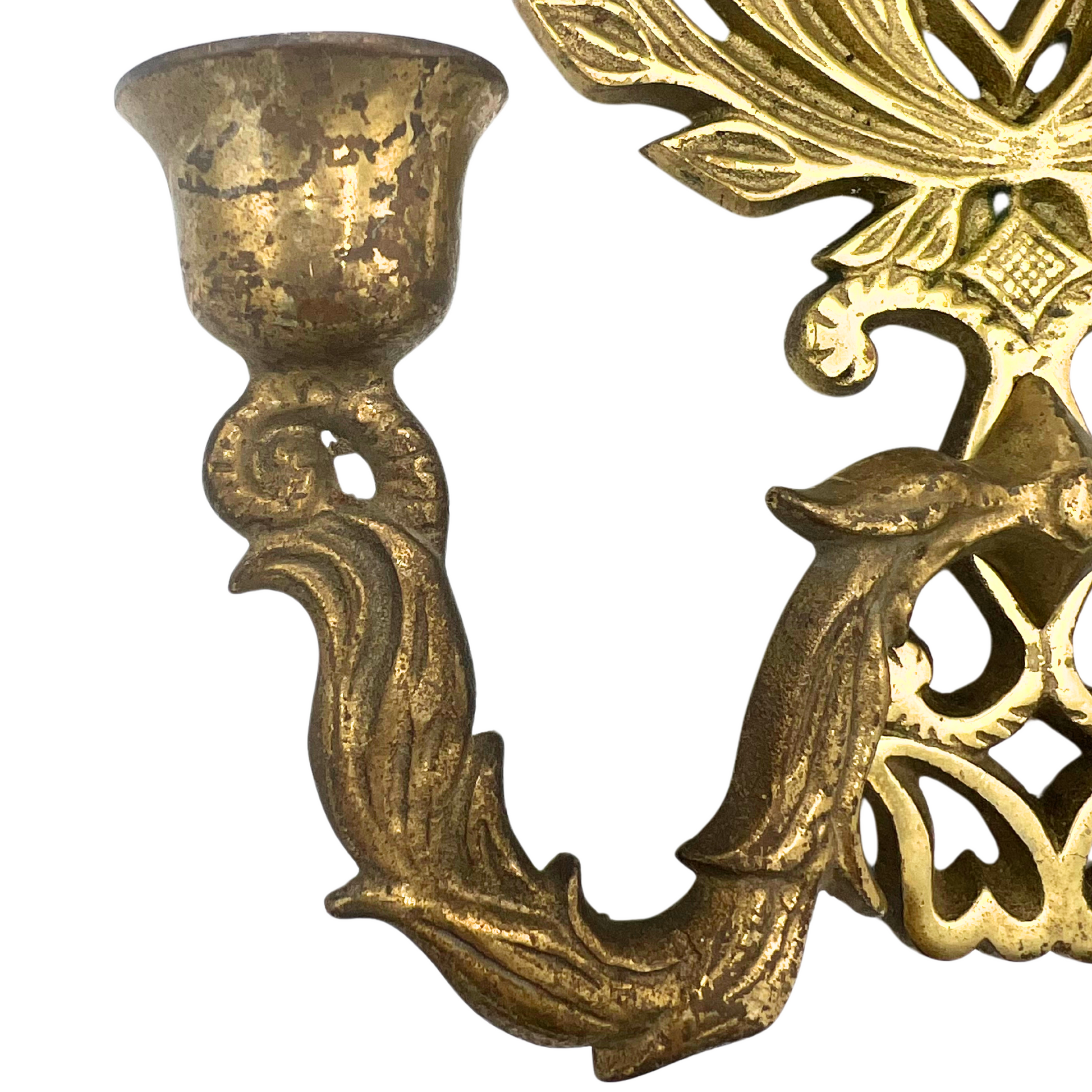 Pair of vintage brass candle holder wall sconces. Federal eagle style. Heavy and solid - each sconce weighs over 2 lbs. Some wear/patina consistent with age. Each sconce is approximately 8.5" tall x 8.25" wide.