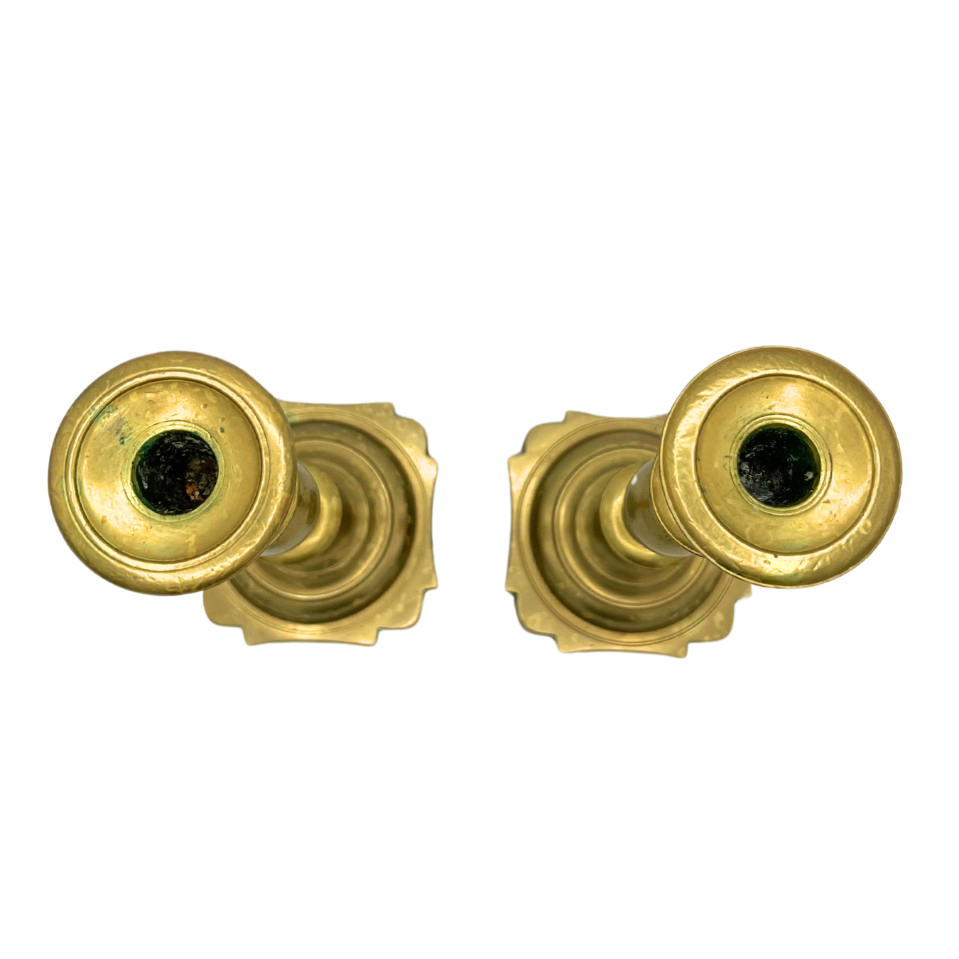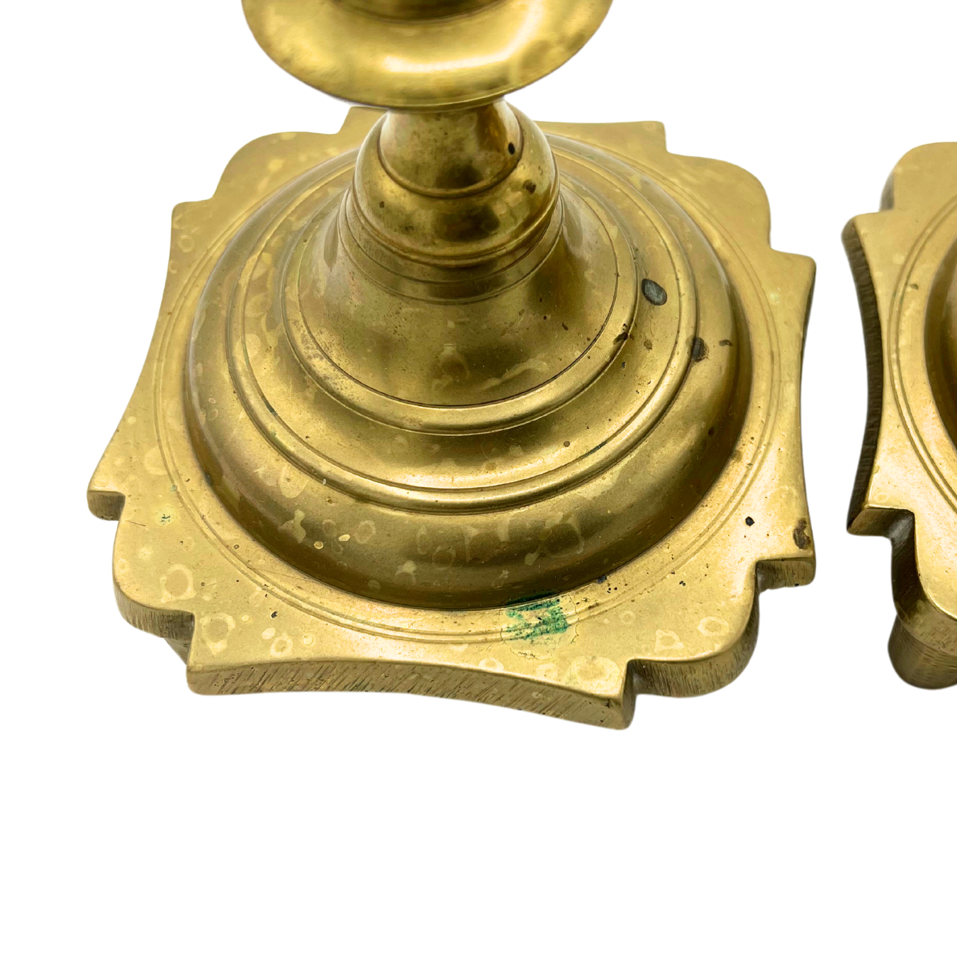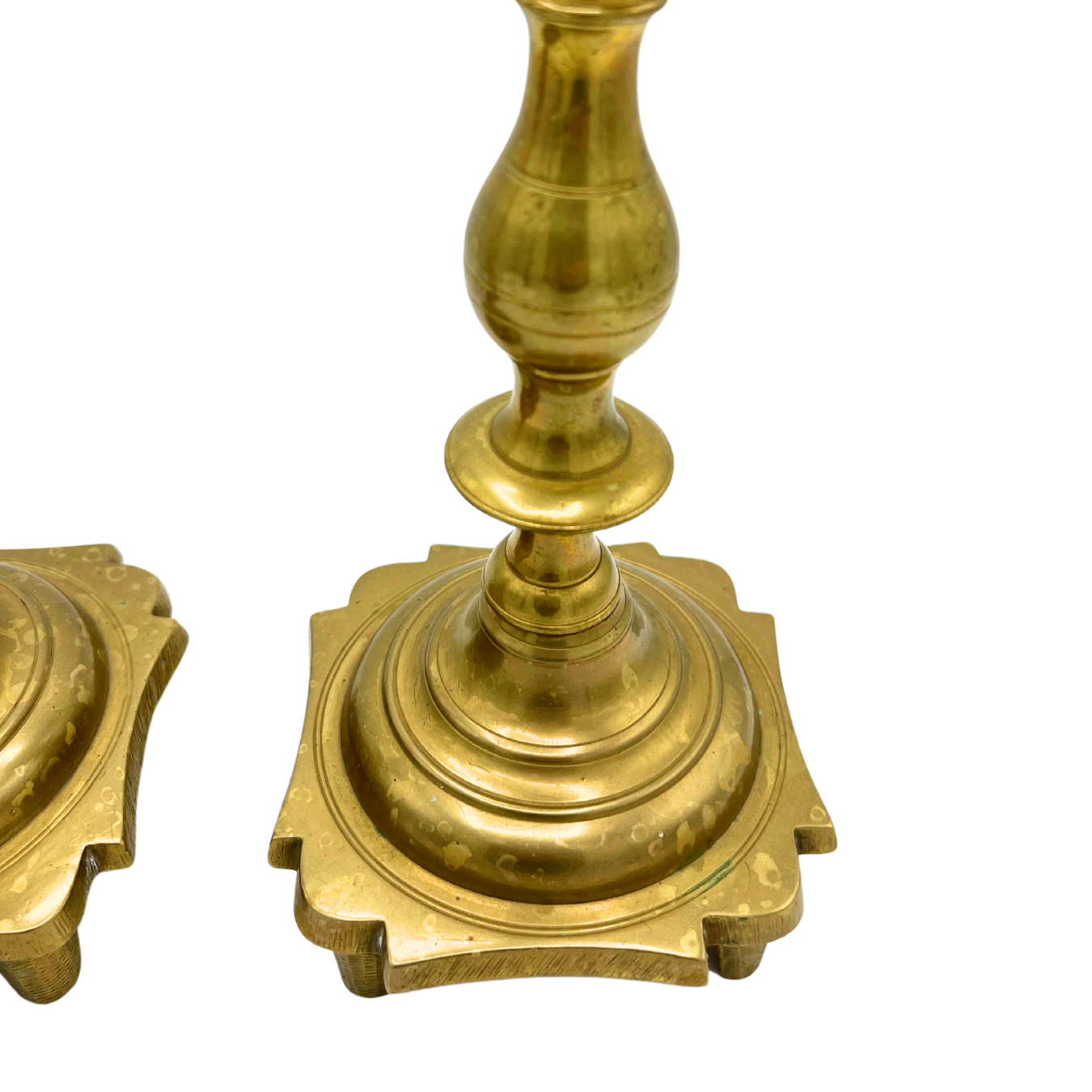 Vintage pair of classic, heirloom quality brass candlesticks. Slight patina starting to form with some wax marks due to use. Overall beautiful candlesticks in good vintage condition. Each candlestick weighs over 3.5 lbs and measures 11" tall.