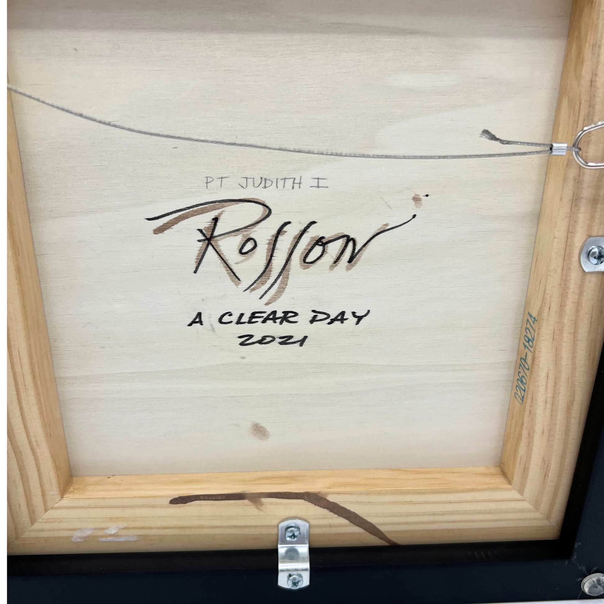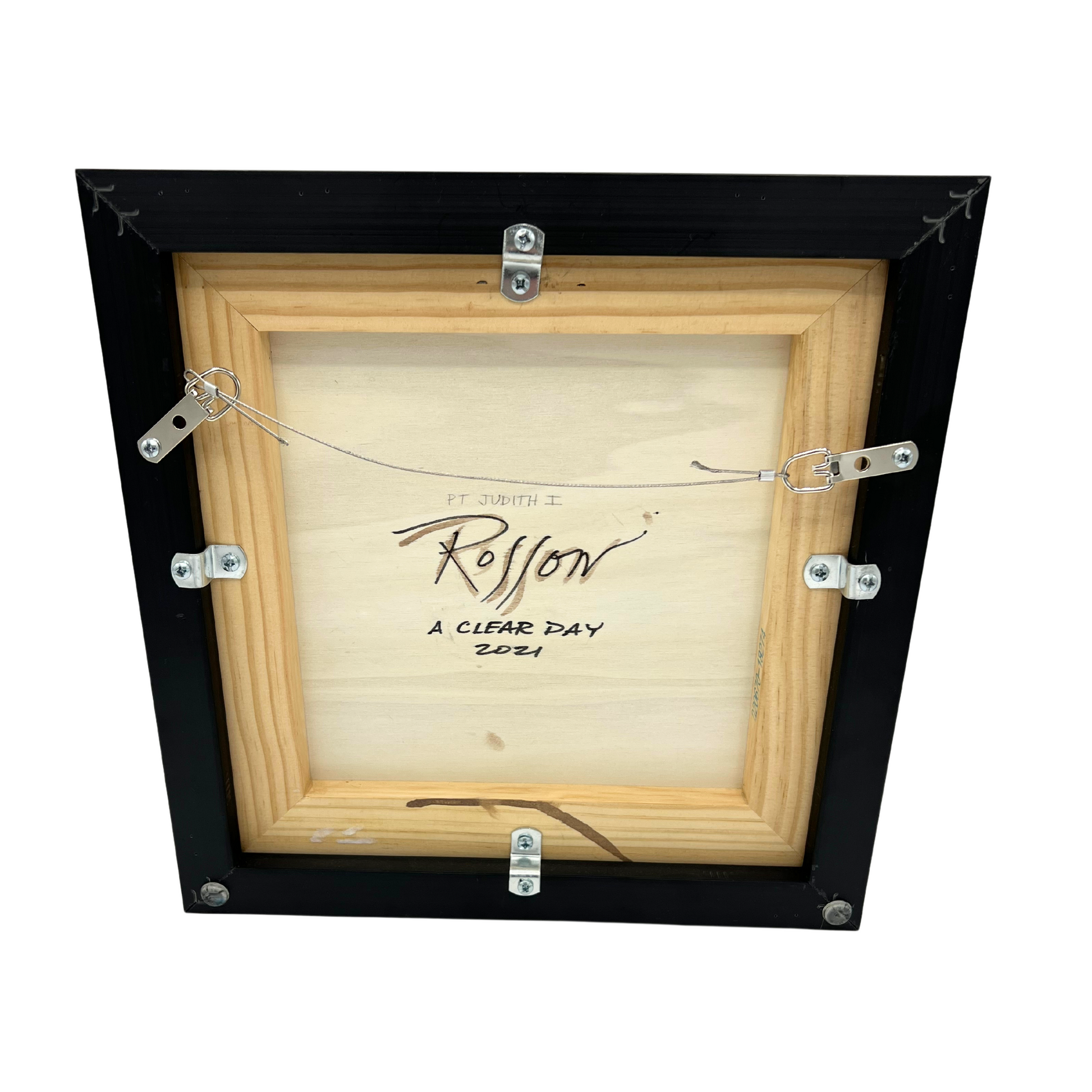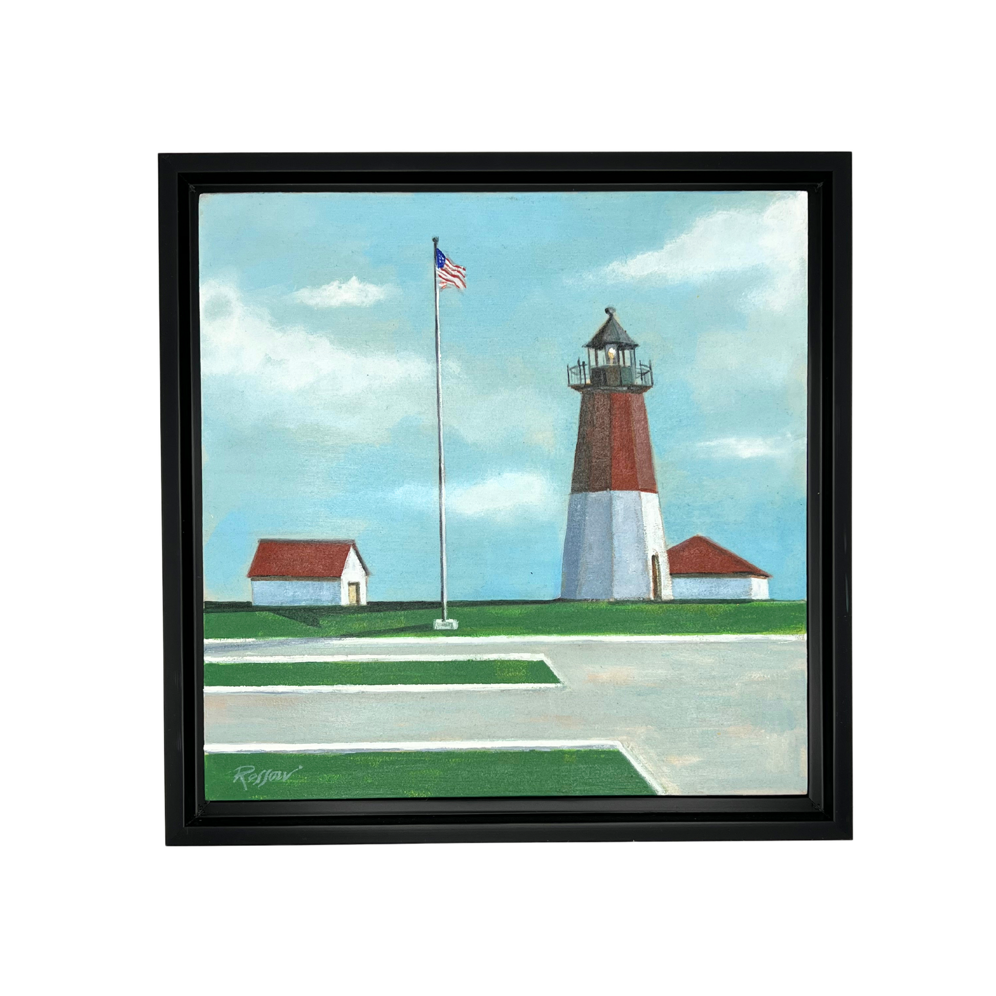 Vibrant original painting of Point Judith (Rhode Island) lighthouse by Rhode Island artist Mary Ann Rossoni. Painting is called "On a Clear Day". Professionally framed in a black floating frame. Measures 11.5" x 11.5" including frame.