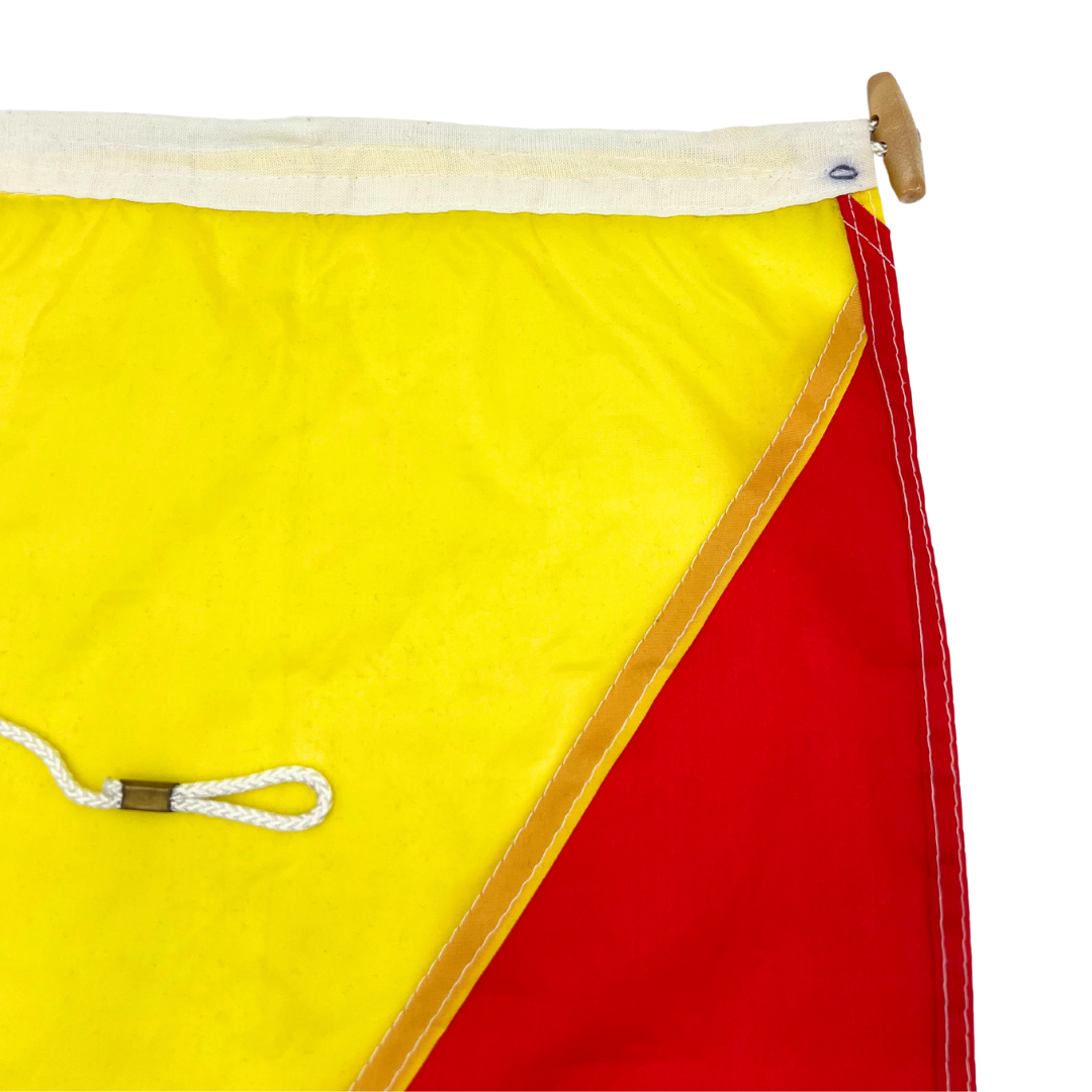 Salvaged nylon nautical signal flag form Taylor Made. Represents letter O. Faux wooden toggle. Minimal signs of wear. Approximately 18" x 12".