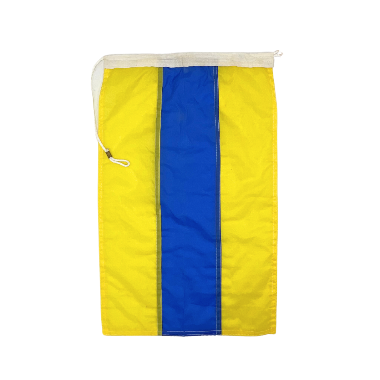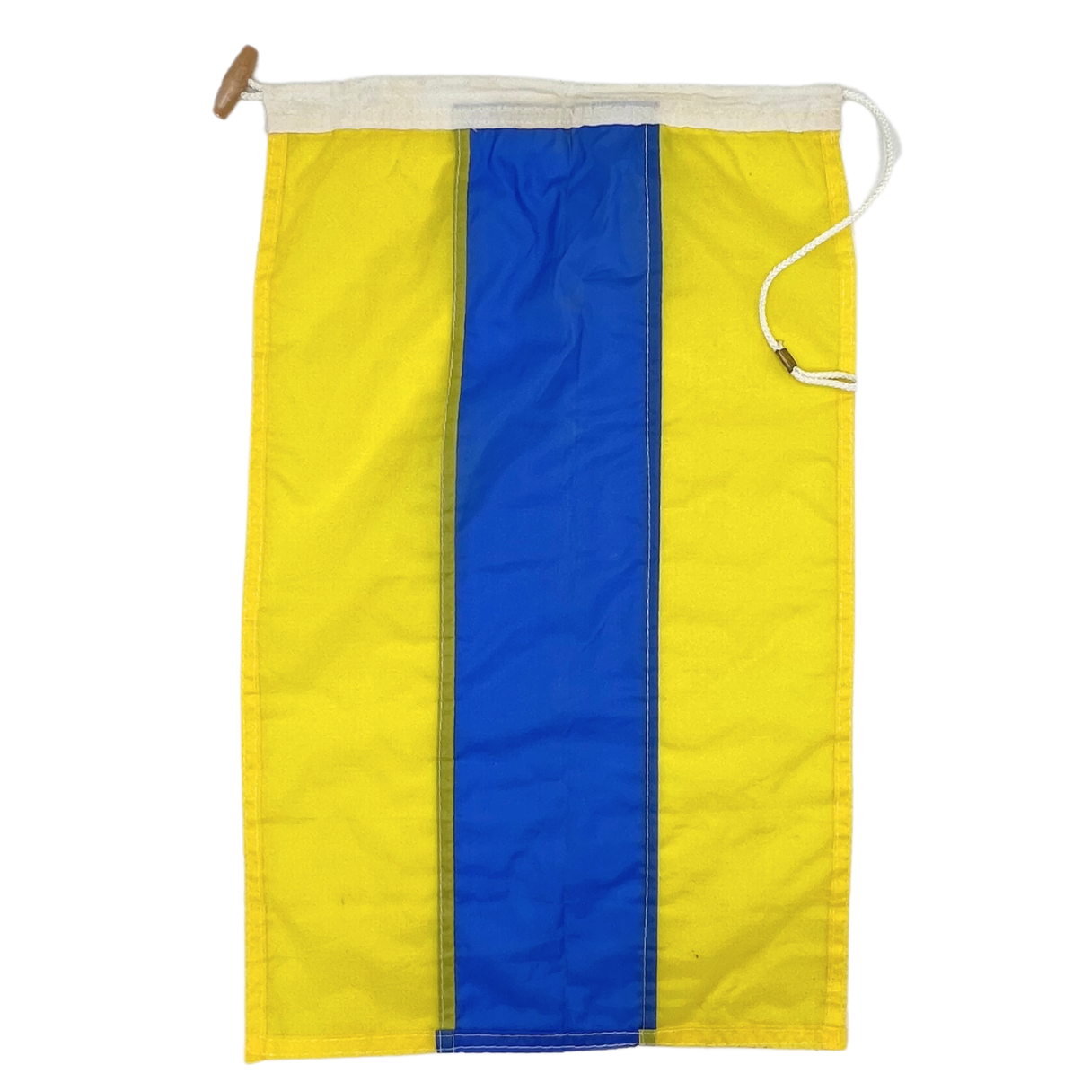Salvaged nylon nautical signal flag form Taylor Made. Represents letter D. Faux wooden toggle. Minimal signs of wear. Approximately 18" x 12".