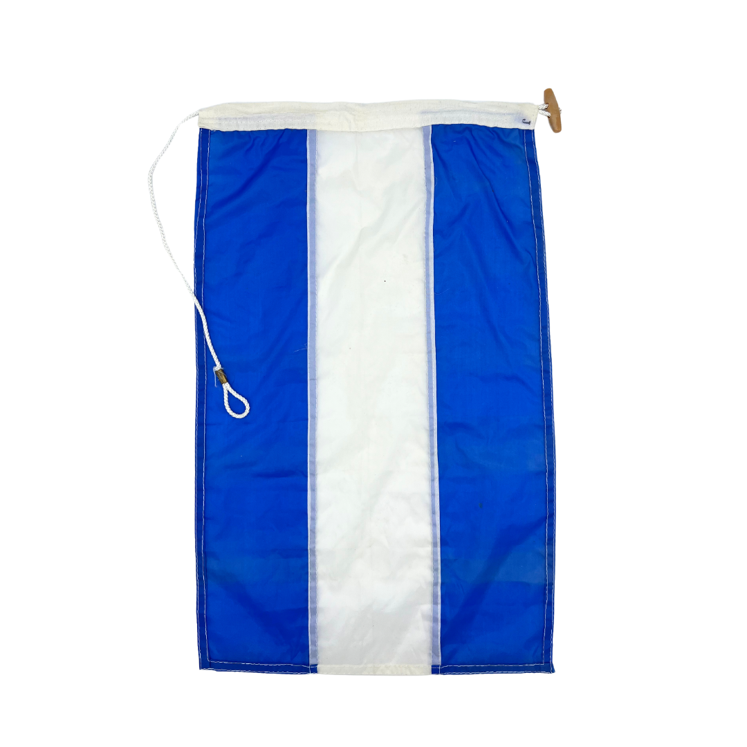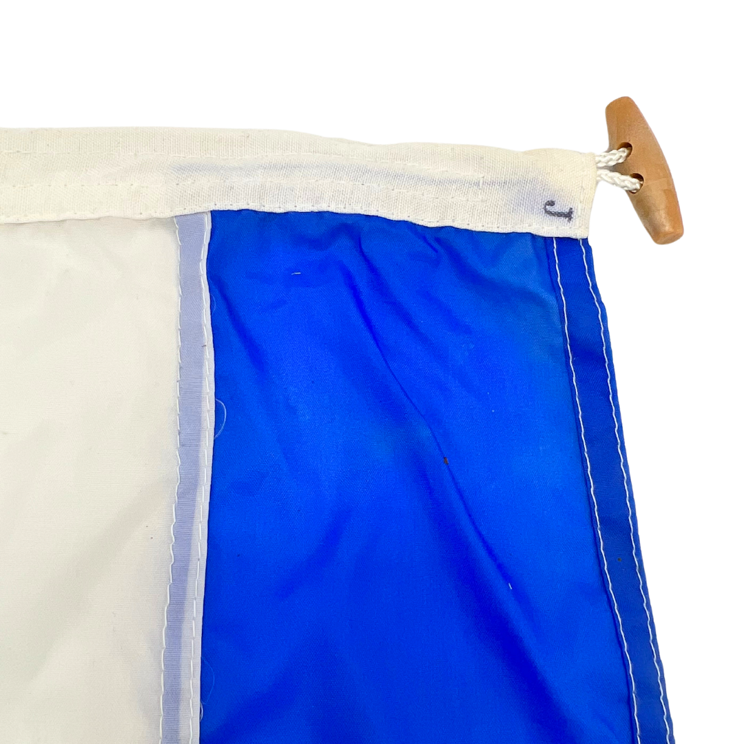 Salvaged nylon nautical signal flag form Taylor Made. Represents letter J. Faux wooden toggle. Minimal signs of wear. Approximately 18" x 12".