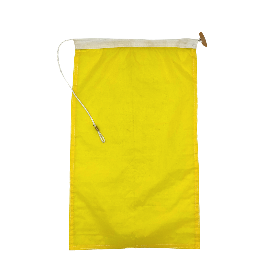 Salvaged nylon nautical signal flag form Taylor Made. Represents letter Q. Faux wooden toggle. Minimal signs of wear. Approximately 18" x 12".