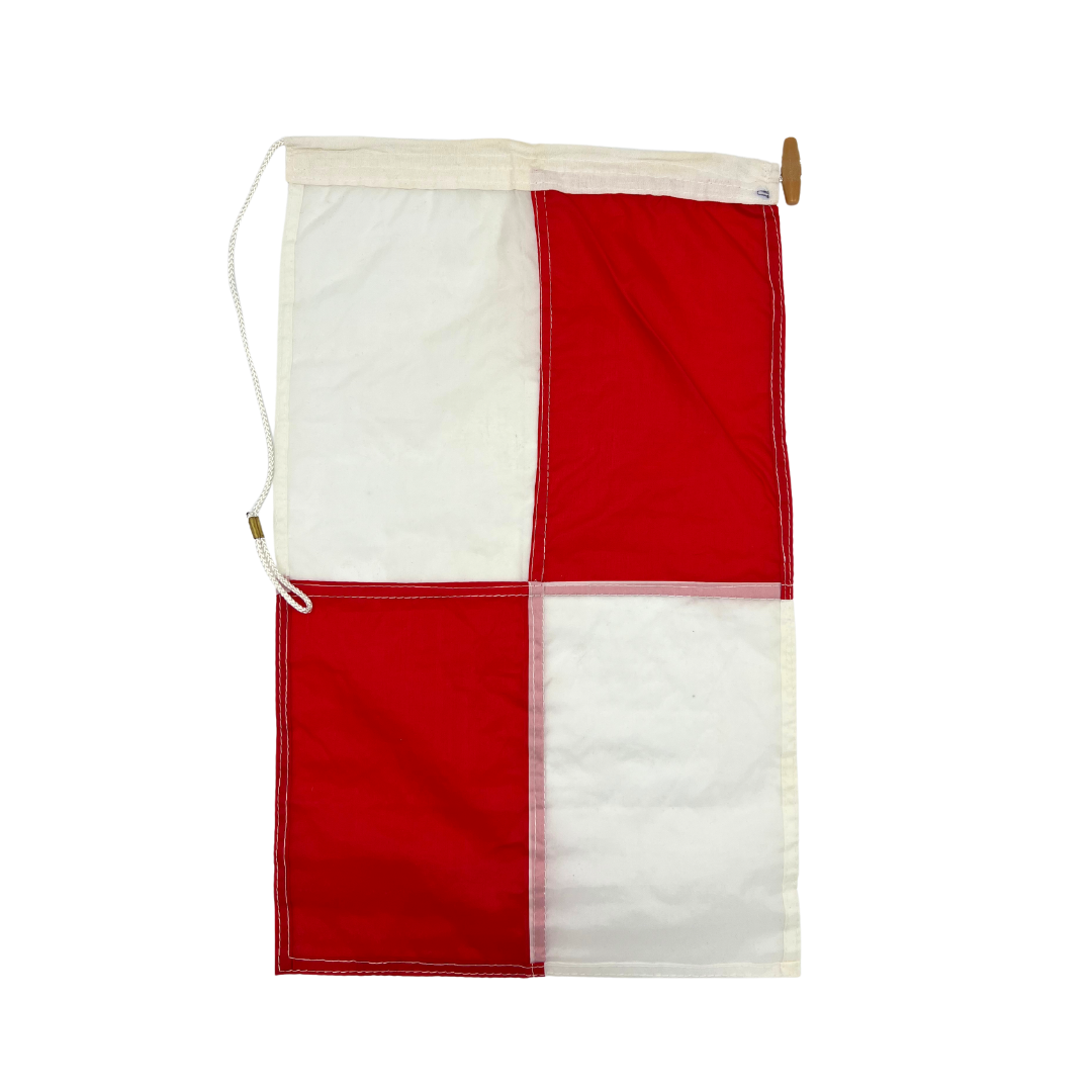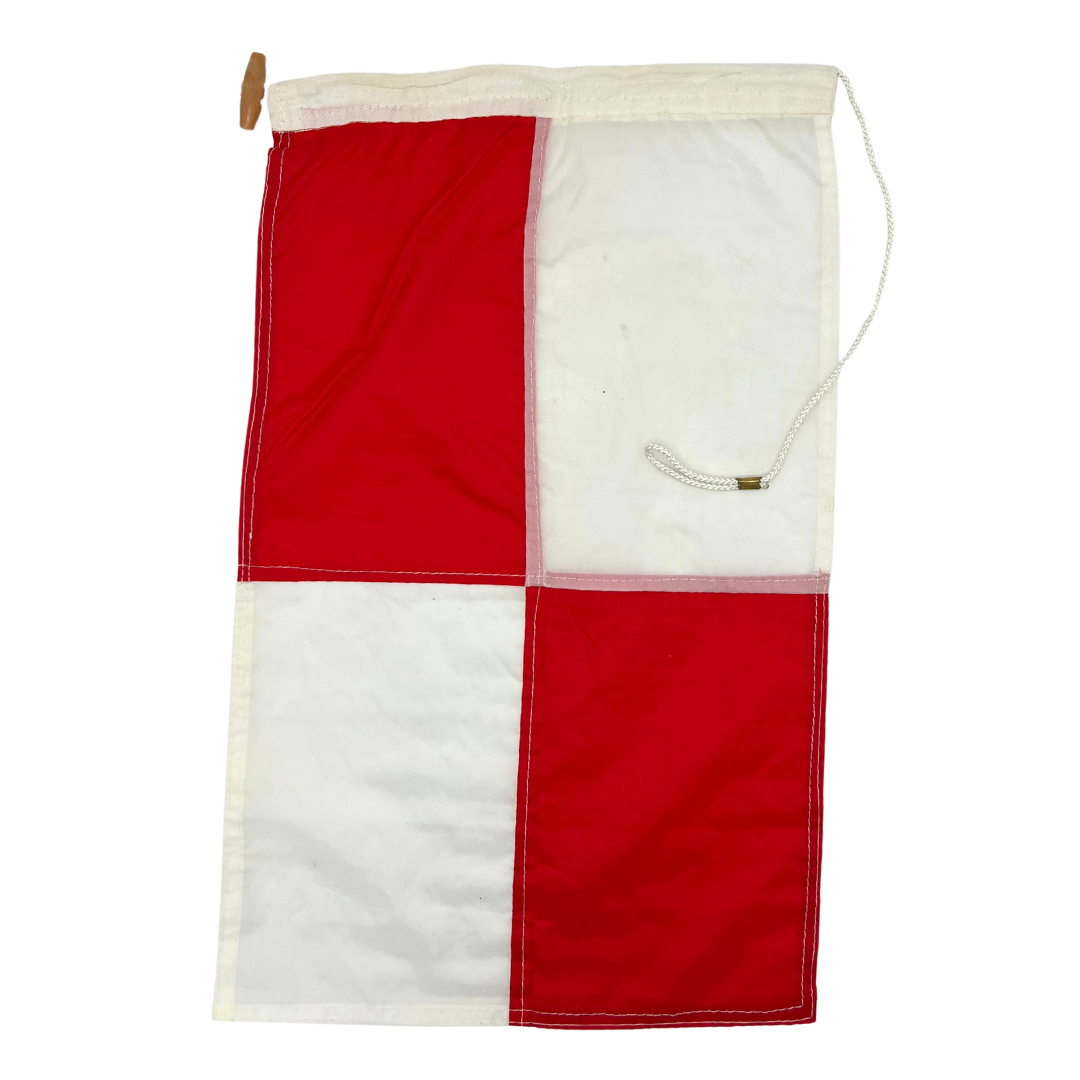 Salvaged nylon nautical signal flag form Taylor Made. Represents letter U. Faux wooden toggle. Minimal signs of wear. Approximately 18" x 12".