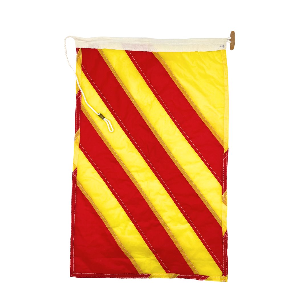Salvaged nylon nautical signal flag form Taylor Made. Represents letter Y (yankee). Faux wooden toggle. Minimal signs of wear. Approximately 18" x 12".