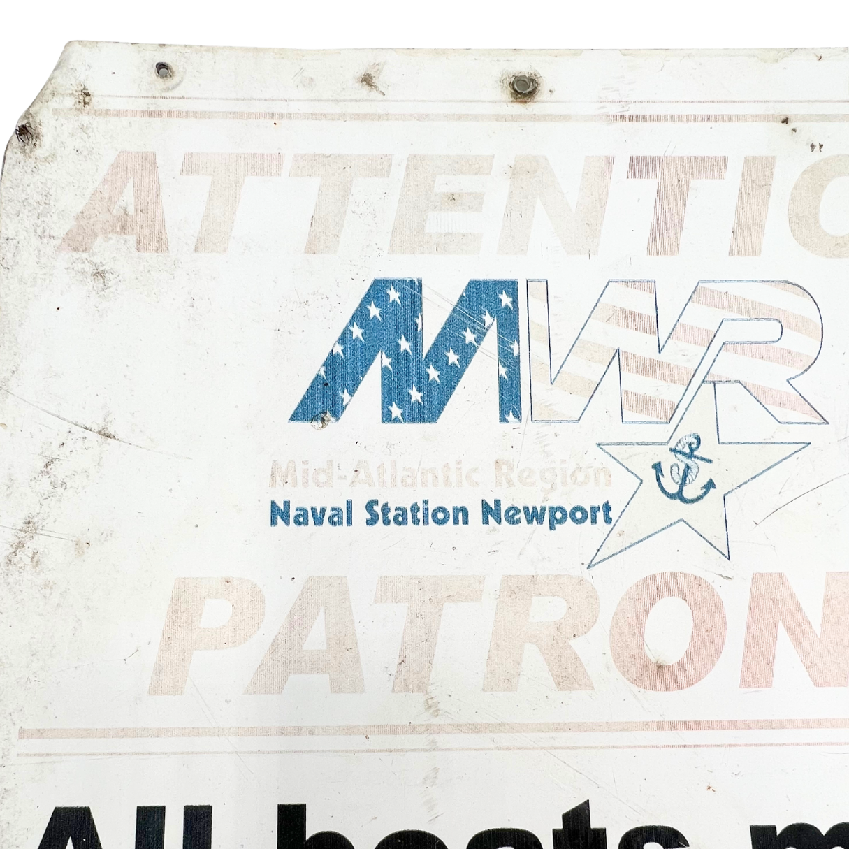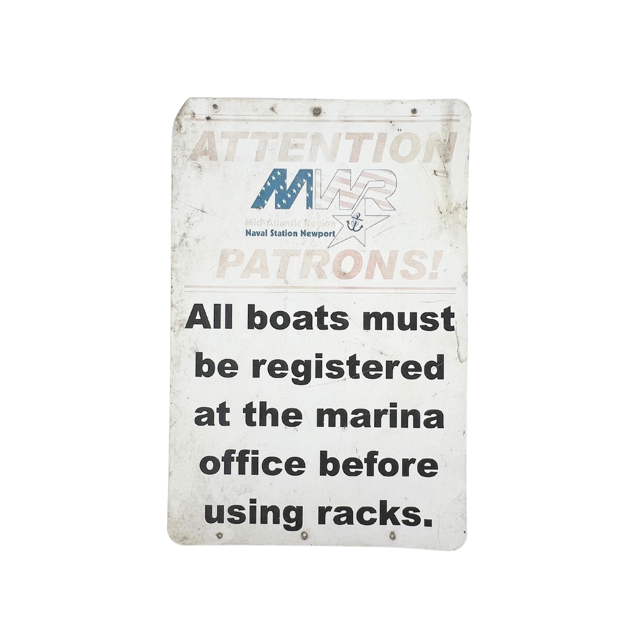 Salvaged metal sign from Naval Station Newport in Newport, RI. Reads "Attention MWR Patrons! All boats must be registered at the marina office before using racks." Weathered - faded colors and some bent edges. Fun man cave / garage decor. Measures 18" x 12".