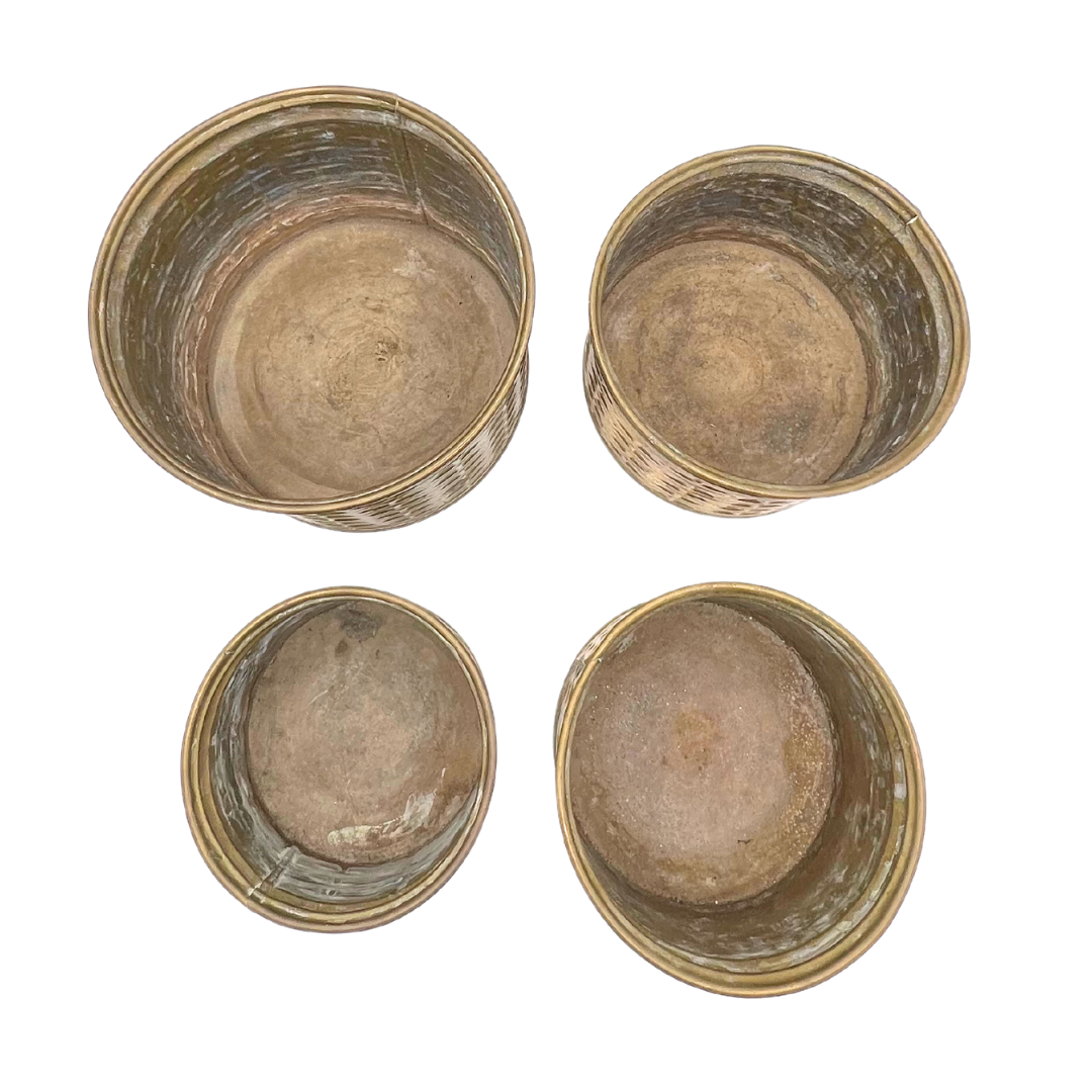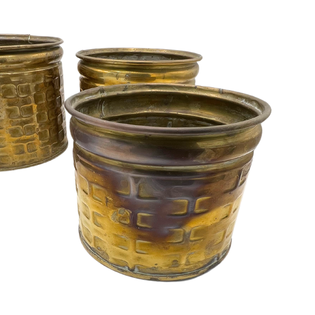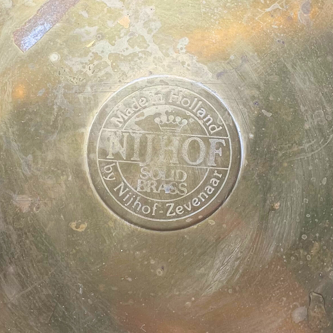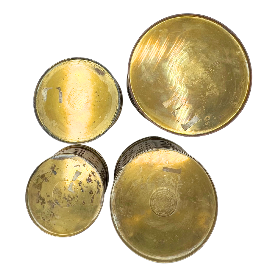 Set of 4 brass nesting pots. Made by Nijhof Zevenaar in Holland. Estimated mid-century. Wear consistent with use and age - see photos for areas of discoloration and patina. Largest pot is 7.25" in diameter and smallest pot is 5" in diameter.