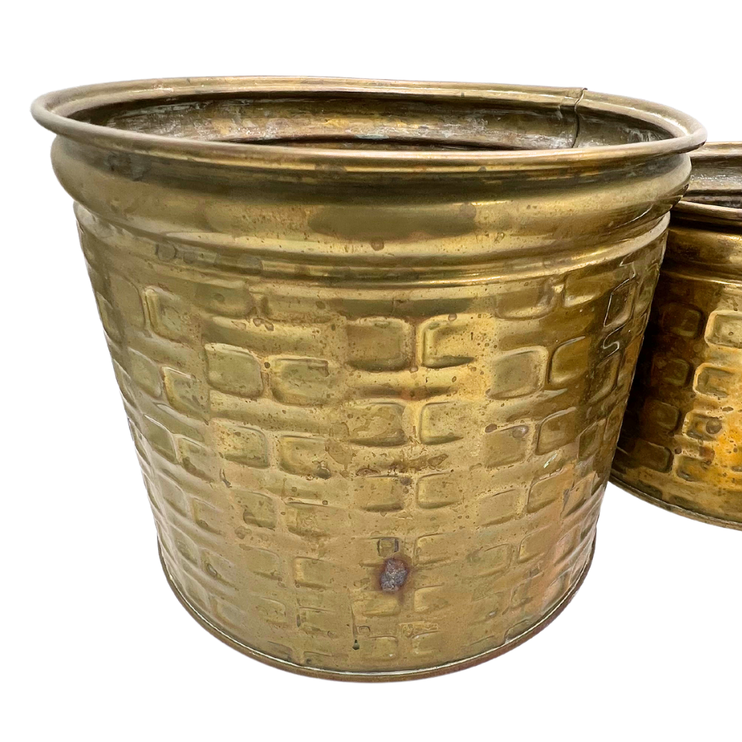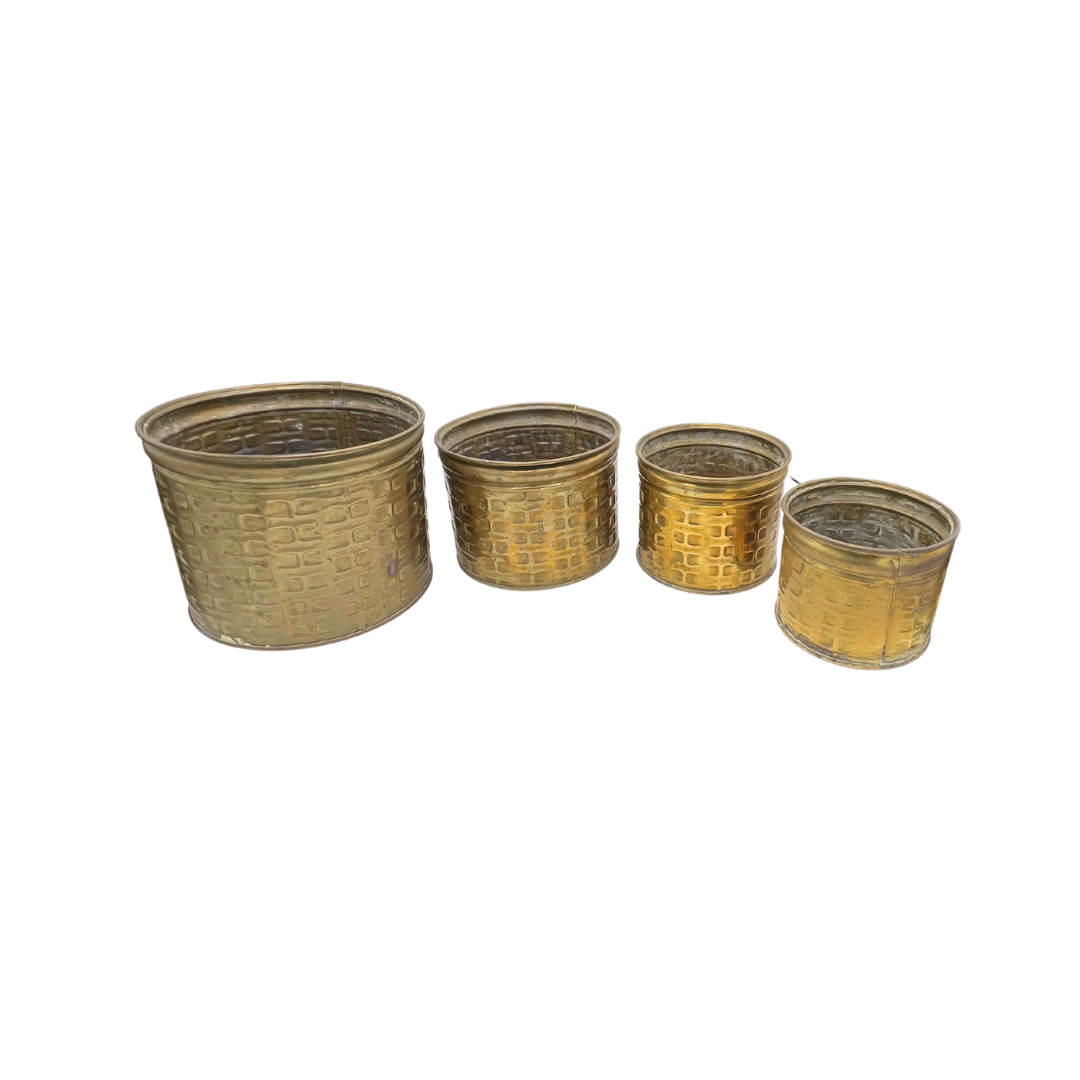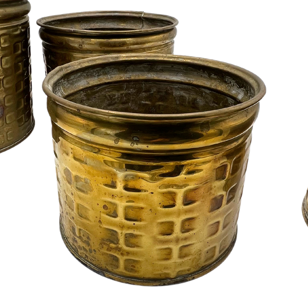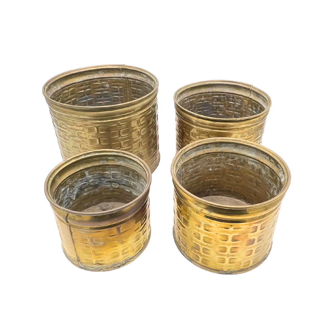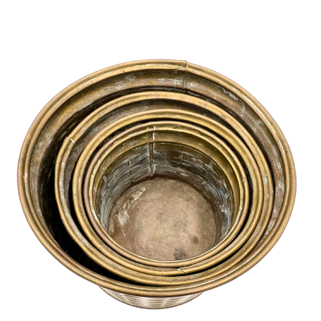 Set of 4 brass nesting pots. Made by Nijhof Zevenaar in Holland. Estimated mid-century. Wear consistent with use and age - see photos for areas of discoloration and patina. Largest pot is 7.25" in diameter and smallest pot is 5" in diameter.