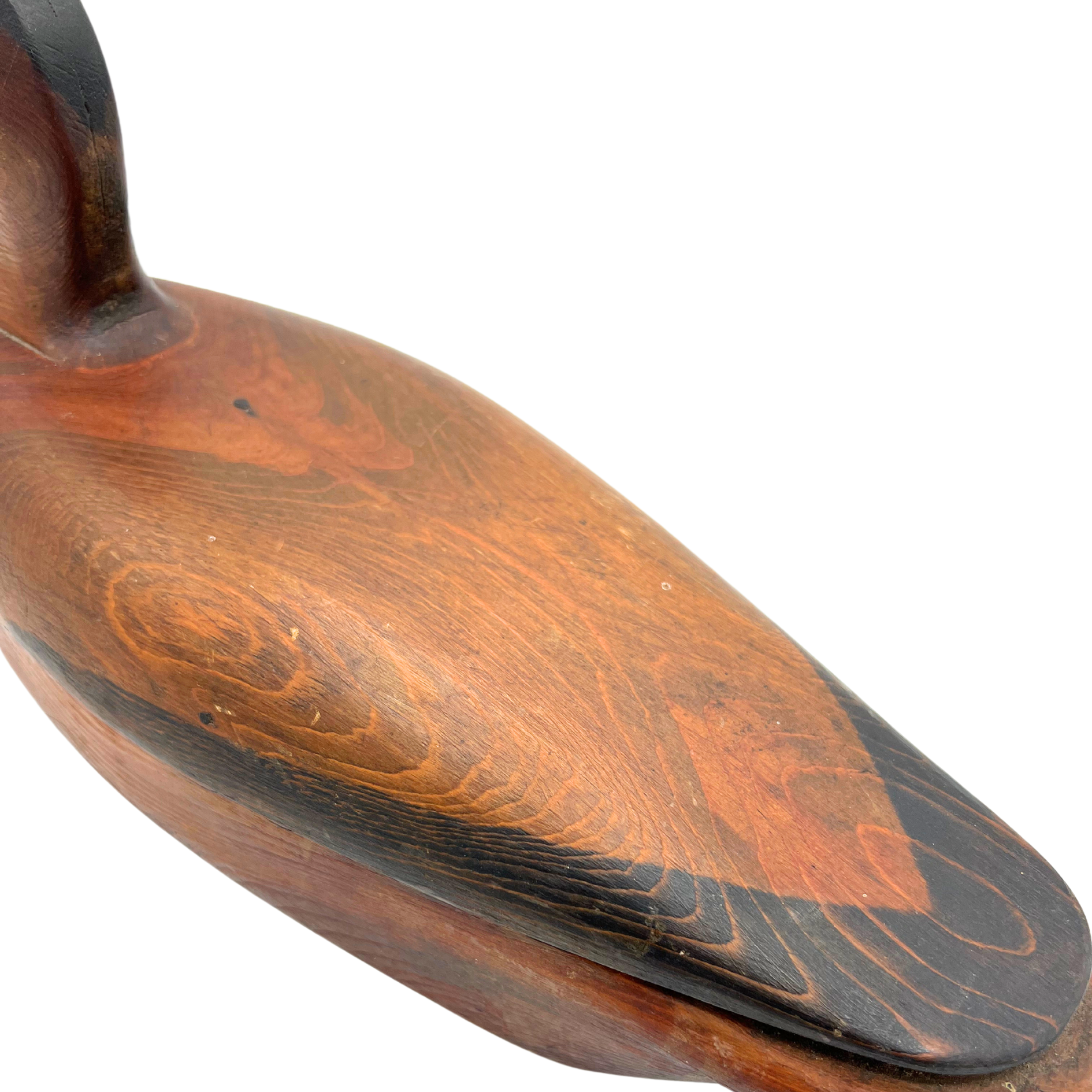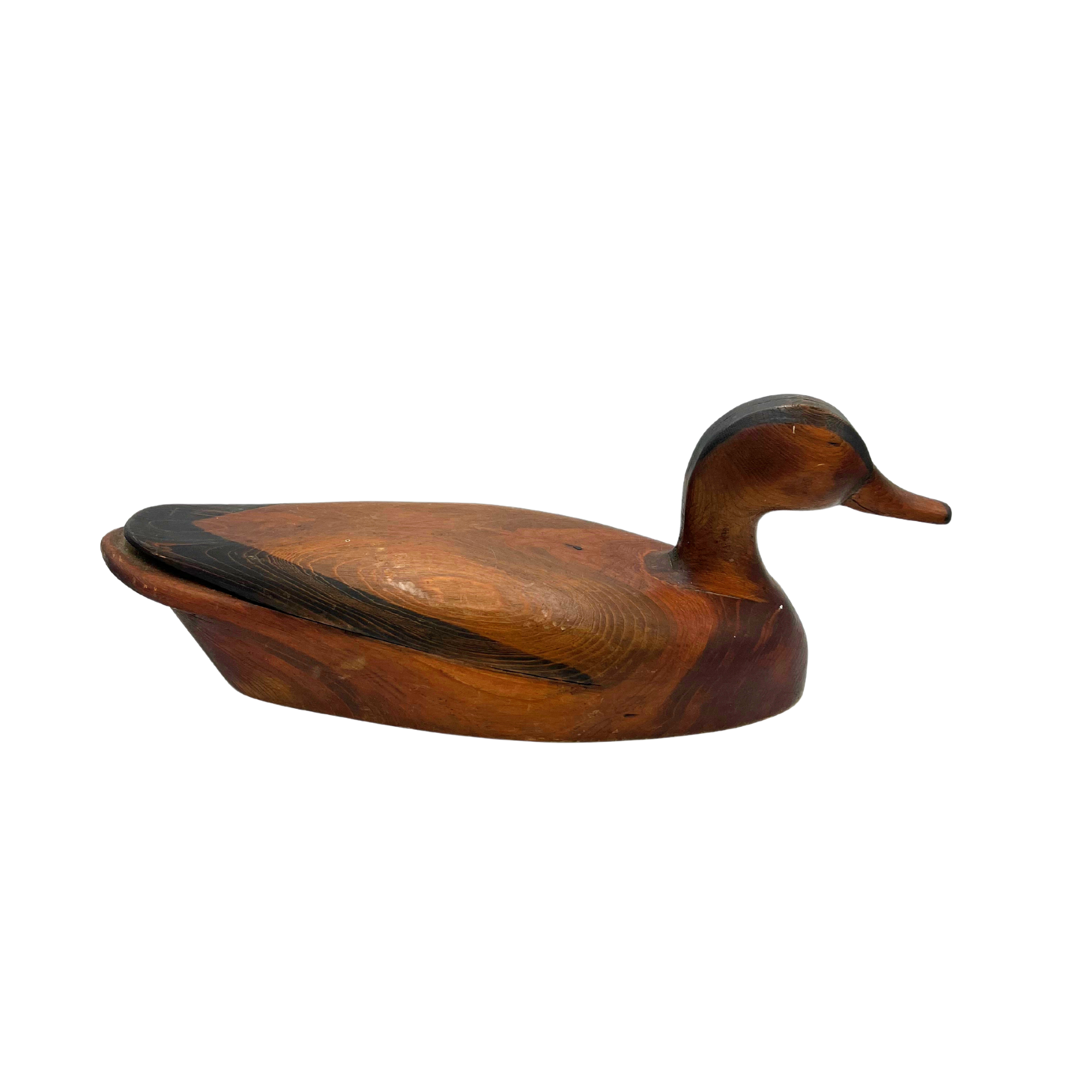 Handmade unpainted duck decoy with nice wood grain. Illegible artist signature on bottom. Estimated 1970s or early. Some marks/scratches due to age. Overall a lovely piece. 17" across.