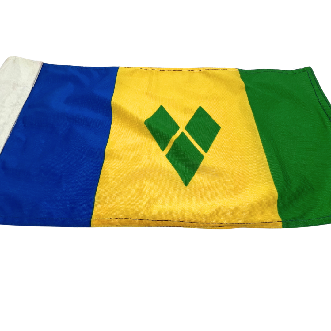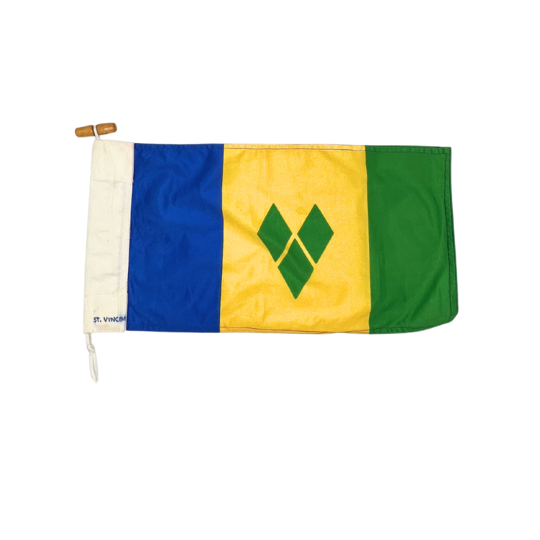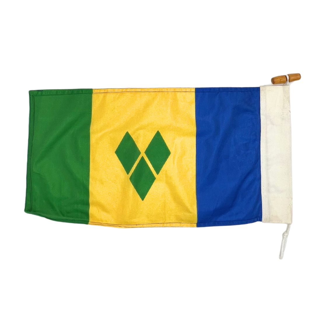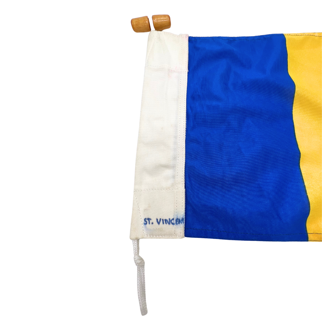 Small St. Vincent Grenadines courtesy flag. Nylon flag with cotton edge and wooden toggle. Hand-written note on flag to note it as St. Vincent. Minimal signs of wear. Approximately 18" x 9.5".
