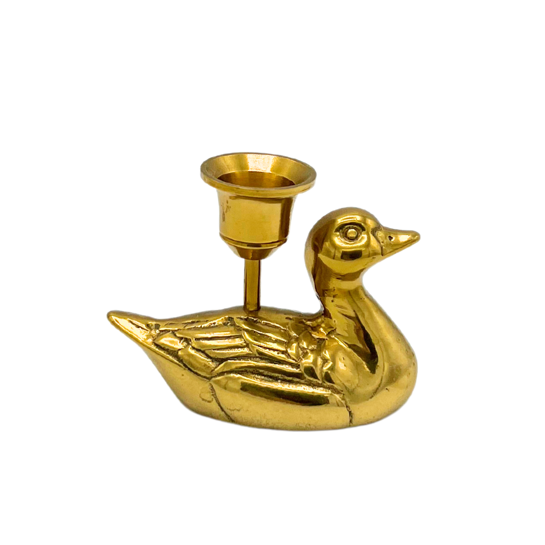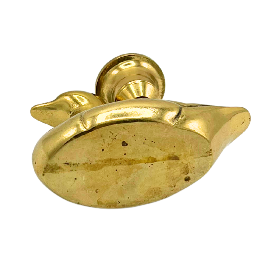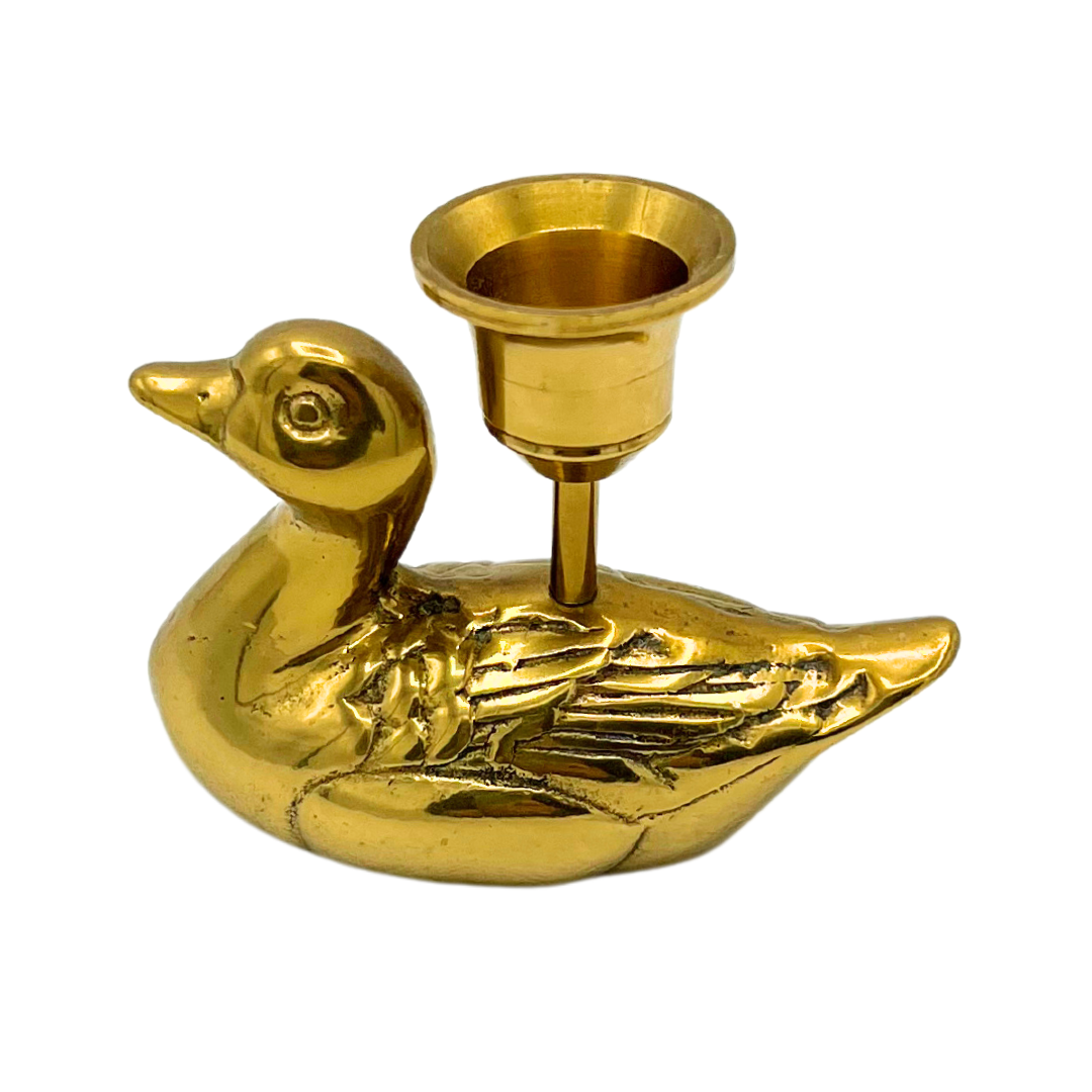 Small vintage brass duck candle holder for a narrow candle. Good vintage condition. Measures 3" wide x 2" tall.