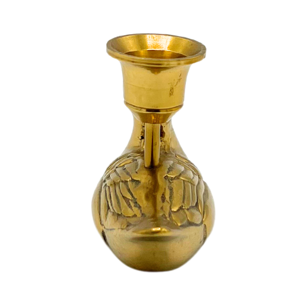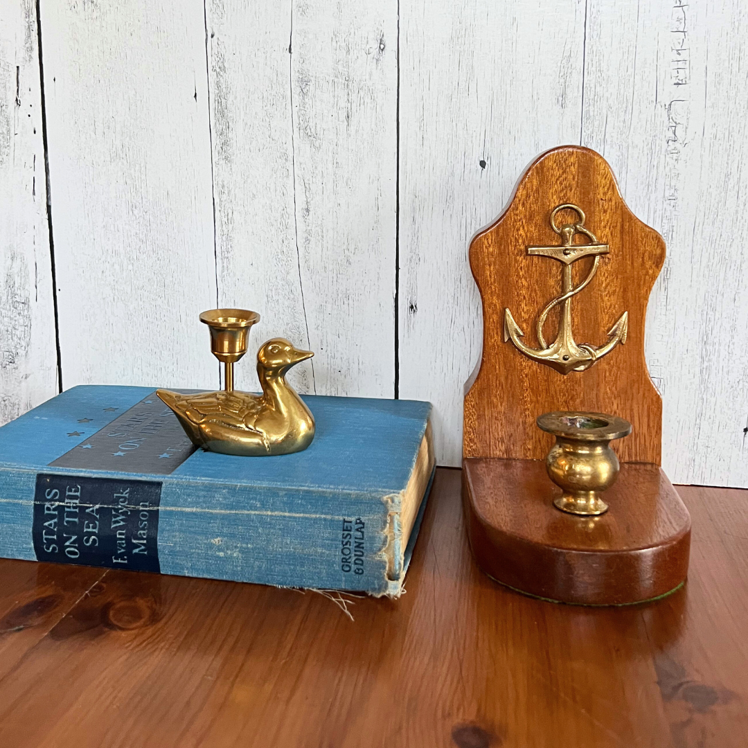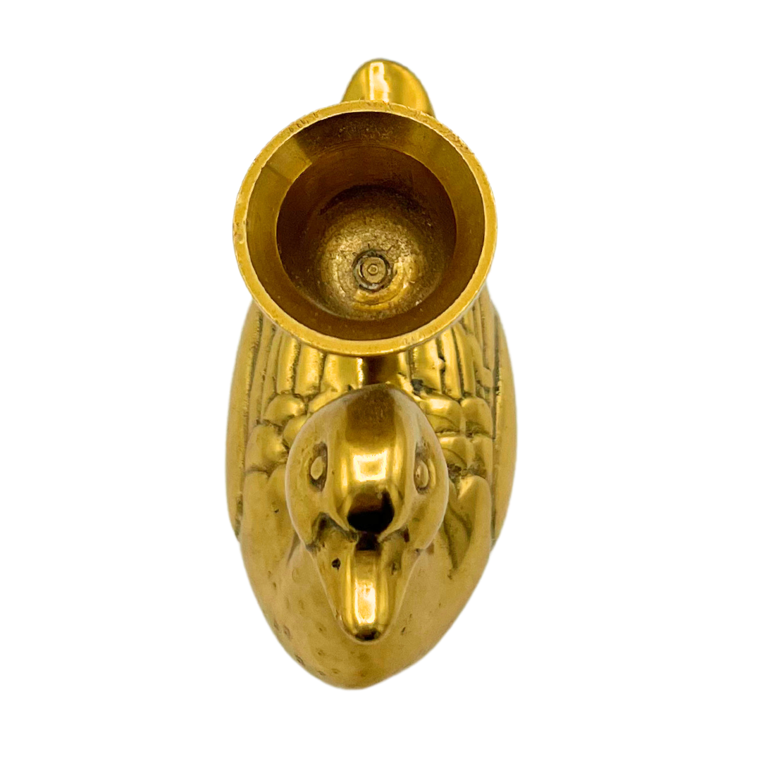 Small vintage brass duck candle holder for a narrow candle. Good vintage condition. Measures 3" wide x 2" tall.