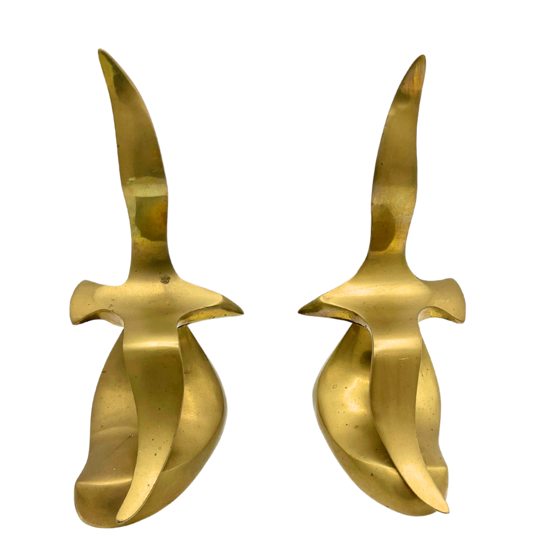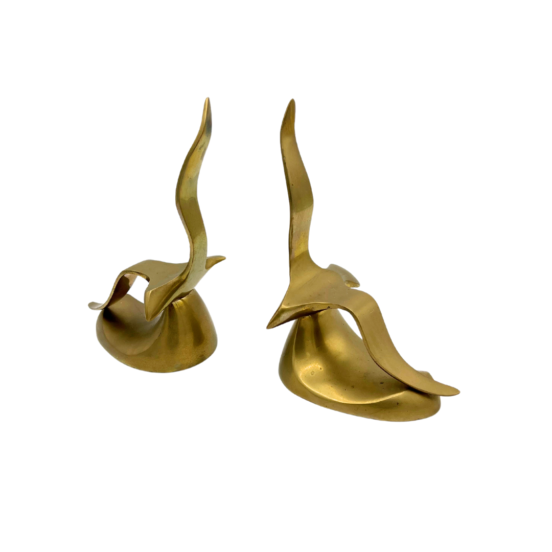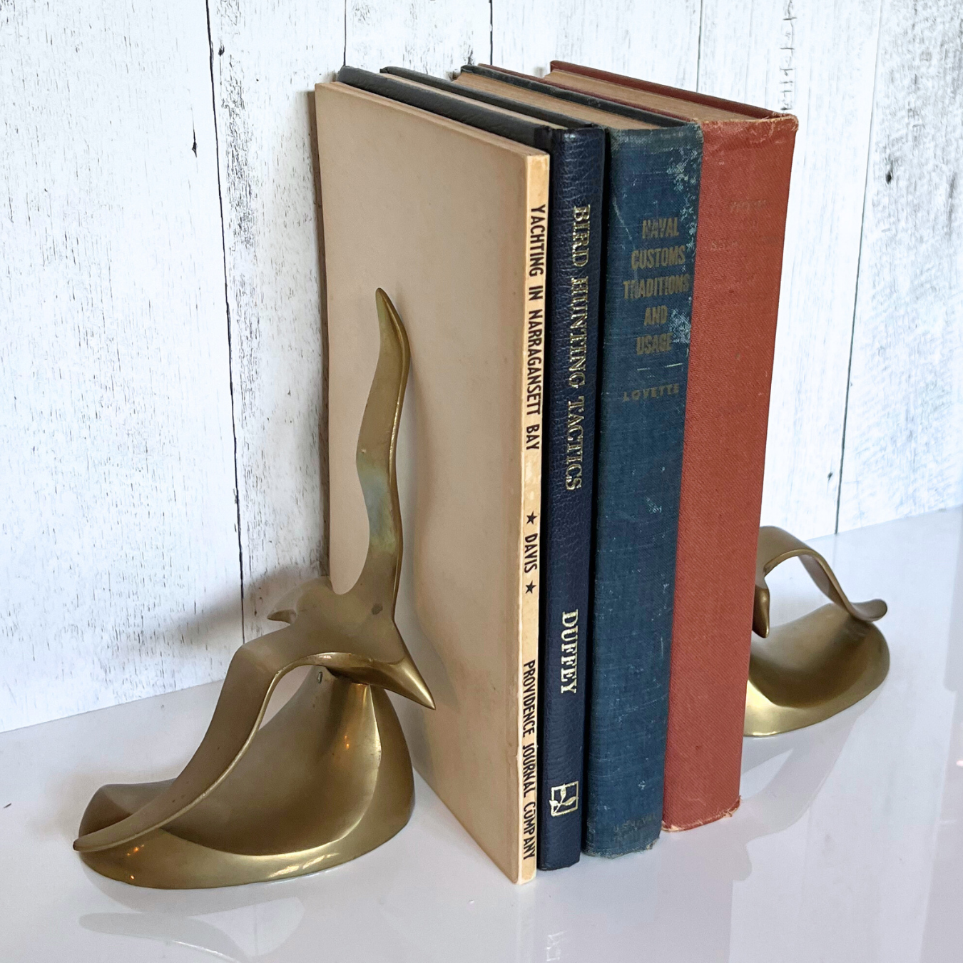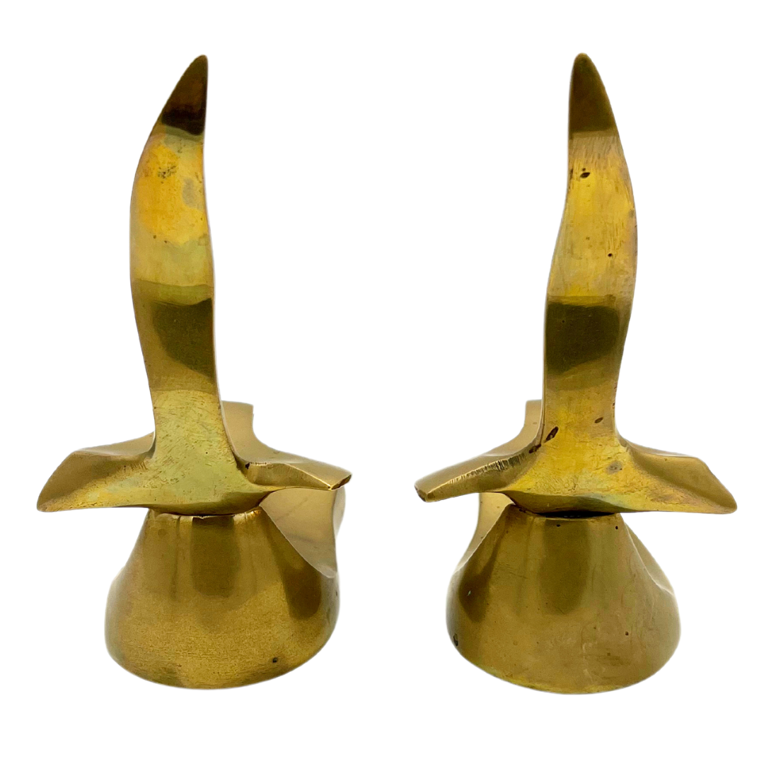 Pair of vintage brass gull bookends. Estimated 1970s. Good vintage condition, slight patina. Each gull stands 6.75" tall.