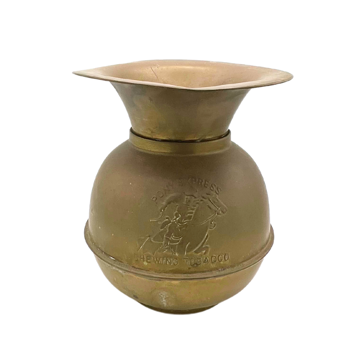 Vintage brass spittoon. Embossed with Pony Express. Slightly warped with some wear/patina. Estimated mid-century. Approximately 10.5" tall x 9.5" wide.