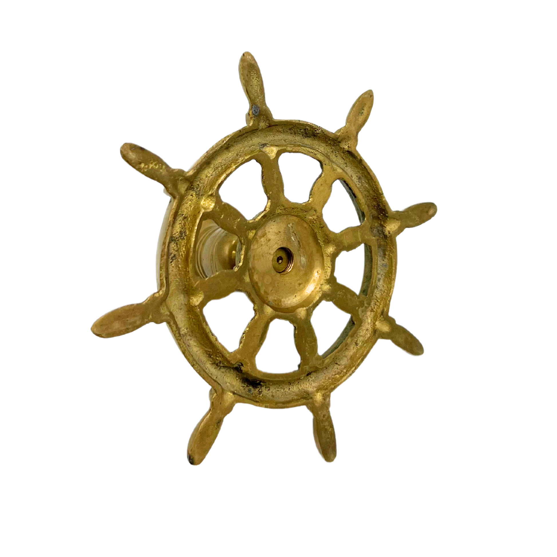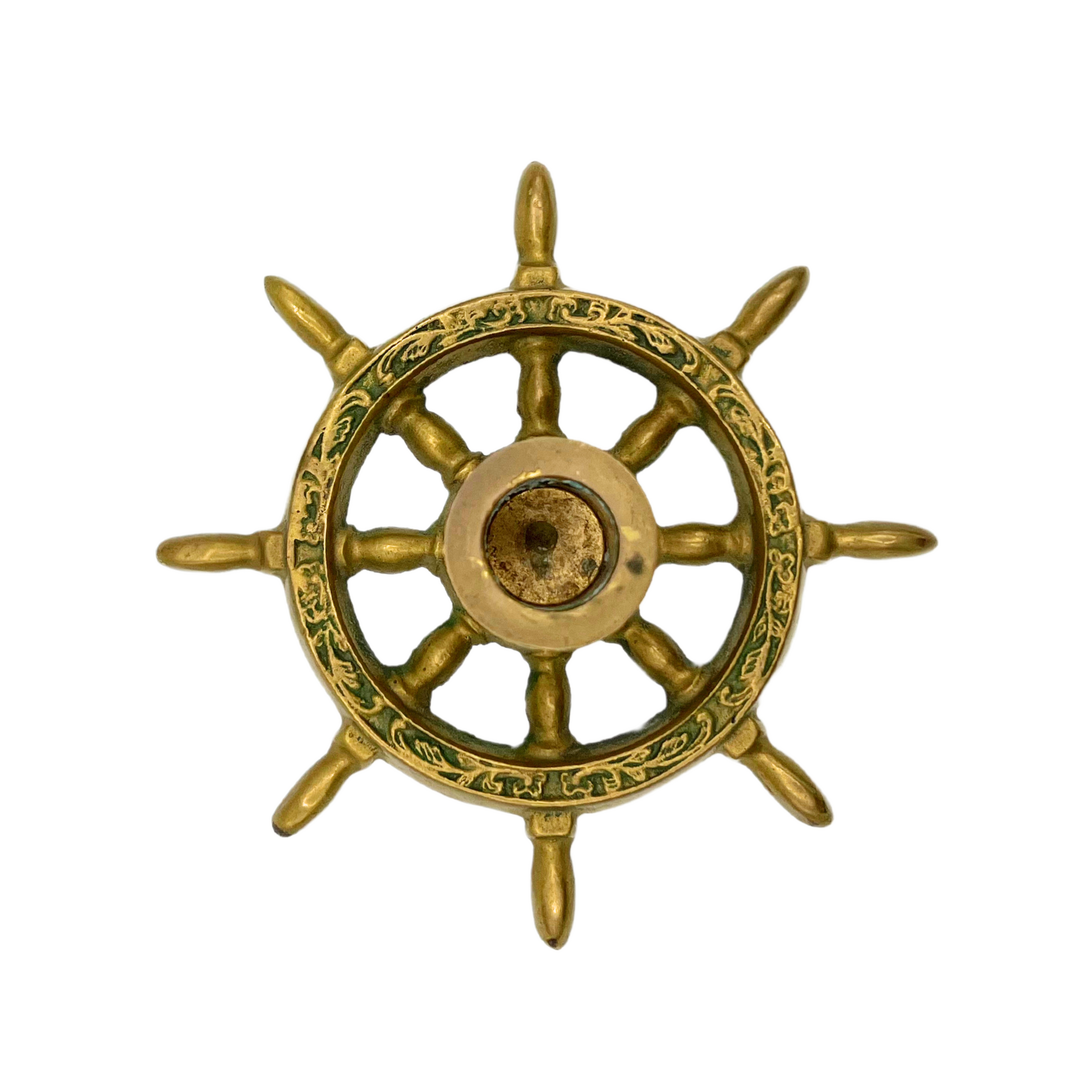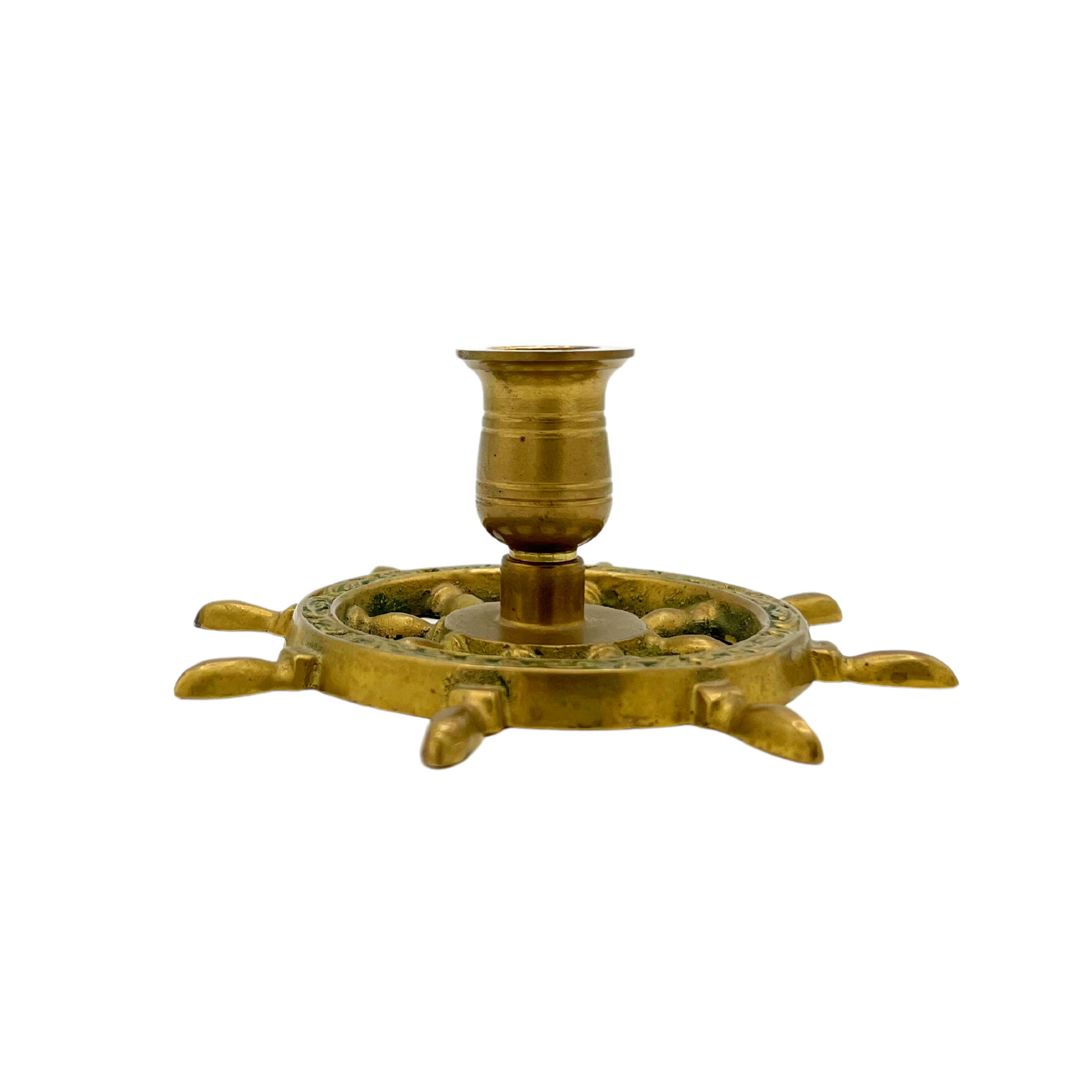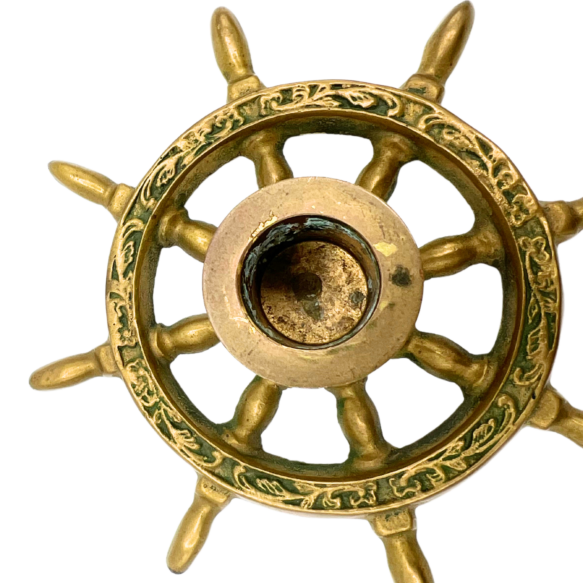 Vintage brass candlestick in a ships wheel design. Some wear due to use. 5.75" in diameter.