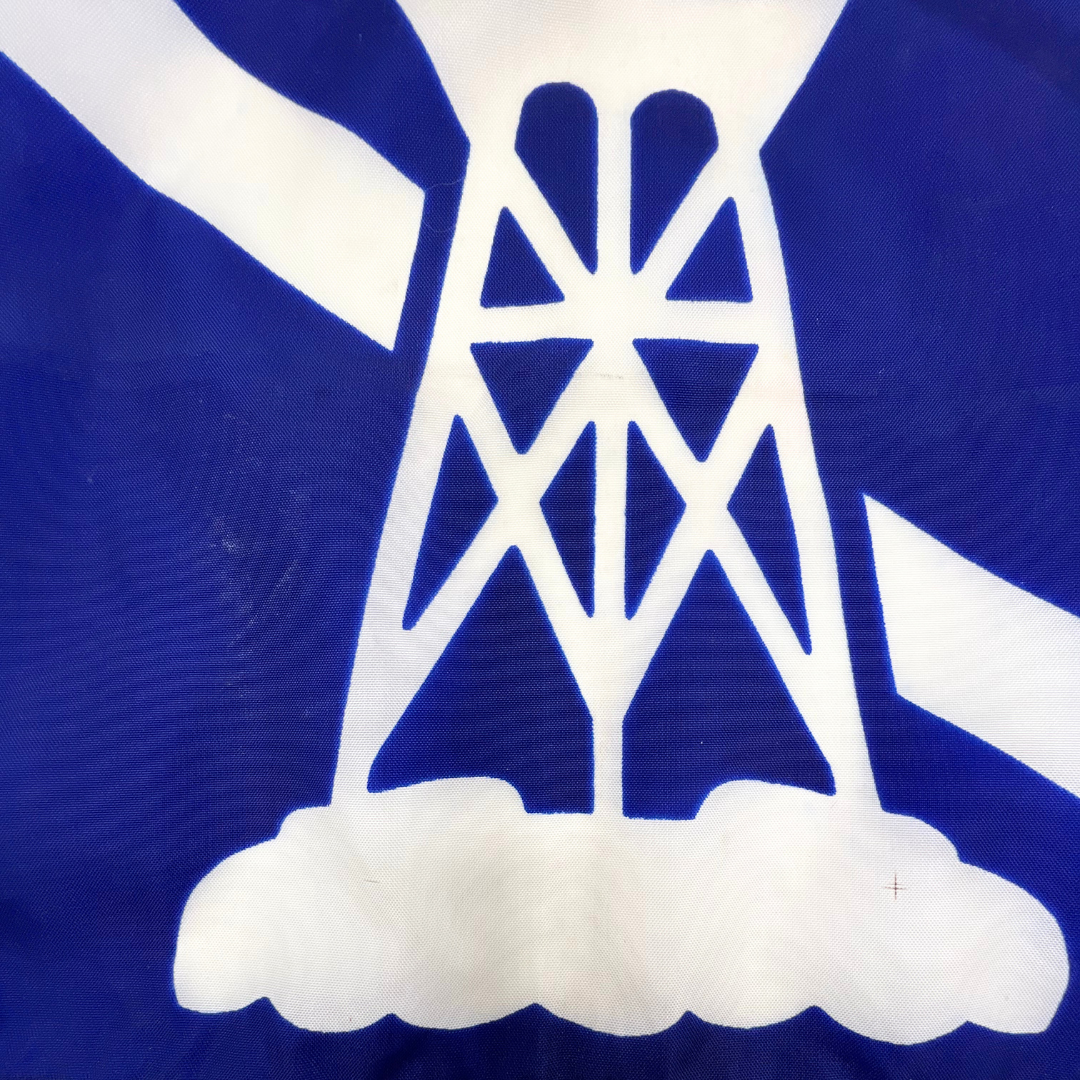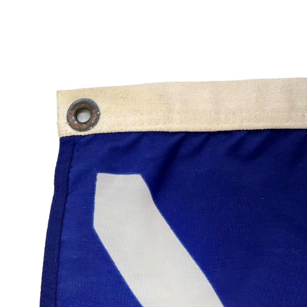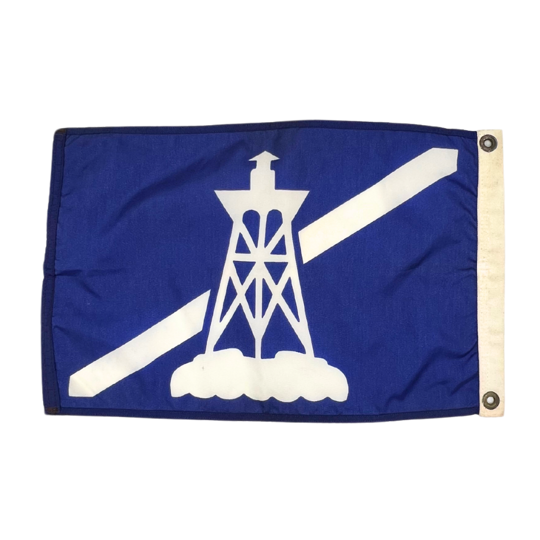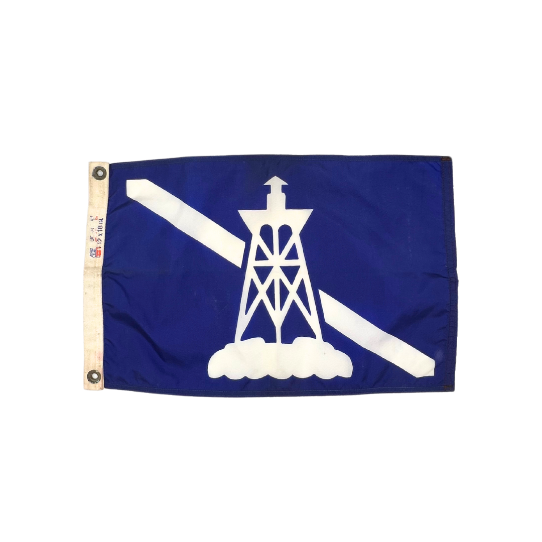 Vintage nylon burgee/flag with unique buoy motif. Association unknown. Blue and white coloring. Brass rivets with nice patina. Slight weathering, overall good vintage condition. Approximately 18.5" long.