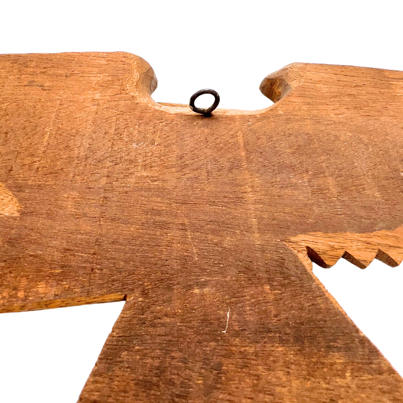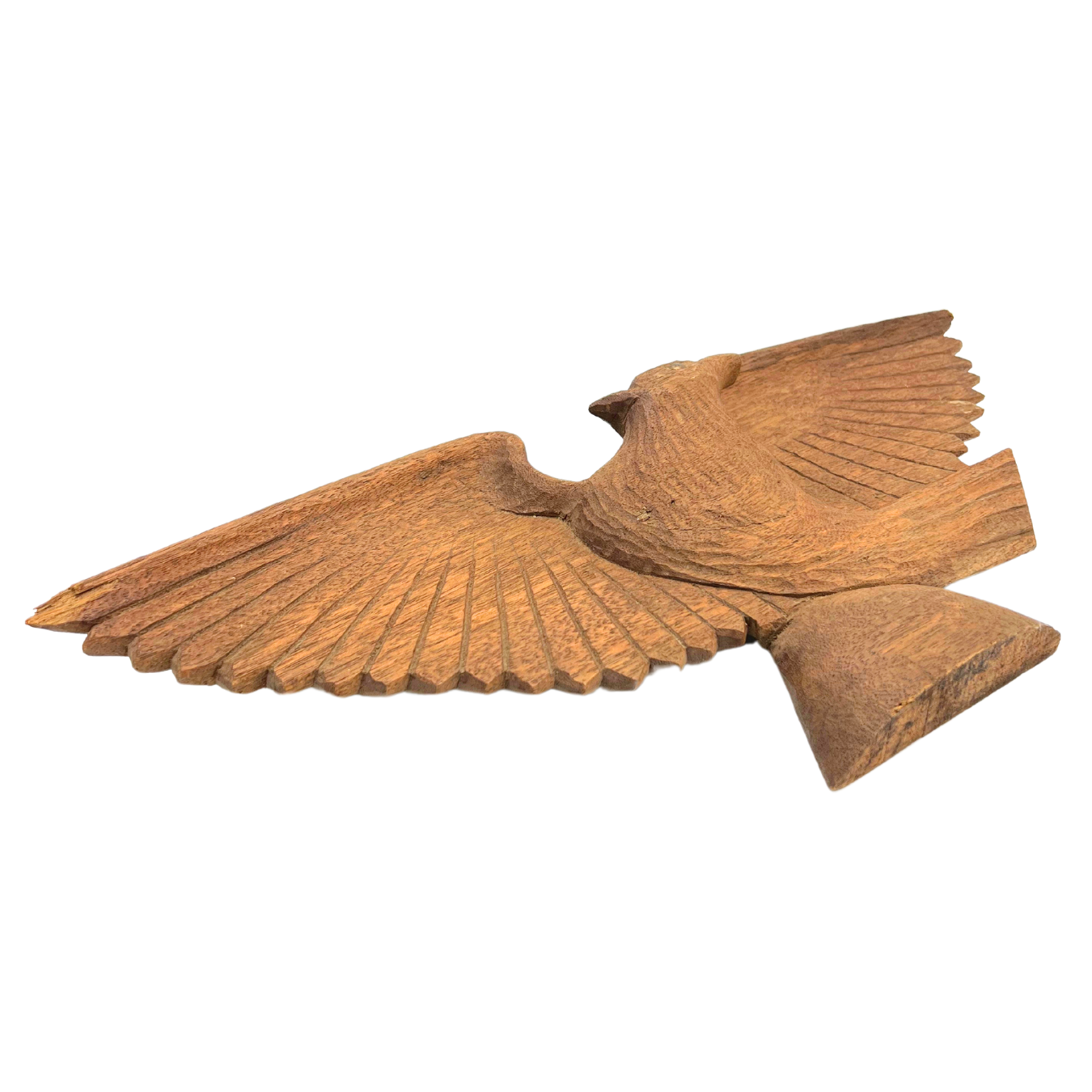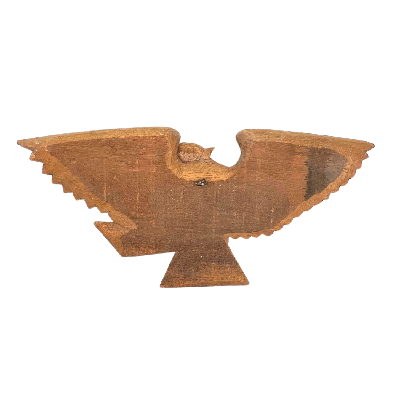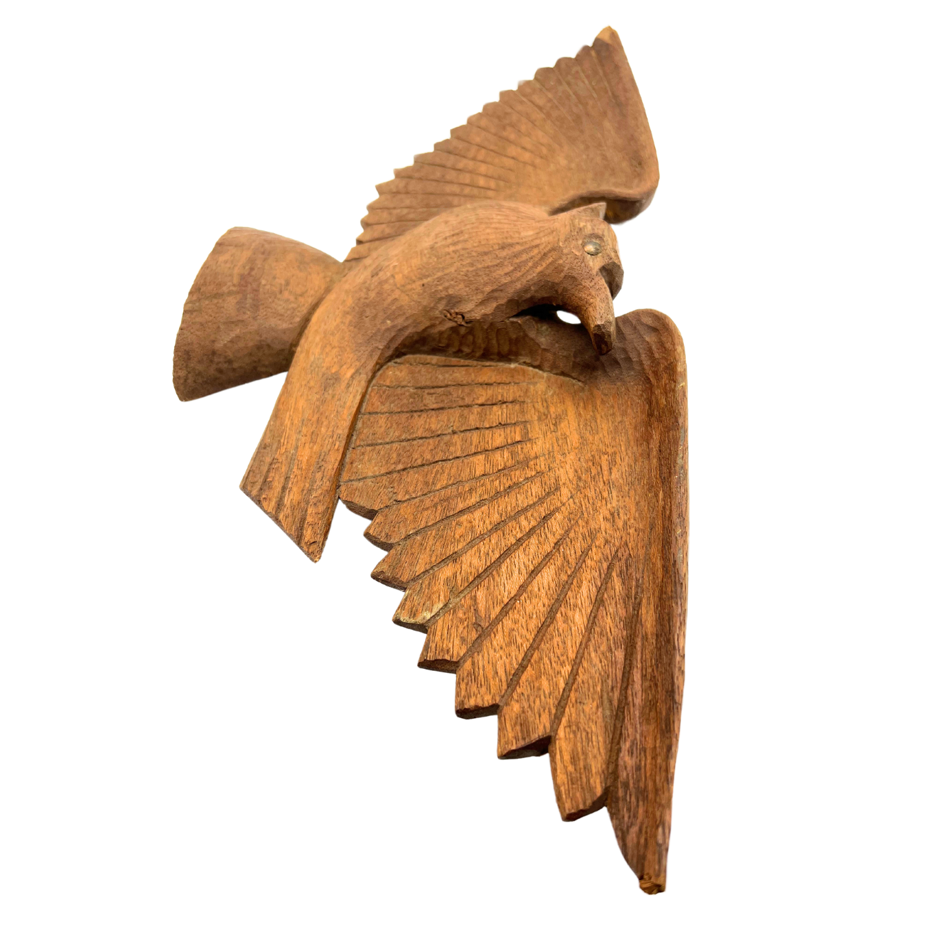 Vintage hand-carved wooden eagle wall hanging. Natural wood color. Hook on back for hanging. Metal used for eye. Tips of wings have a little bit of damage - see photos. Estimated 1960s. Overall beautiful piece. Measures 20.5" wide.