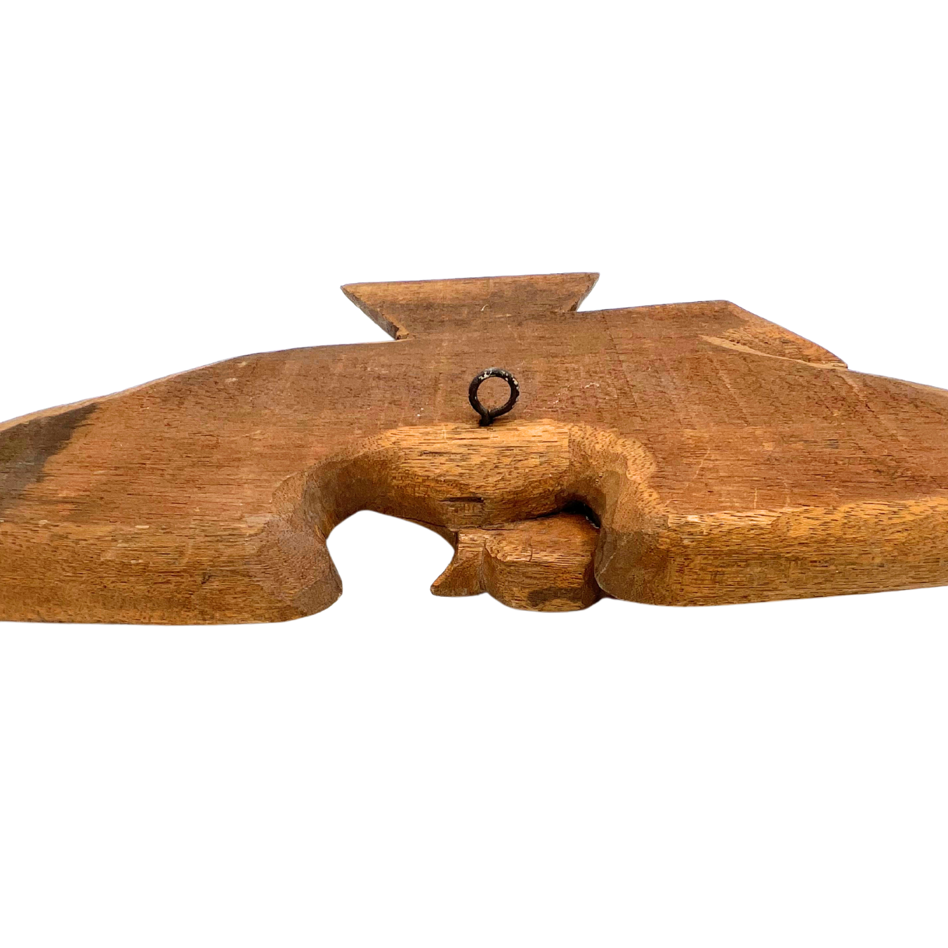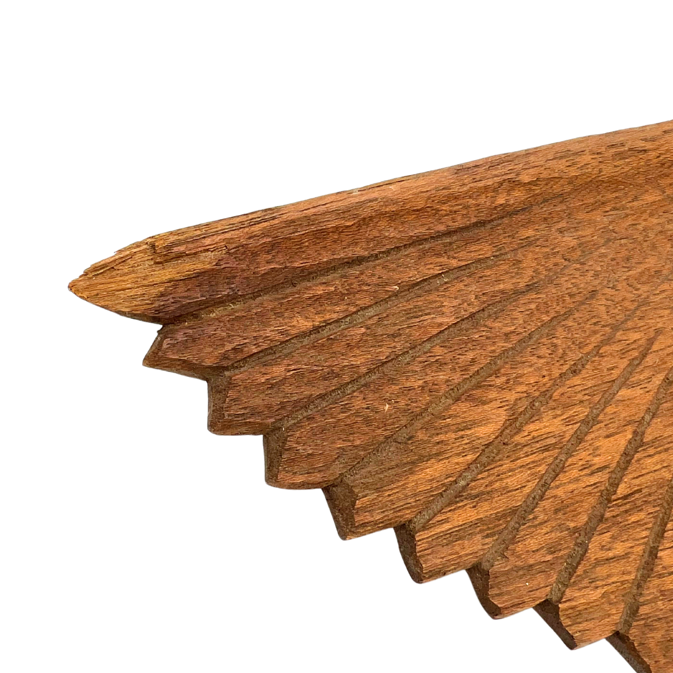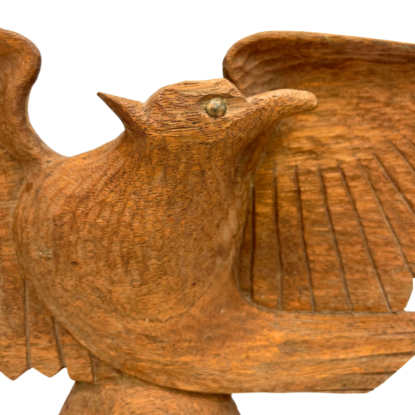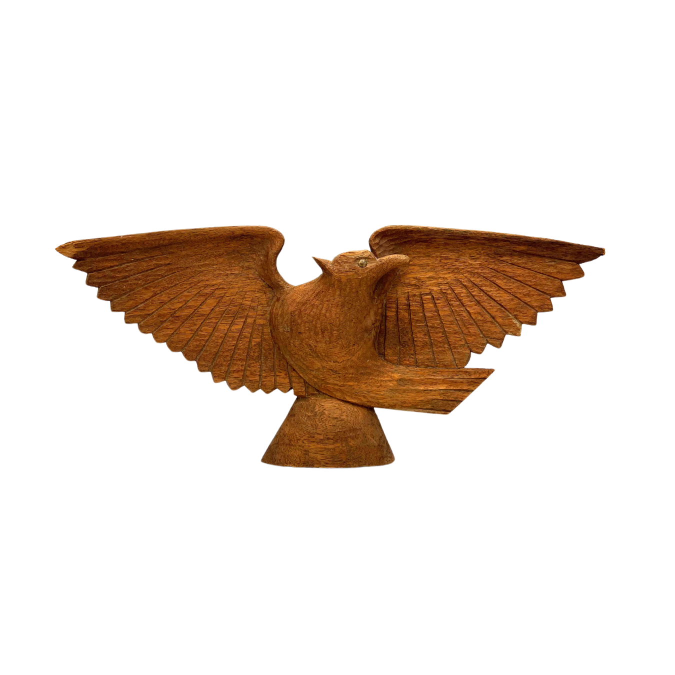 Vintage hand-carved wooden eagle wall hanging. Natural wood color. Hook on back for hanging. Metal used for eye. Tips of wings have a little bit of damage - see photos. Estimated 1960s. Overall beautiful piece. Measures 20.5" wide.